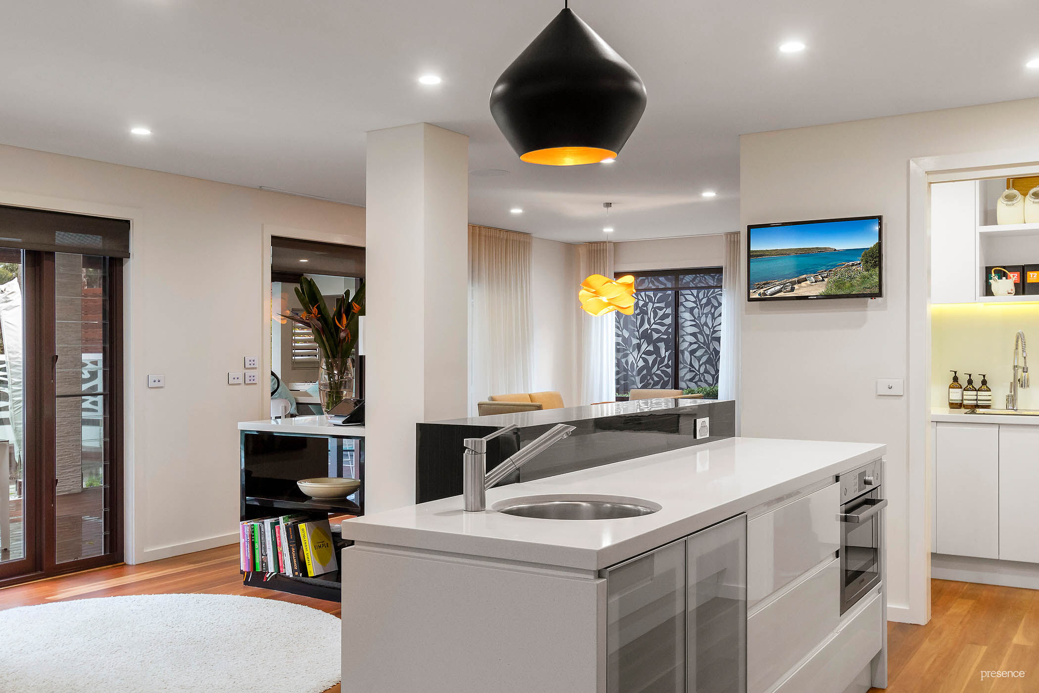Designed with flexibility of living and privacy in mind, three generous bedrooms positioned upstairs offer leafy outlooks with pool views and lake glimpses, while a grand master bedroom and study enjoy their own private spaces on the entry level. On the lower ground floor you’ll be impressed with the luxury finishes of the cabinetry providing separation of living and dining spaces while walls of glass sliding doors offer views to the outdoors. All your entertaining needs are met with a gourmet kitchen and butler’s pantry inside complementing a fully equipped outdoor kitchen, all boasting top quality appliances and smart layouts. Outside an oasis awaits with a crystal-clear pool surrounded by a stylish outdoor living area, covered timber deck and an eye-catching living space boasting bi-fold doors to bring the outside in.