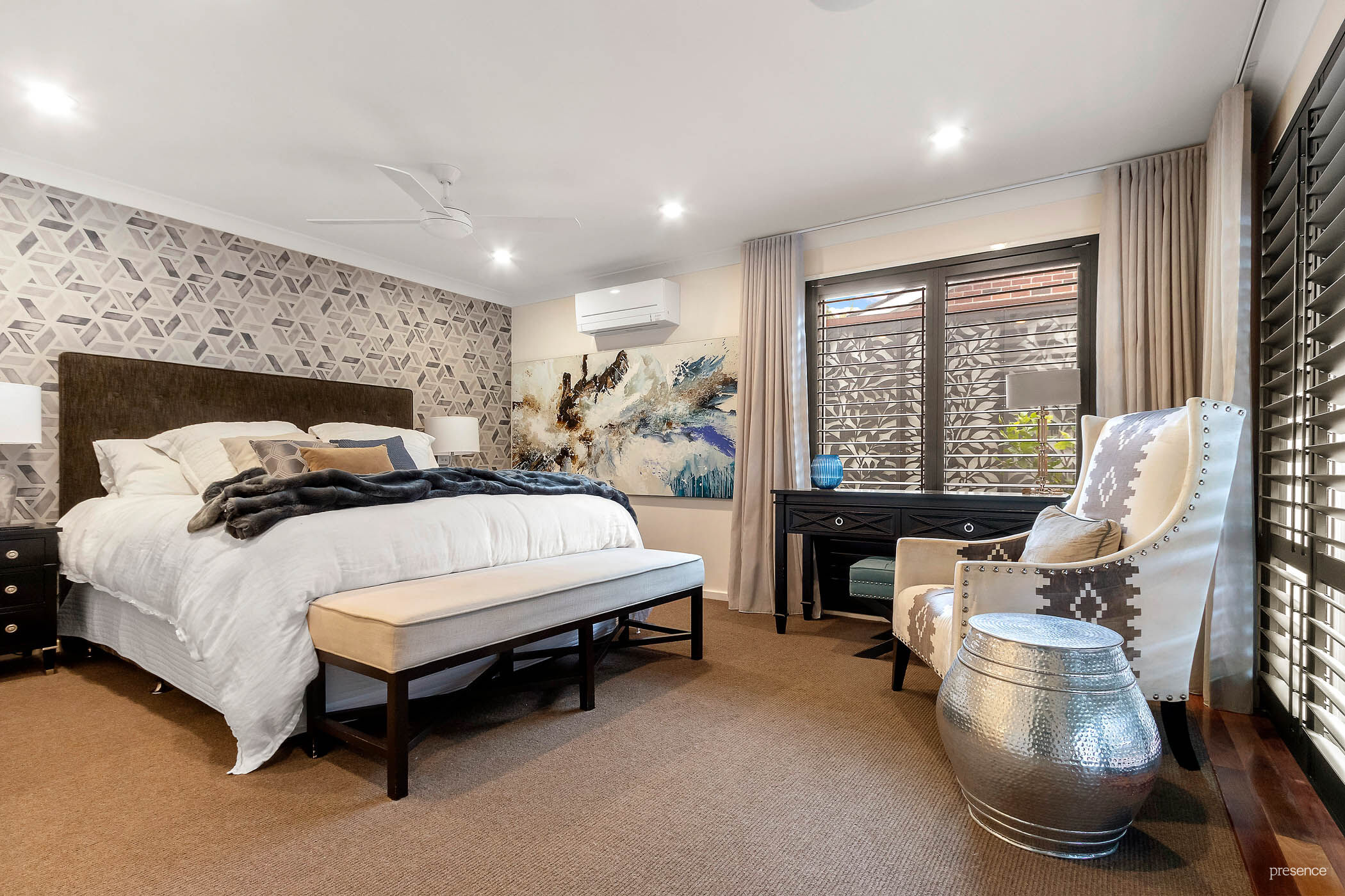 • Master bedroom boasts a stunning walk-in wardrobe with dresser, ceiling fan and air-conditioning with glass sliding doors opening out to the front porch; ensuite includes heated towel rails and rain shower