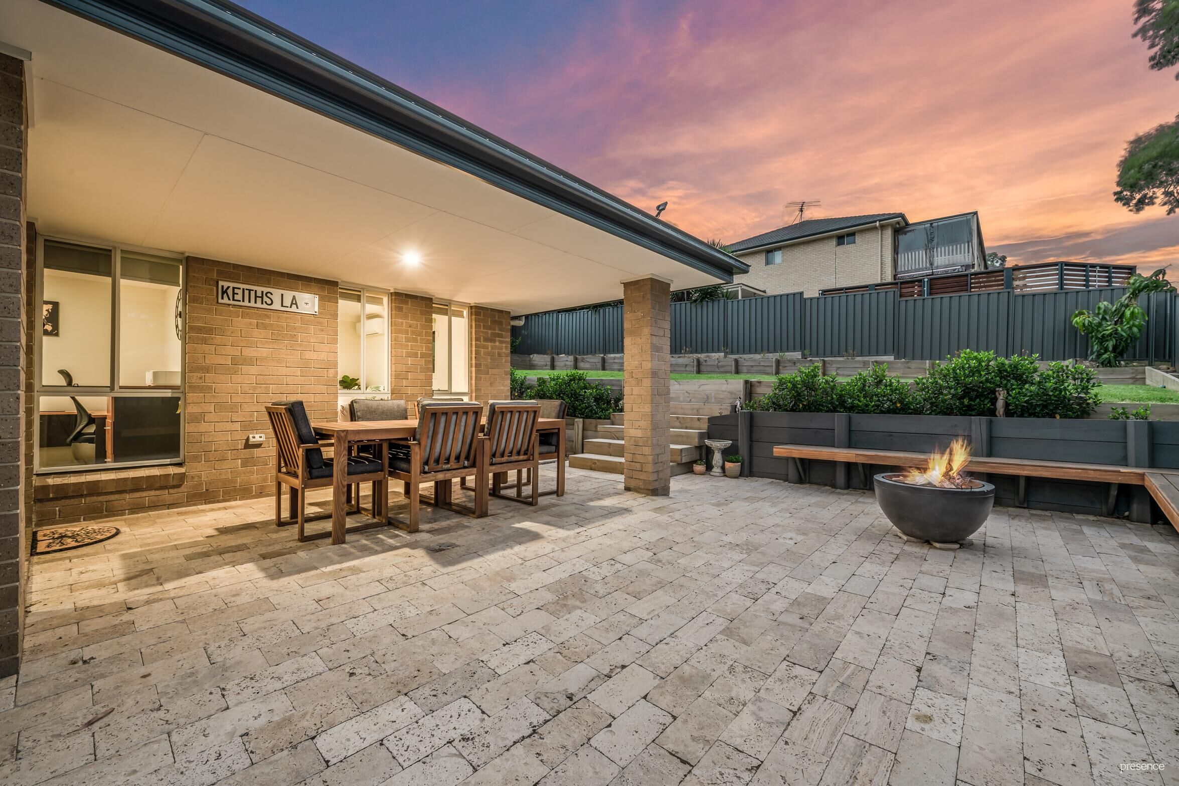 – Covered alfresco and paved entertaining area with bench seating overlooks terraced backyard