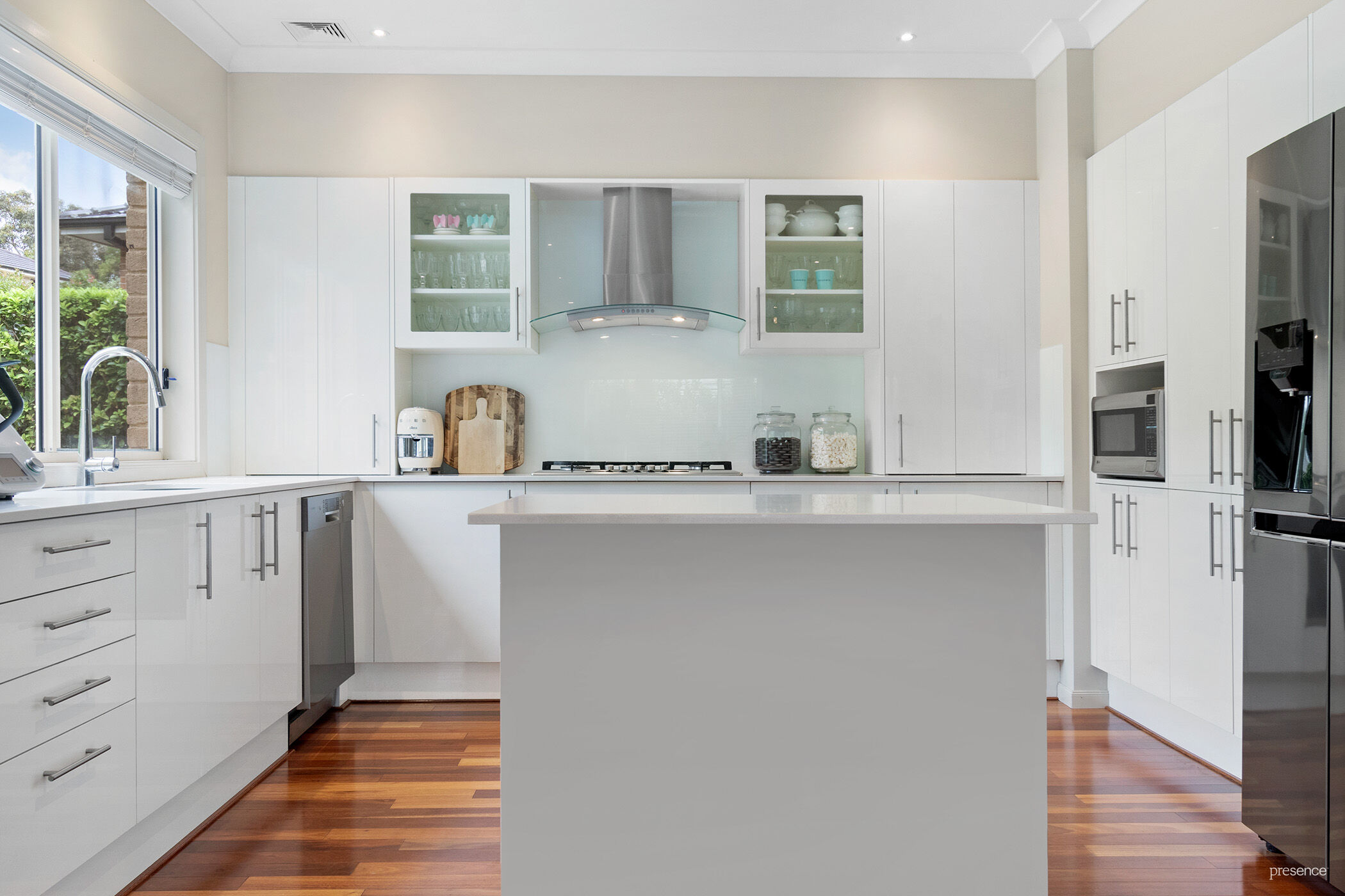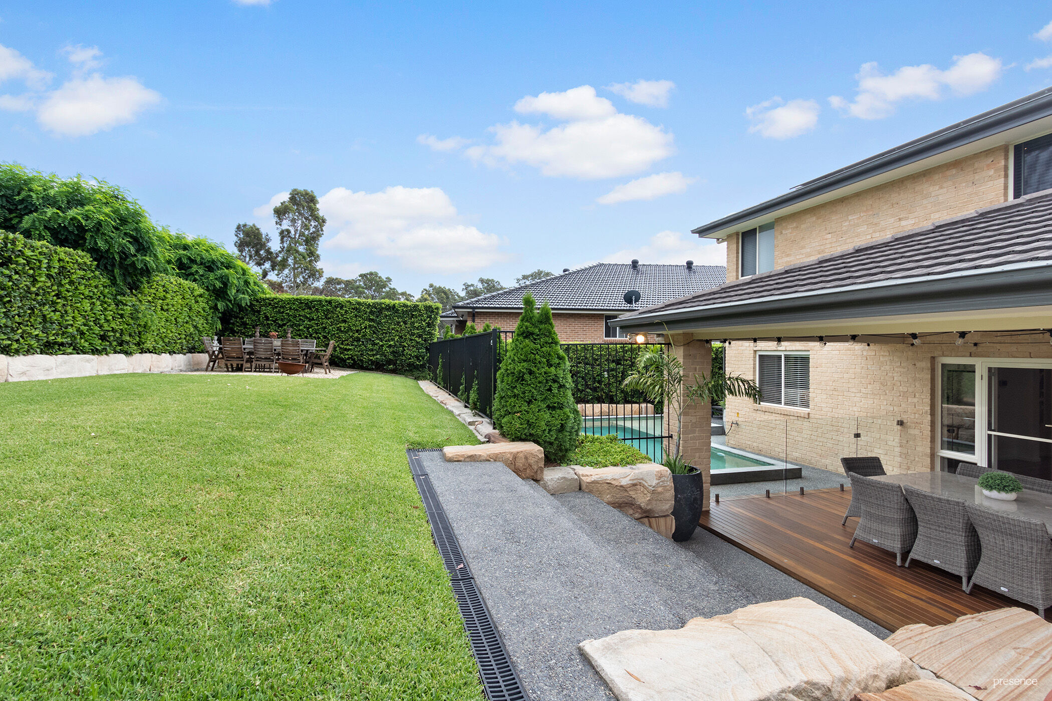 The generously proportioned informal living areas provide plenty of space for families whether it be a long lunch with friends in the alfresco dining, playing cricket on the level lawn, lounging by the sparkling pool, or preparing a feast in the enormous u-shaped kitchen with stone benchtops, stainless steel appliances and an abundance of storage and meal preparation space.