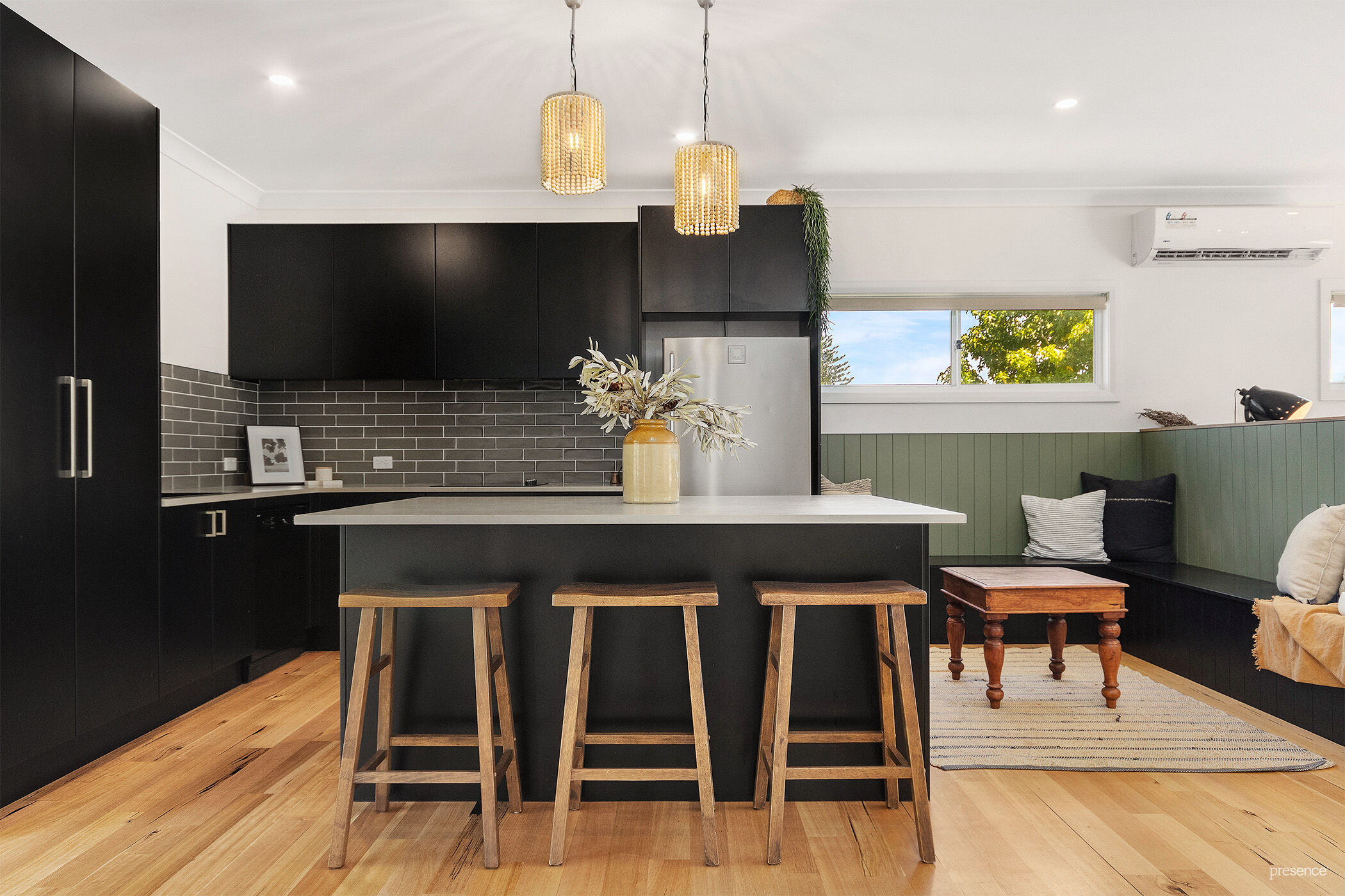 – Inviting, air-conditioned open-plan family space with dedicated lounge area, meals area, and luxurious built-in booth seating, featuring Tassie Oak timber floors.