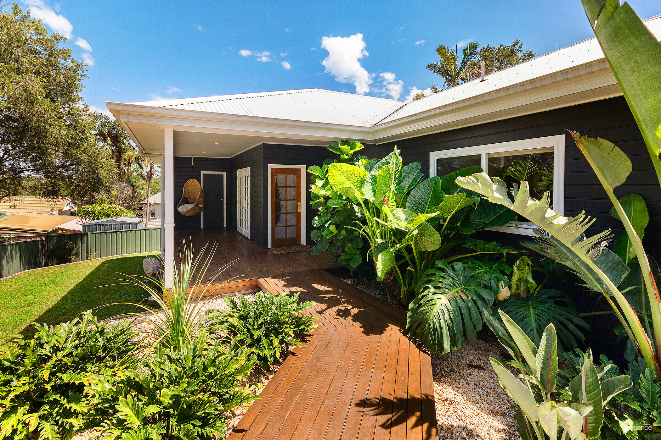 – Wrap-around gardens with lush lawn, vibrant tropical foliage, and artfully laid, reclaimed stepping stones.