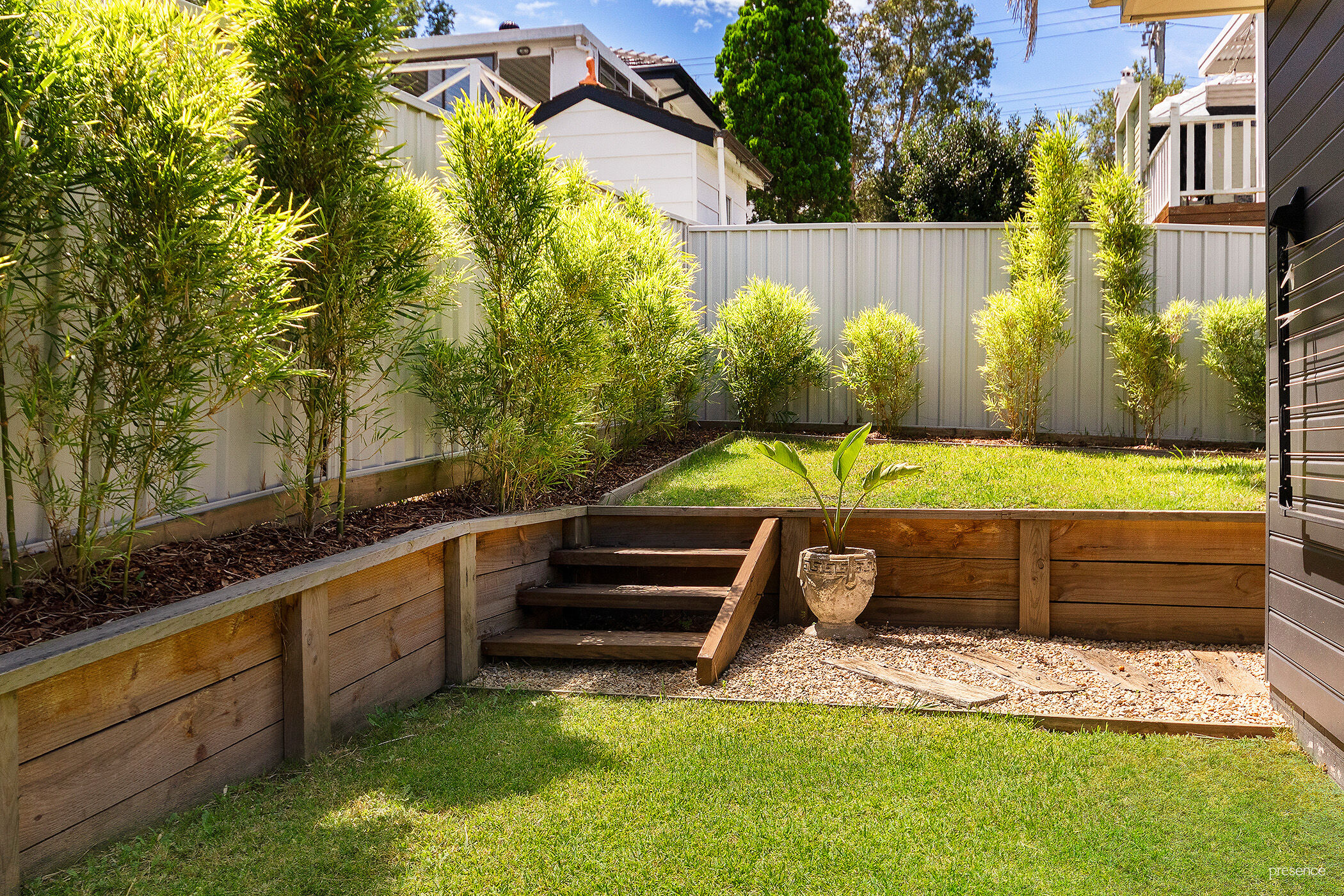 Surrounding the home, wrap-around gardens feature a delightful blend of lush lawn, vibrant tropical foliage, and artfully laid, rustic stepping stones, reclaimed from the old Taylors Beach Jetty. A large shed provides ample storage for tools and equipment, and approvals are in place for the construction of a double carport, adding the final touch to this exceptional property.