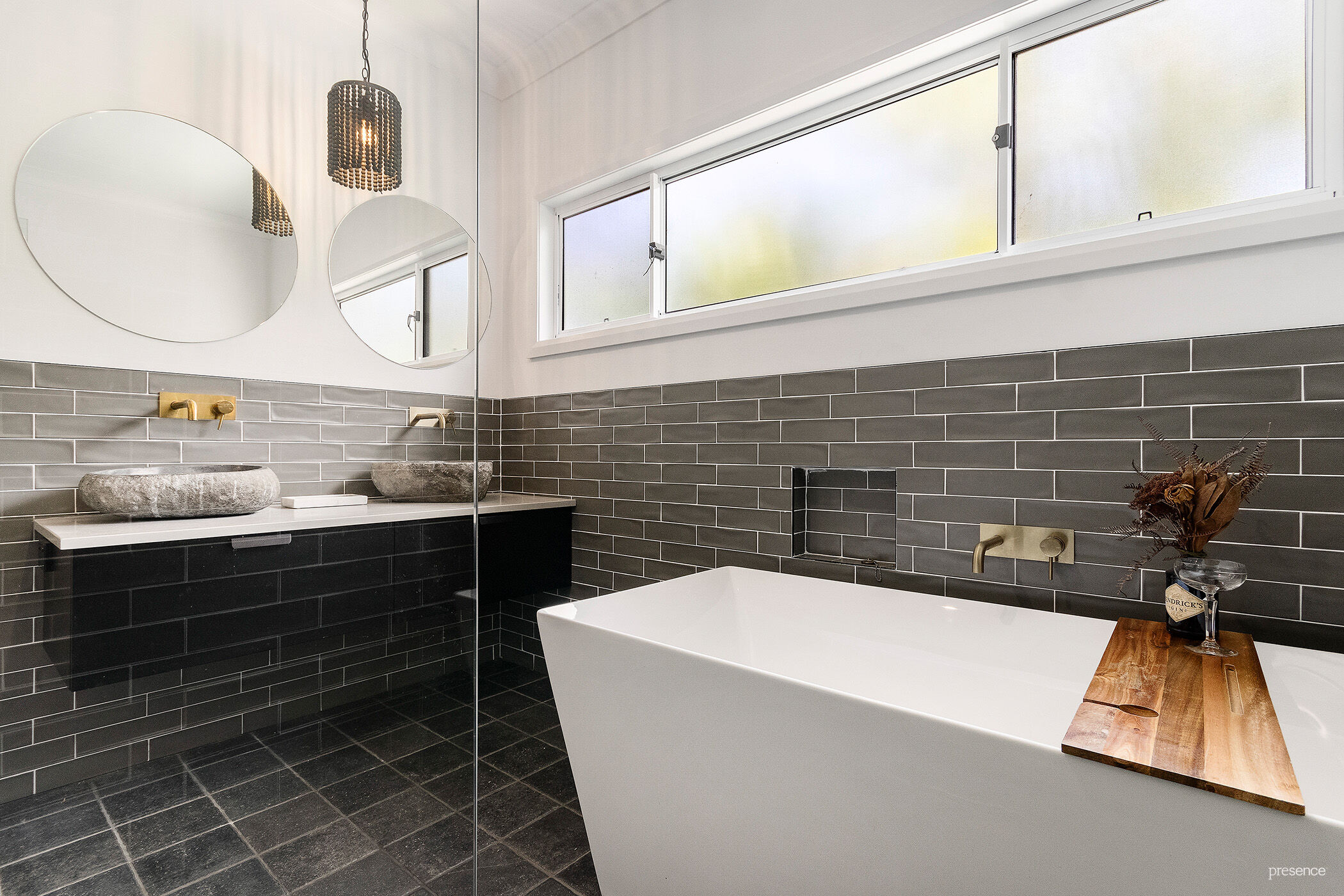 All four bedrooms are generous in size, and include spacious robes, with the master featuring a large walk-in robe and ensuite. Mirroring the style and sophistication found throughout the home, both bathrooms exude opulence with their natural stone basins, cement benchtops, and brushed brass fixtures. The main bathroom boasts a lavish free-standing bath – crafted with sleek, contemporary lines and a timeless silhouette – elevating the sense of luxury and relaxation. A separate laundry and massive linen closet complete the well-thought-out interior.