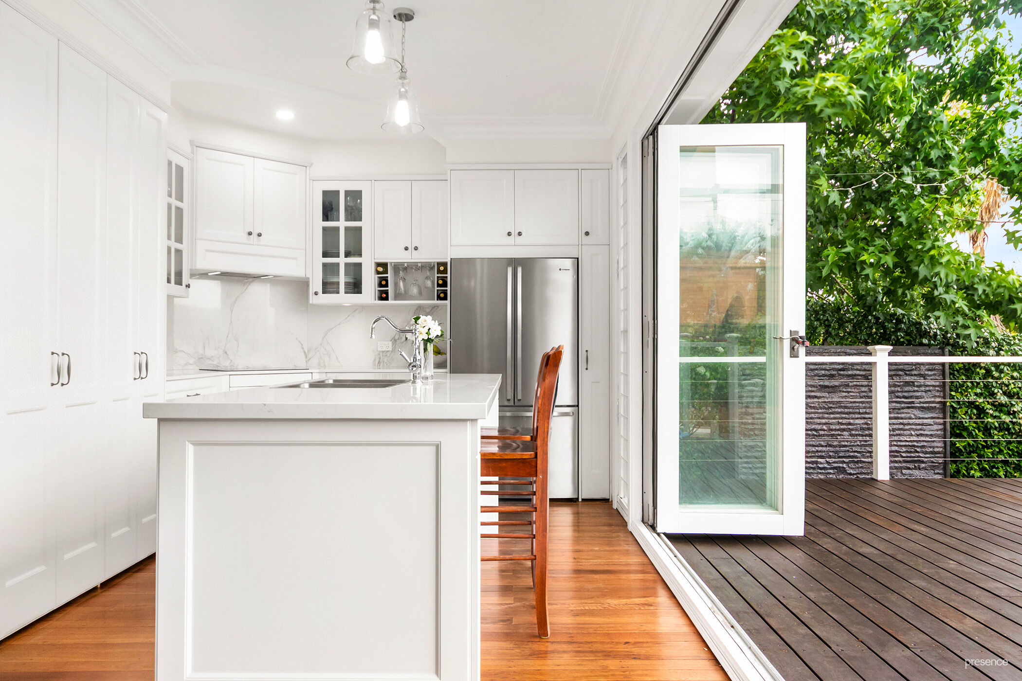 The island kitchen is equal parts timeless and practical, with shaker cabinetry, induction cooking, great storage, and a thoughtful orientation that lets you look out to the deck and stadium beyond. Bi-fold doors open wide to connect everything for easy entertaining.