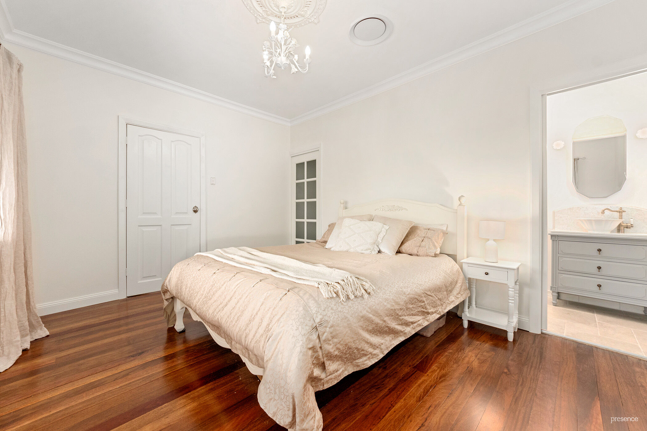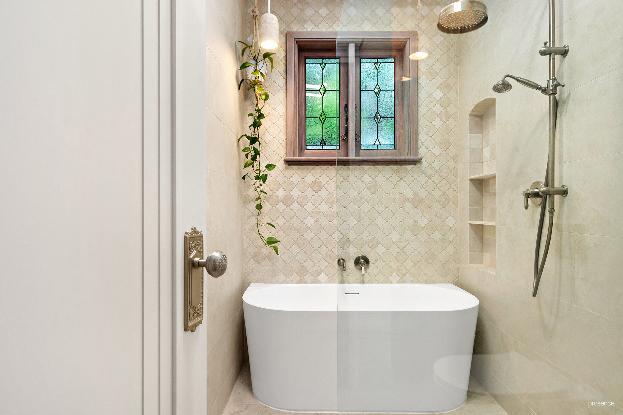 At the front, the master bedroom watches over an established rose garden that became the muse for the home’s softer, floral touches. Pearlescent paint highlights the ceiling roses, catching the light just so, while the new ensuite leans into a more decadent mood with custom made Brazilian rock crystal flower sconces and beautiful floral-patterned tiles that tie back to the garden theme. The main bathroom is pure designer bliss which draws on the owners’ European travels, with natural stone tiles and dimmable stone pendant lights, a hand-basin stone lined alcove, French pattern flooring with underfloor heating, and a skylight that frames the blue sky and surrounding canopy offering a little daily luxury paired with a long, relaxing soak in the back to wall tub.