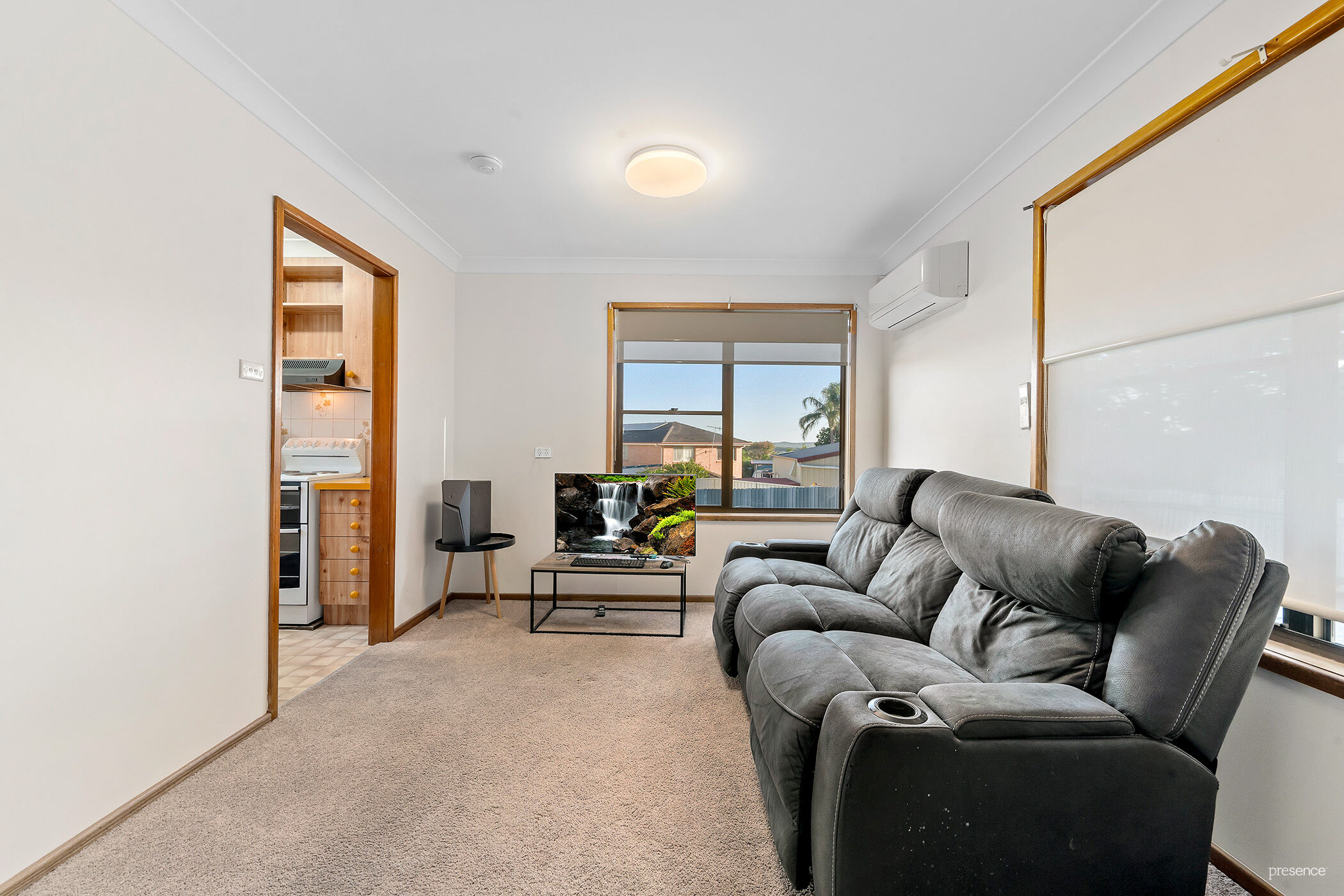 – Light-filled open plan lounge and dining room with air-conditioning and combustion fireplace
