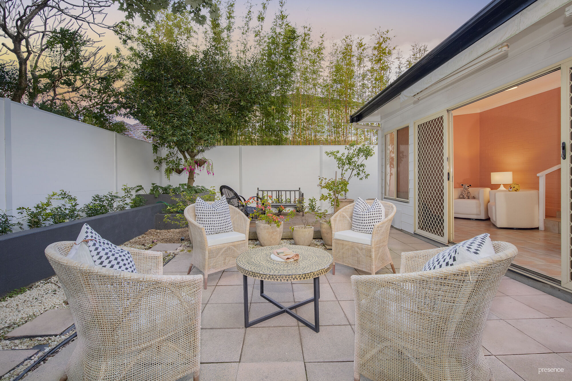 – The Mediterranean-inspired courtyard is ideal for entertaining, and includes raised garden beds, paved surfaces, and curved timber seating areas beneath mature trees.