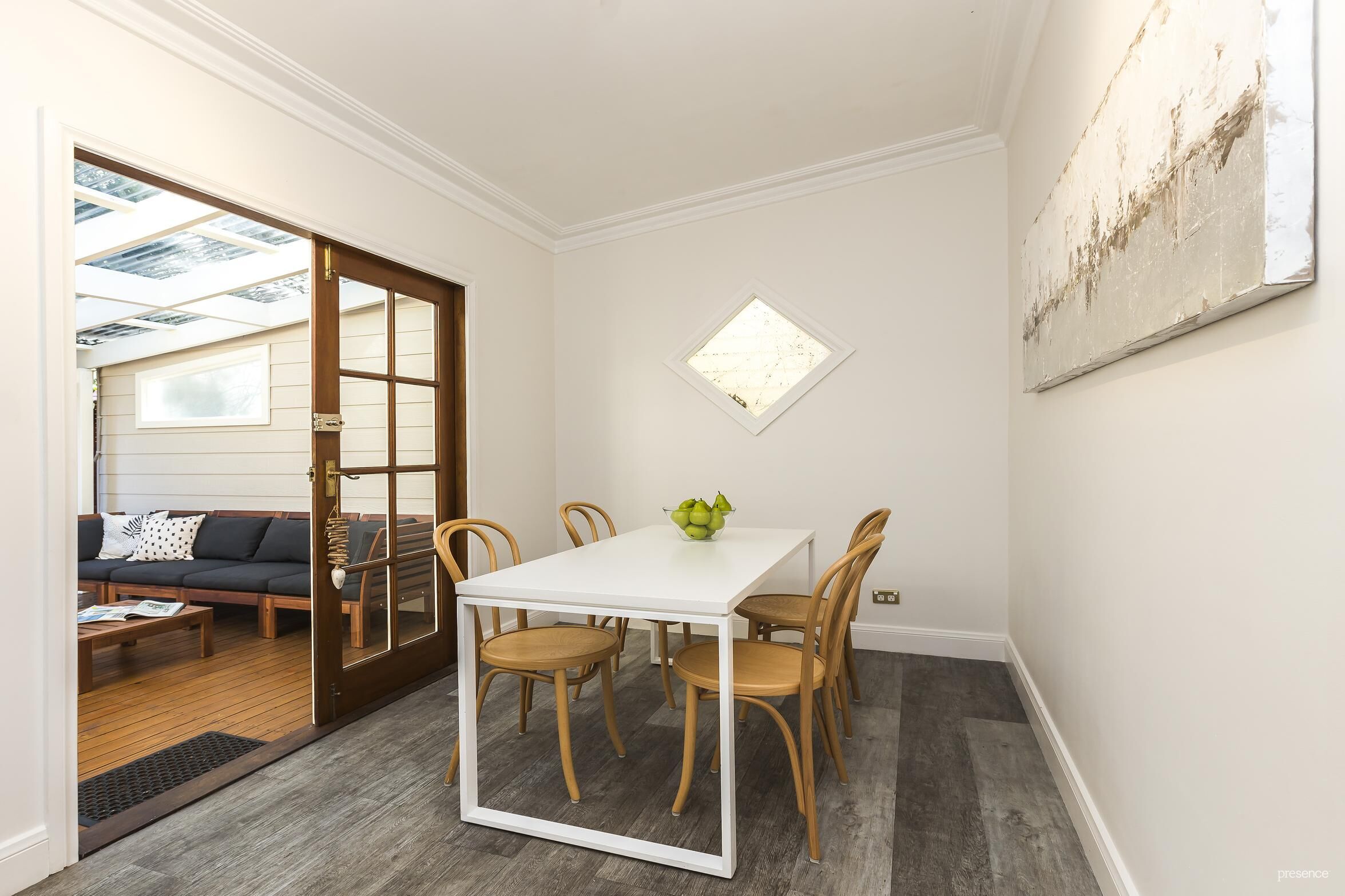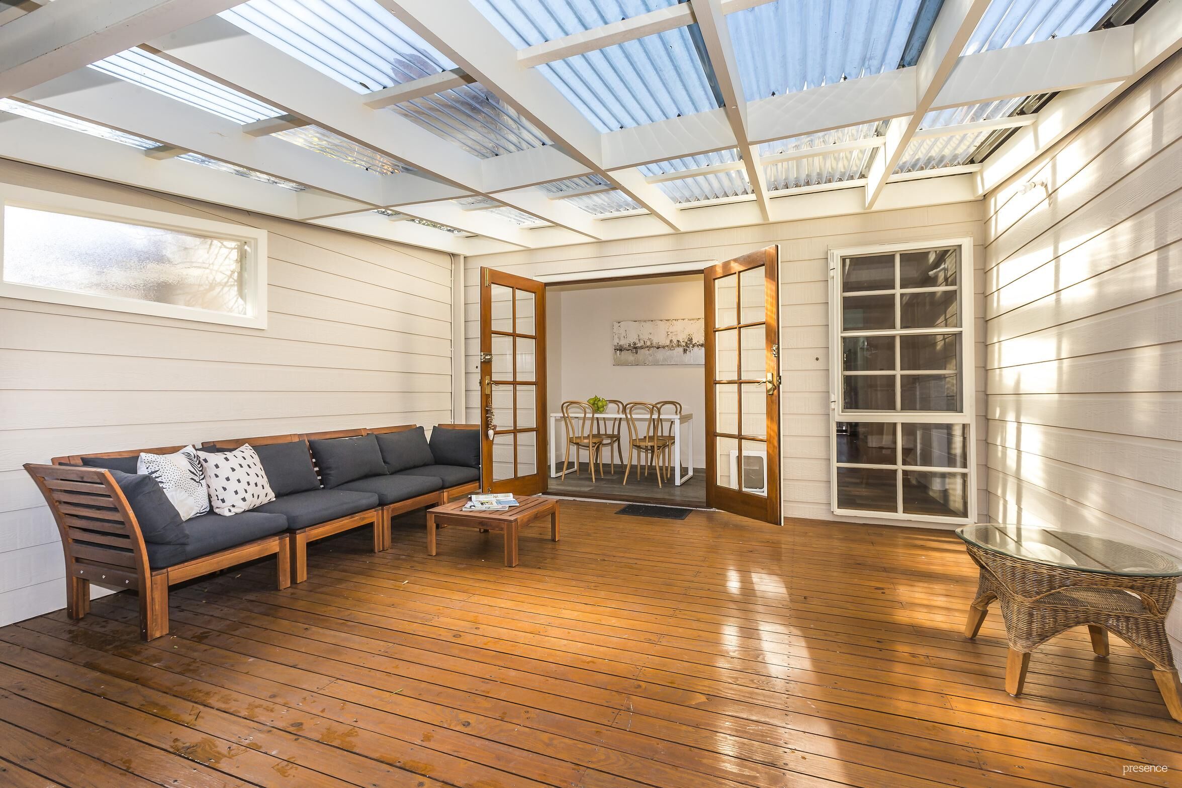 – French doors from dining room allow easy access to alfresco entertaining