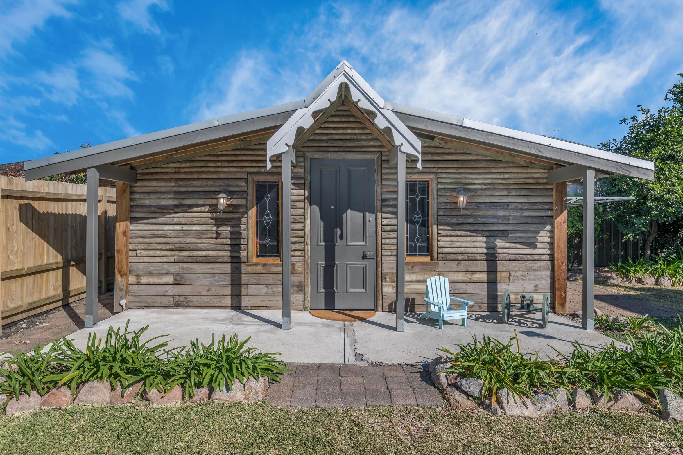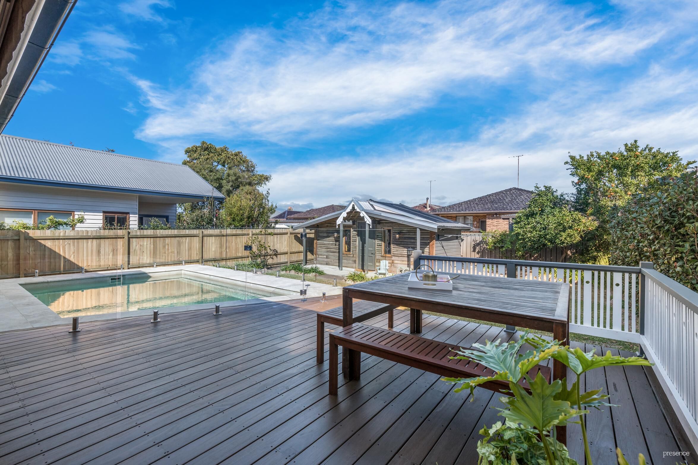 At the rear, find your relaxed casual living, dining and kitchen zone where granite benches, an induction cooktop and dishwasher cater to family needs. Waiting outside is a timber deck area, which is the obvious spot for alfresco dining and where you can keep an eye on the kids in the pool or enjoy some quiet time with a book in hand. A cottage style workshop/ garden shed provides valuable storage opportunities or alternatively could be used as a studio.