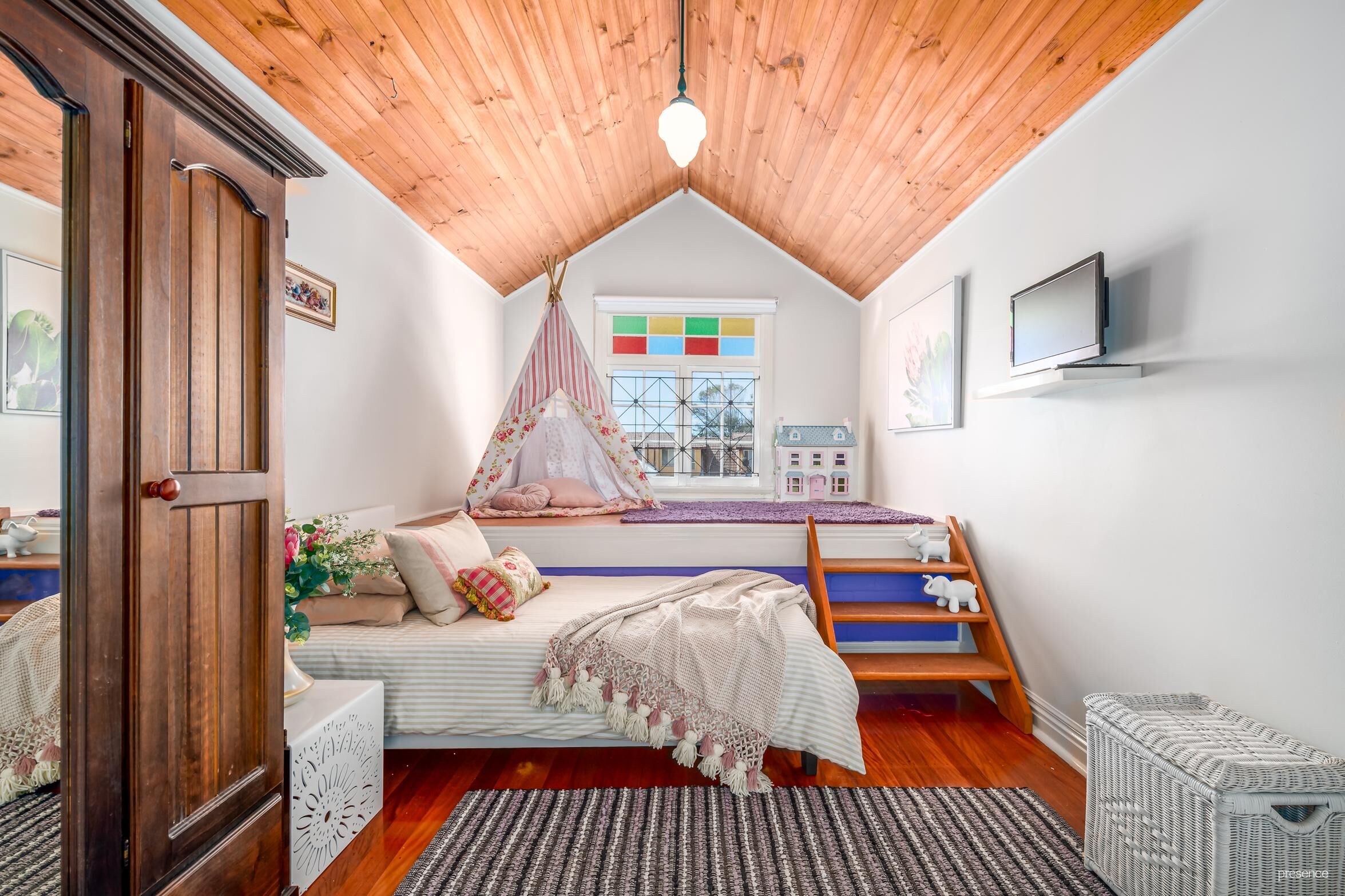 Truly captivating with 12ft ornate ceilings, original hoop pine floors and elegant leadlight detailing, the home has been faithfully restored whilst enhanced with contemporary kitchen and bathrooms and extension into the roof space to create loft style bedroom accommodation.