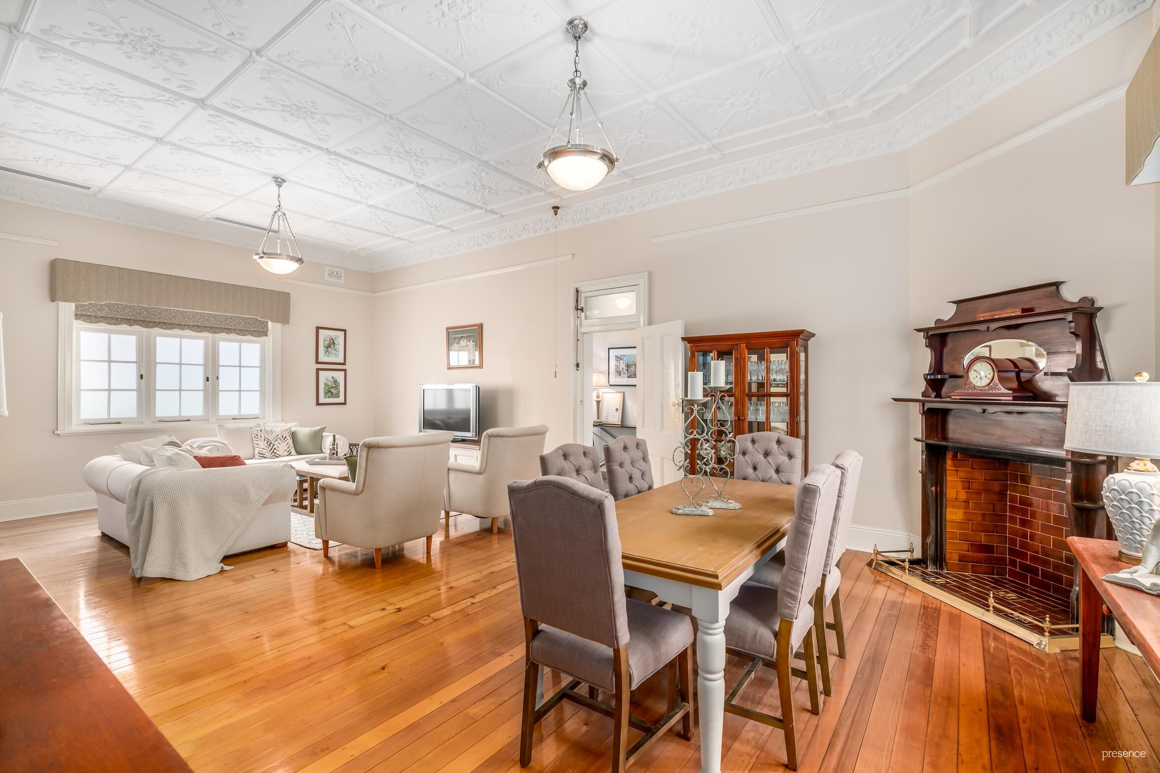 – Formal lounge and dining with fireplace and stunning ornate ceiling opens to return verandah