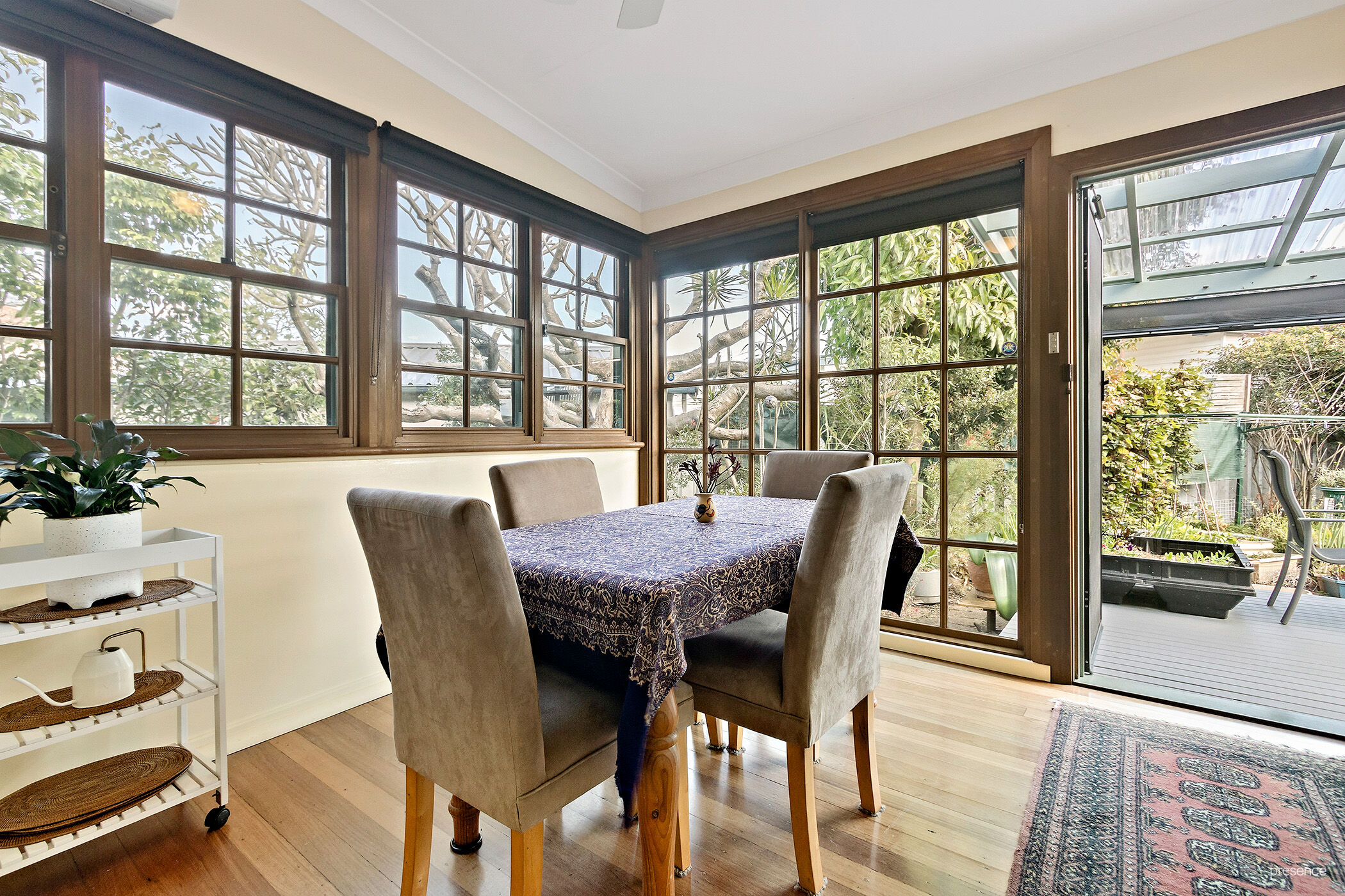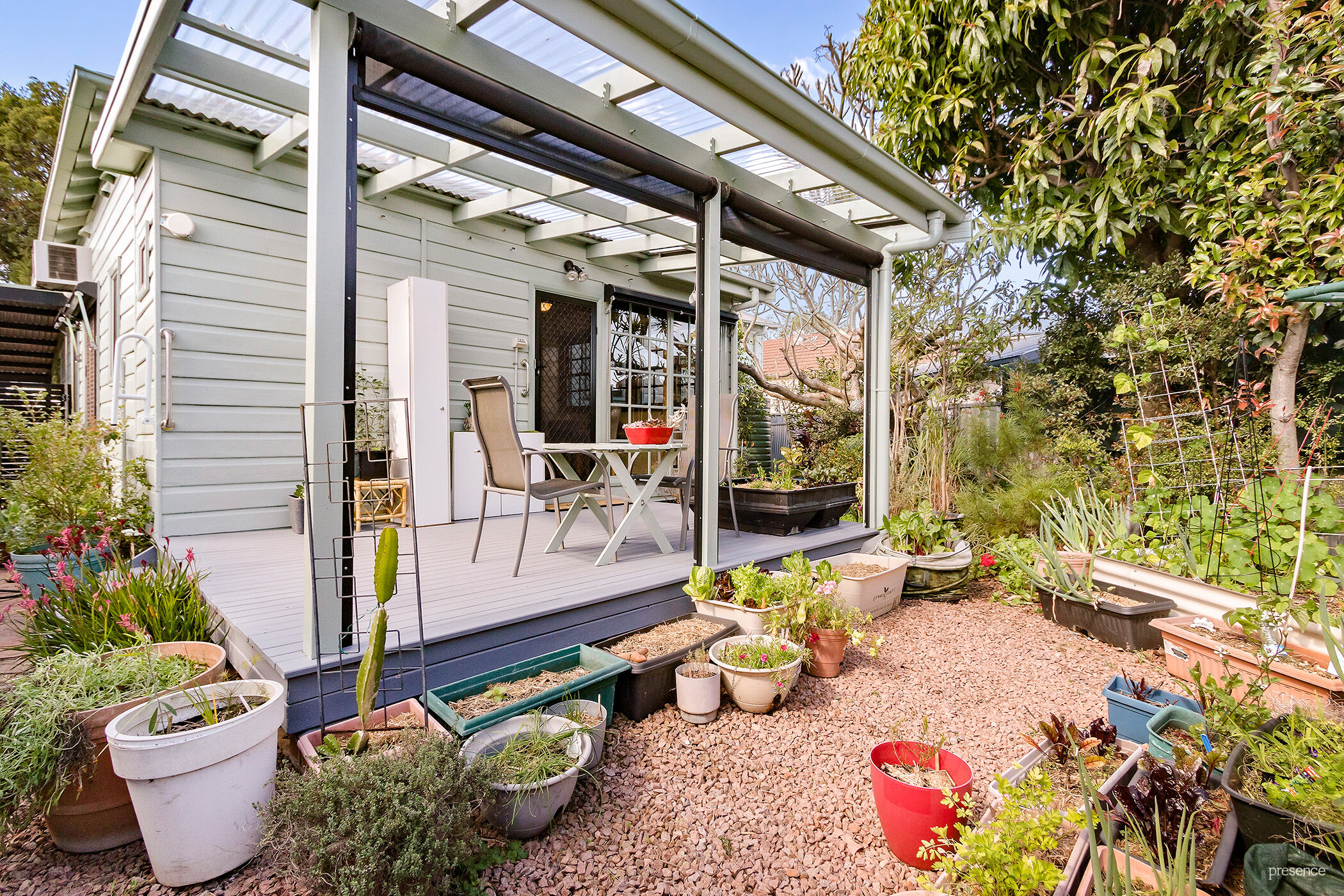 – Private rear deck with Ziptrak blinds overlooks garden with raised veggie beds & 2 sheds