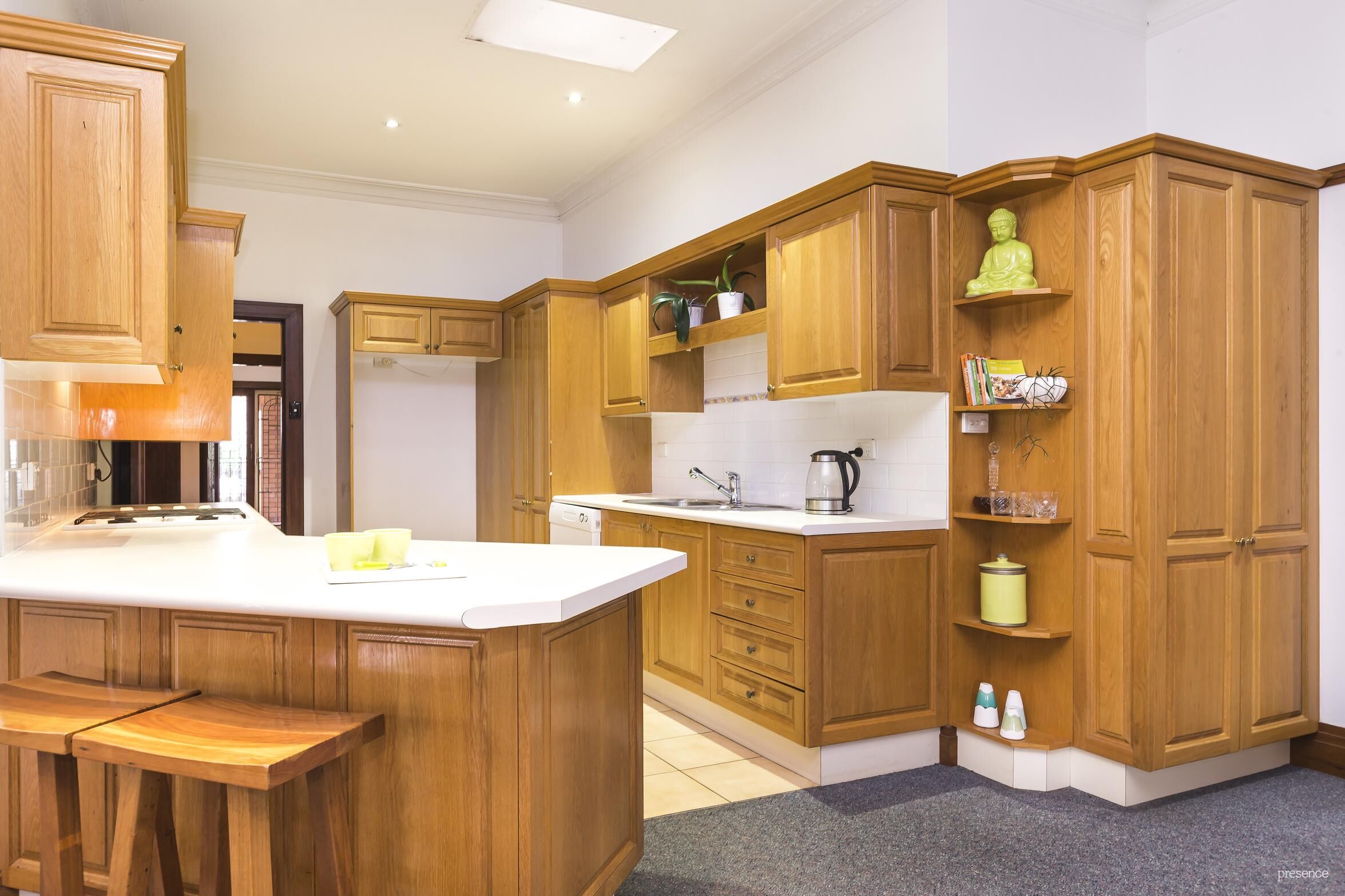 – Timber kitchen with gas cooktop and dishwasher