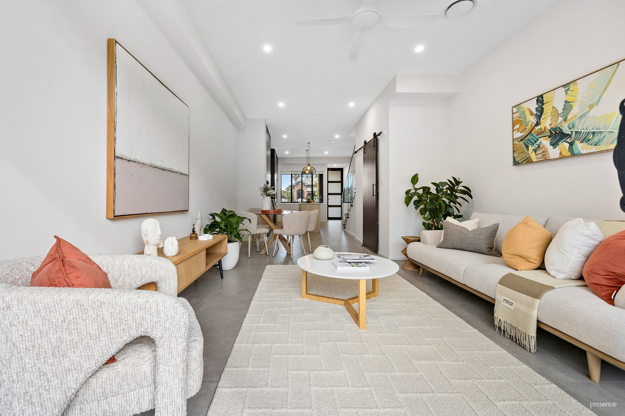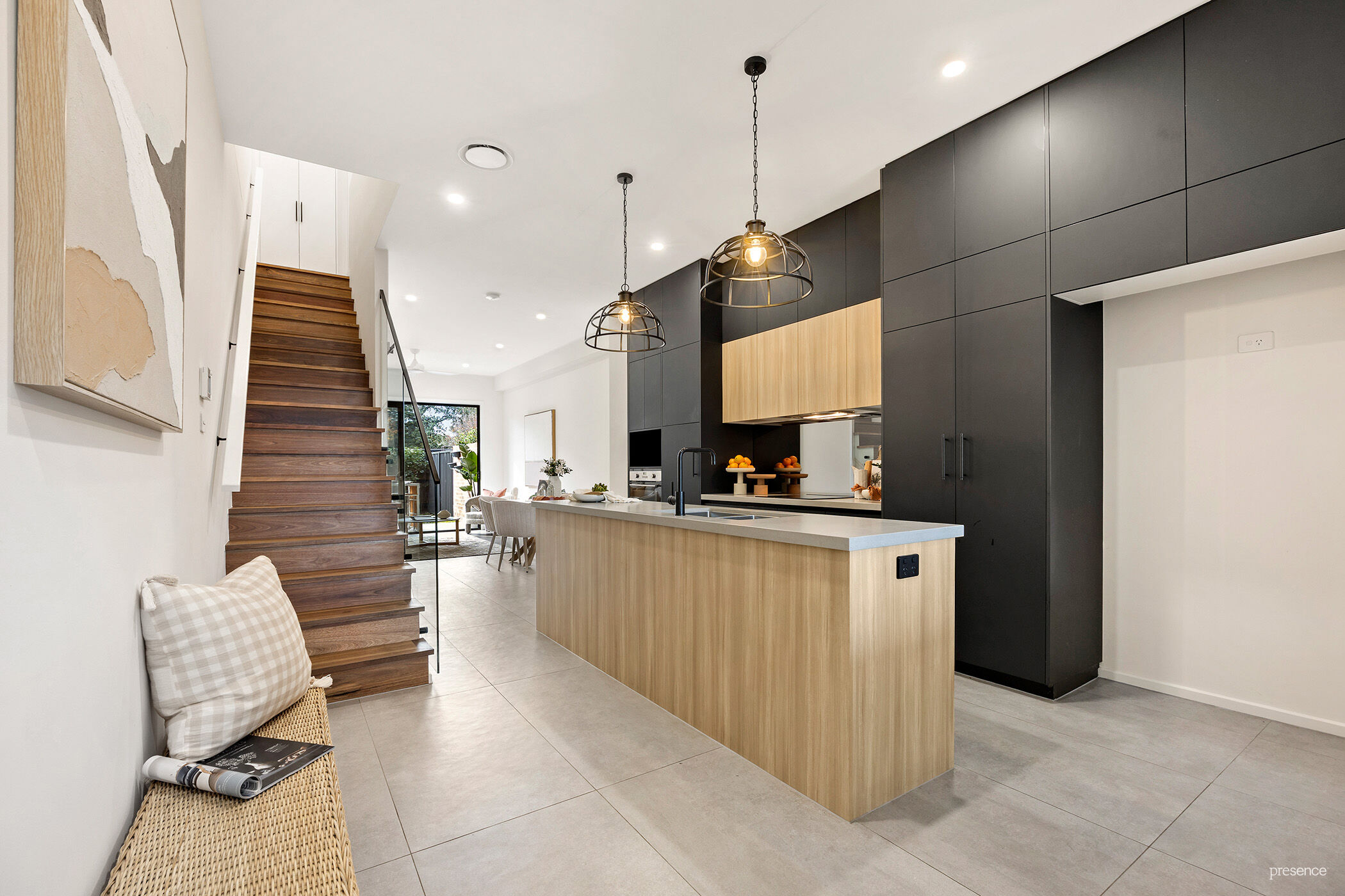Step inside to discover a sun-drenched interior that redefines modern living with a bold industrial edge and an extraordinary sense of space. Soaring ceilings, well-placed windows, and bespoke finishes combine to deliver that wow factor – think black detailing, warm timber accents, and a stunning timber staircase that adds sculptural interest.