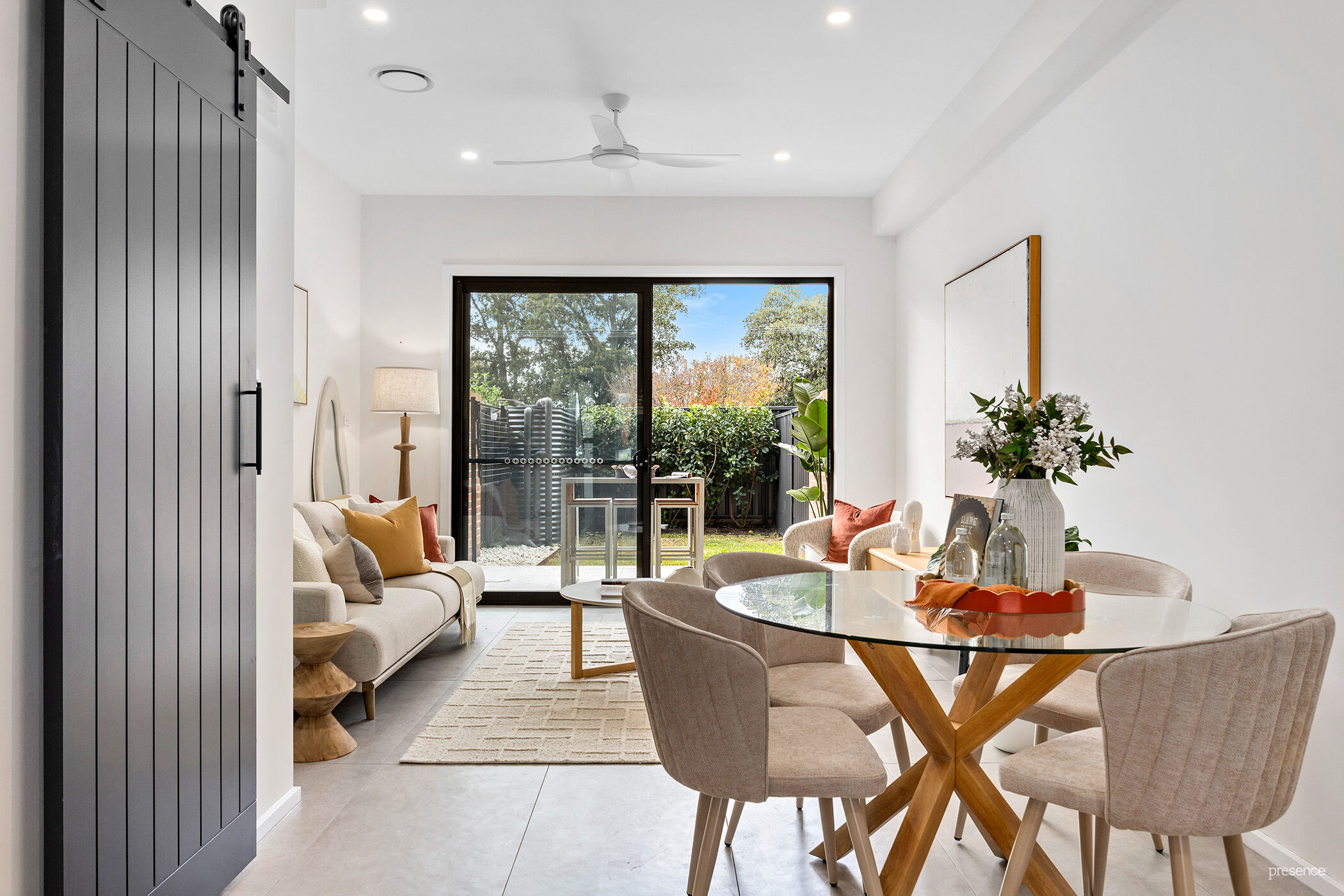 Luxuriate in the sleek designer kitchen, where matte black cabinetry is paired with timber textures, a stone-topped island, and premium appliances. Adjacent, the open-plan living and dining areas are bathed in all day sun, with expansive glass doors framing the leafy canopy of Islington Park. This space flows effortlessly to a tiled alfresco, bordered by lush lawns and tall fences, where your own private oasis awaits – perfect for entertaining or soaking up the sun.
