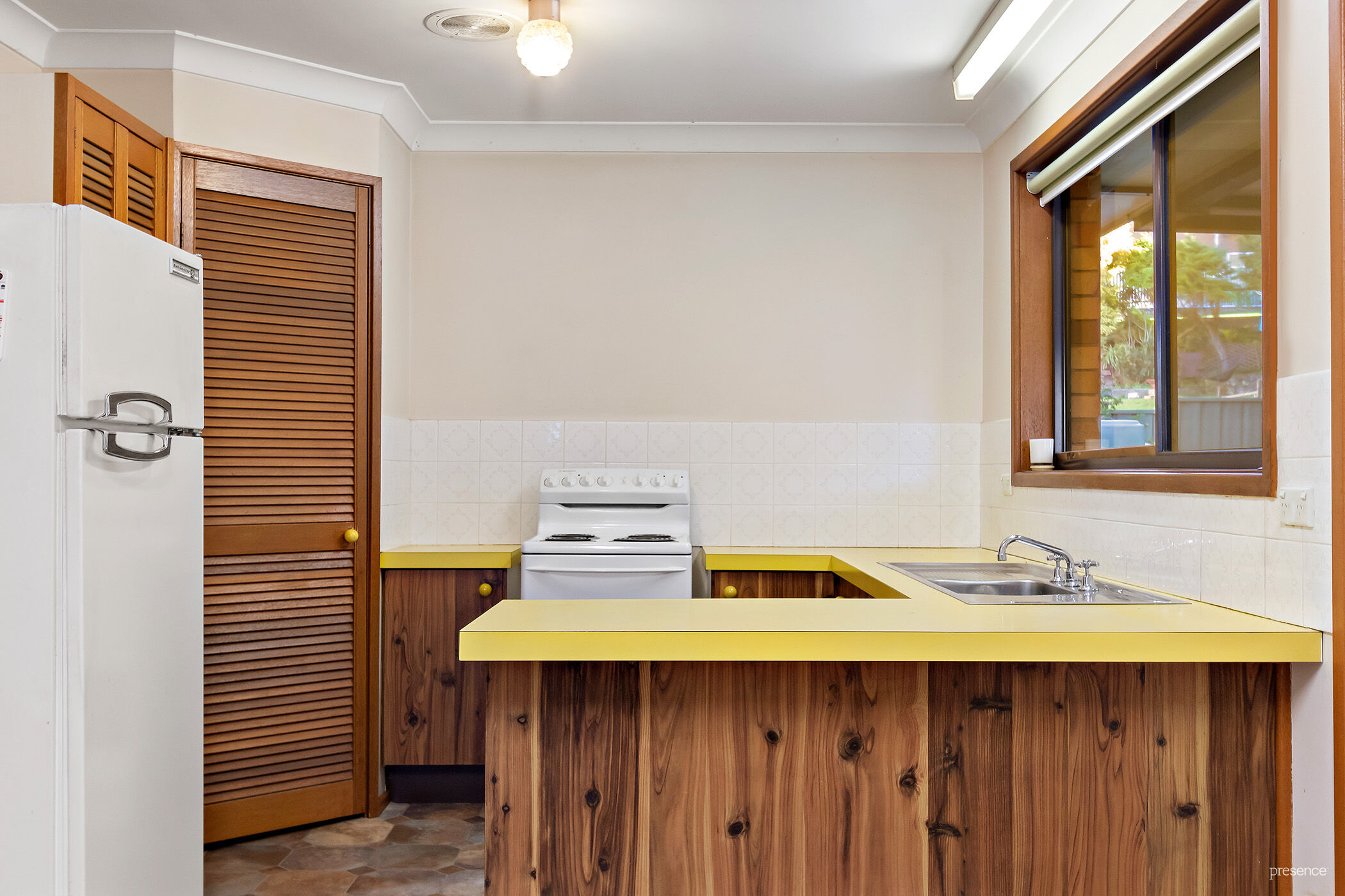 – Retro kitchen appointed with electric cooking