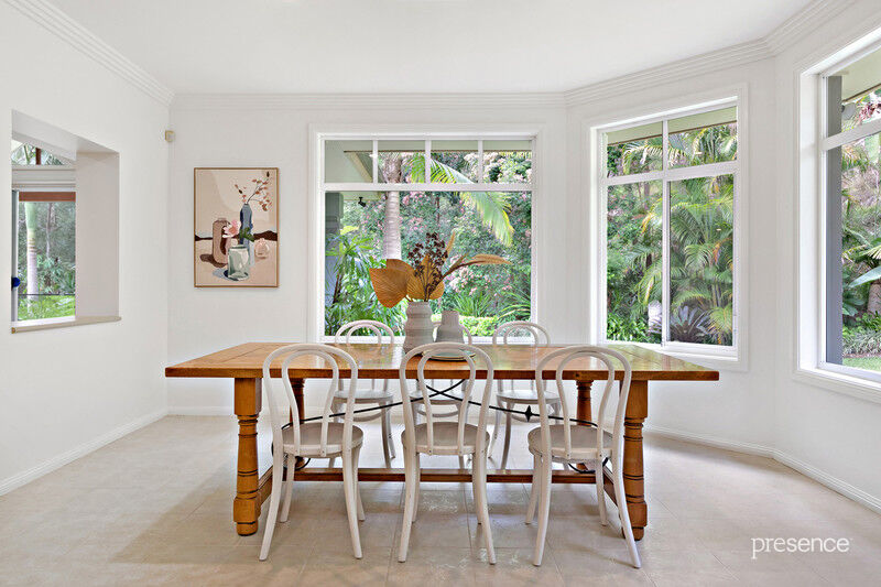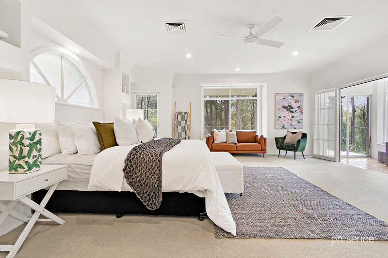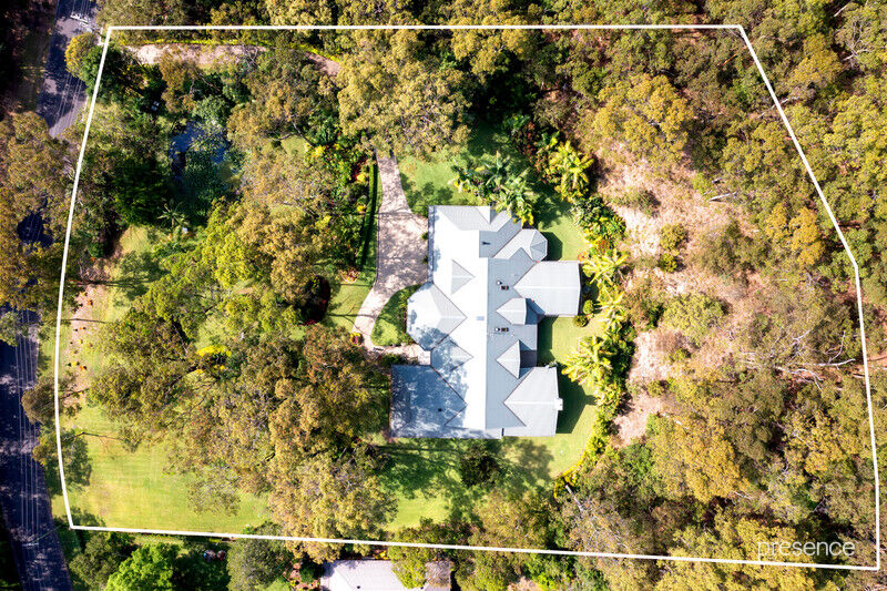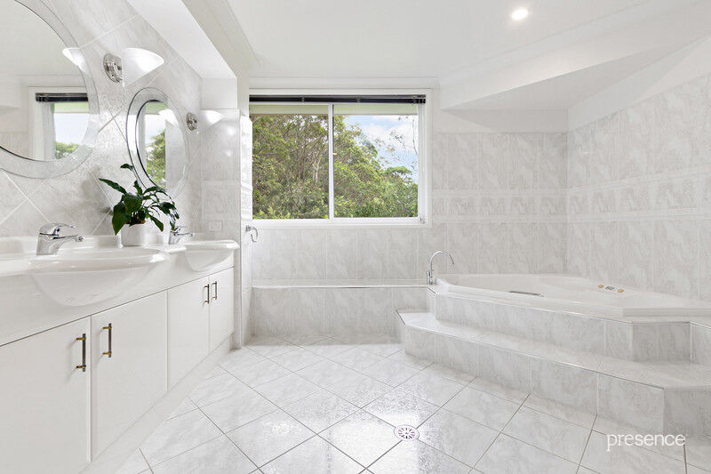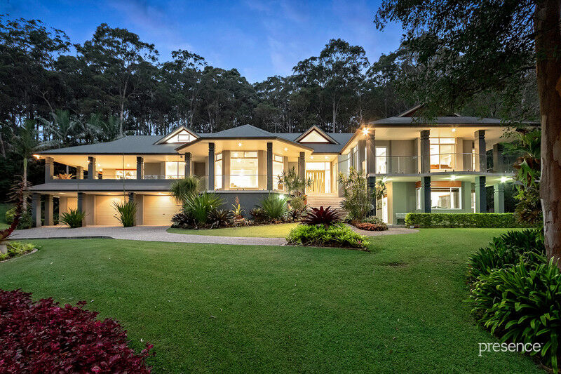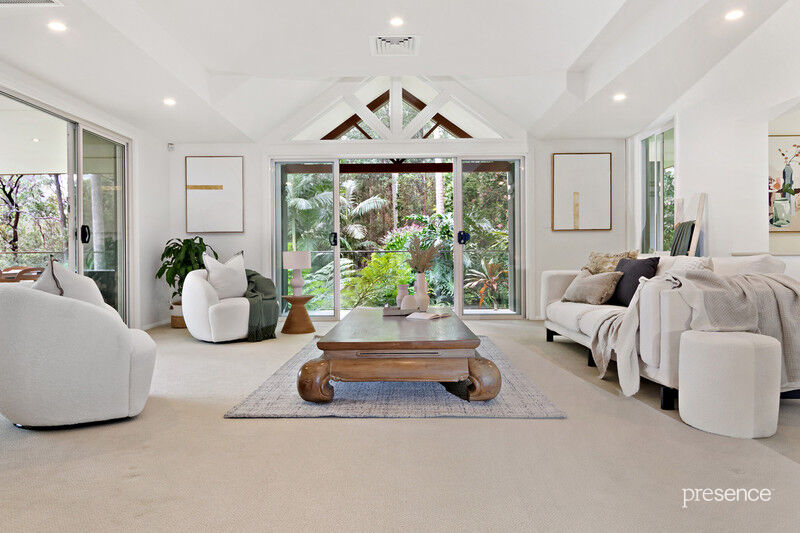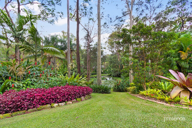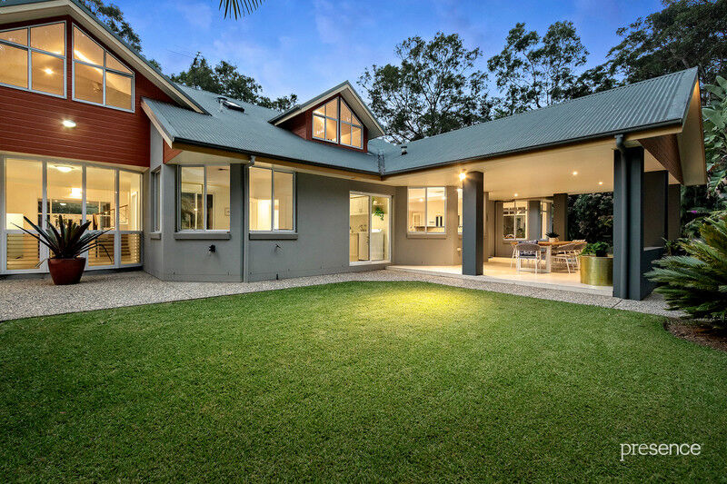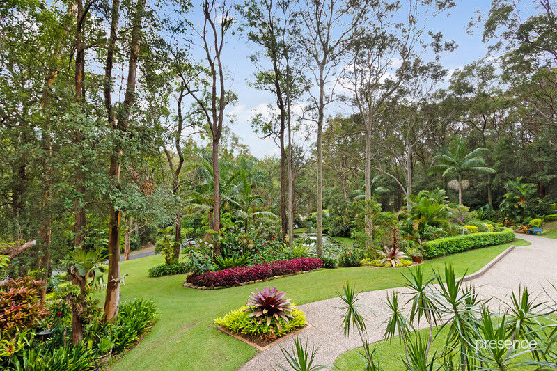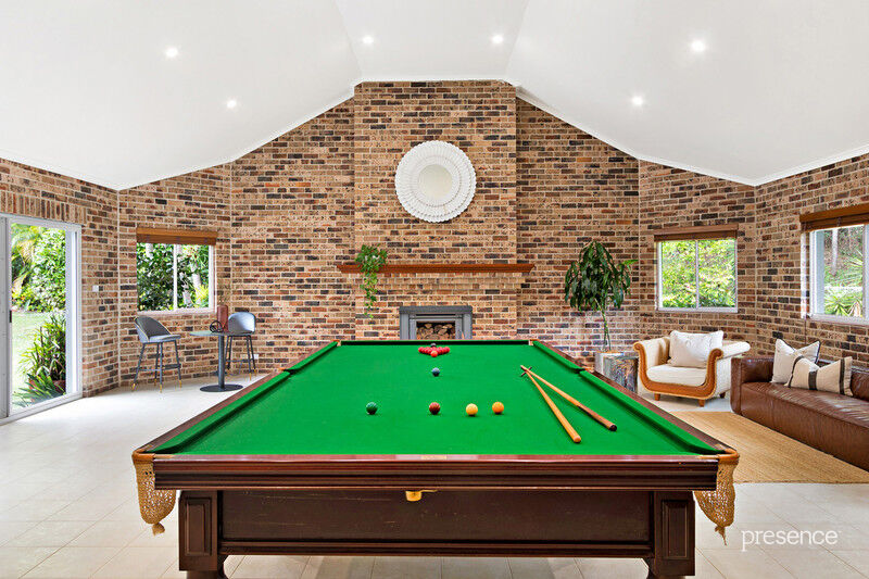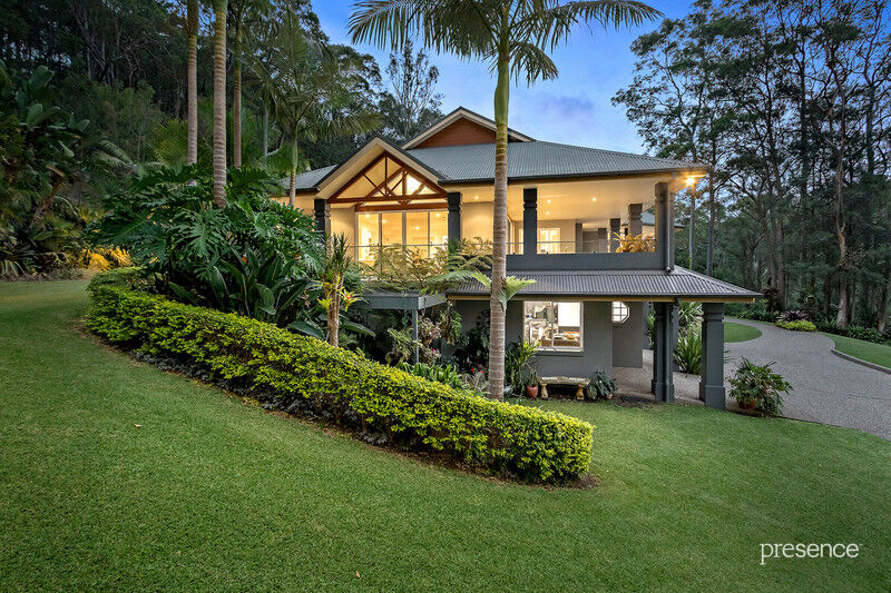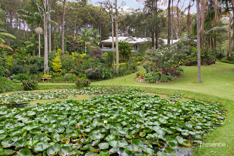 Set at the end of a whisper quiet cul-de-sac in a tranquil bushland setting, in which the calls of bellbirds and parrots abound, you will discover a tri-level home built with love by a master craftsman for his own family. The 2.5-acre surrounds have been artfully landscaped with a blend of Daintree-inspired lush tropical grounds, soft grassy areas and a lily-laden pond. As you ascend the private driveway and pause to take in the surroundings, you’ll know you’ve arrived someplace special.