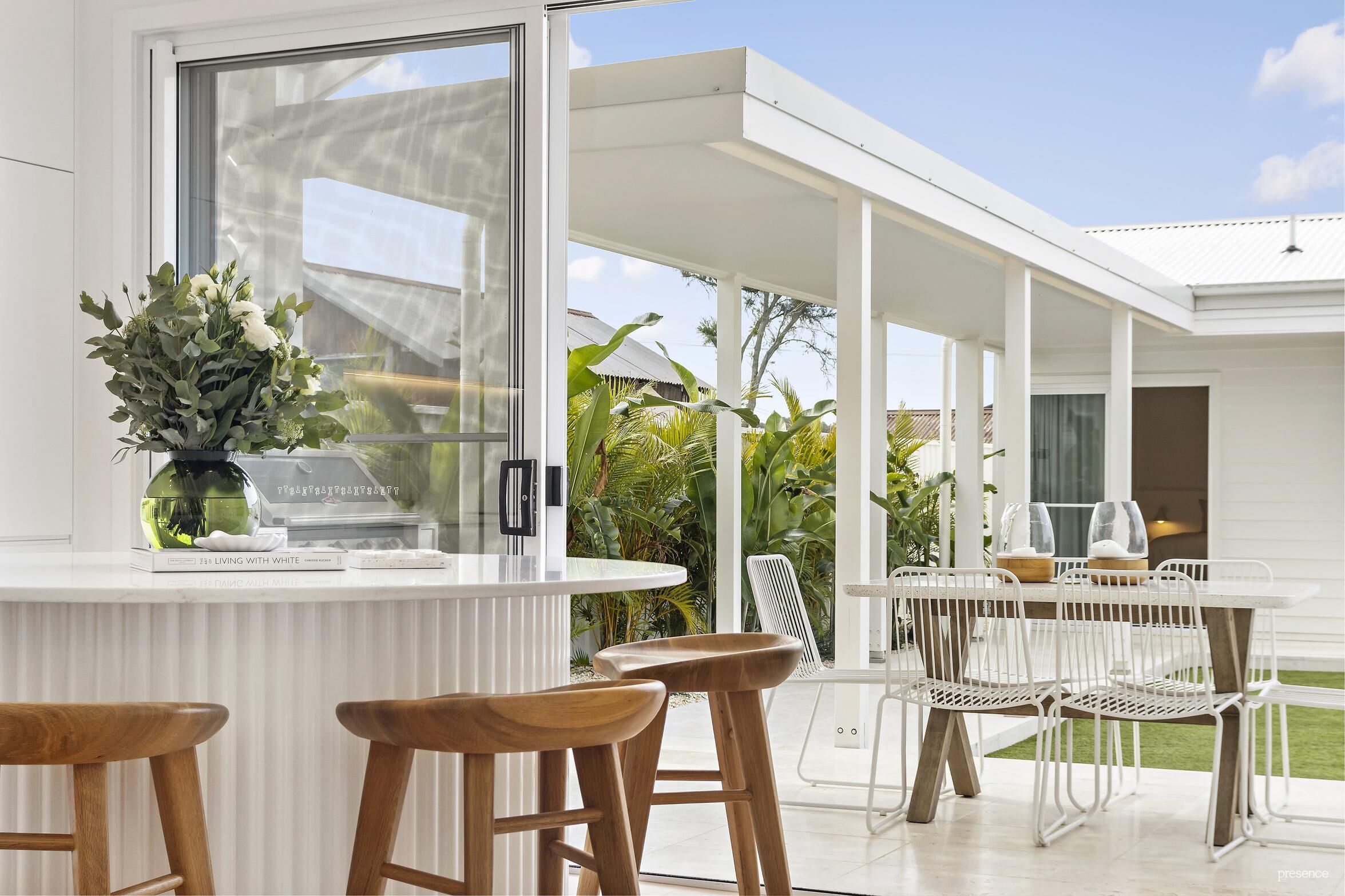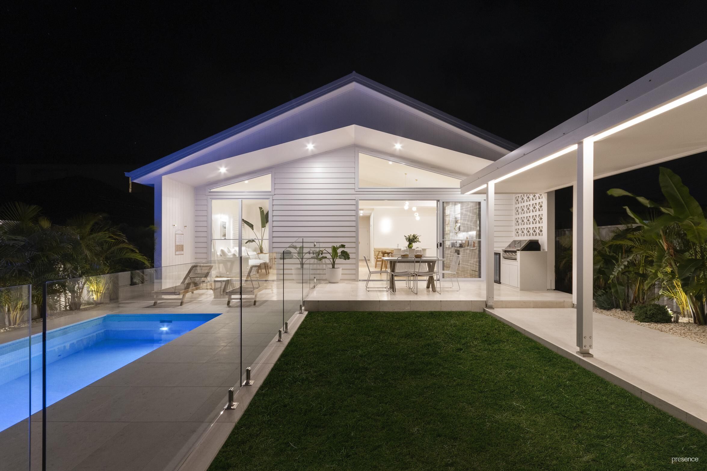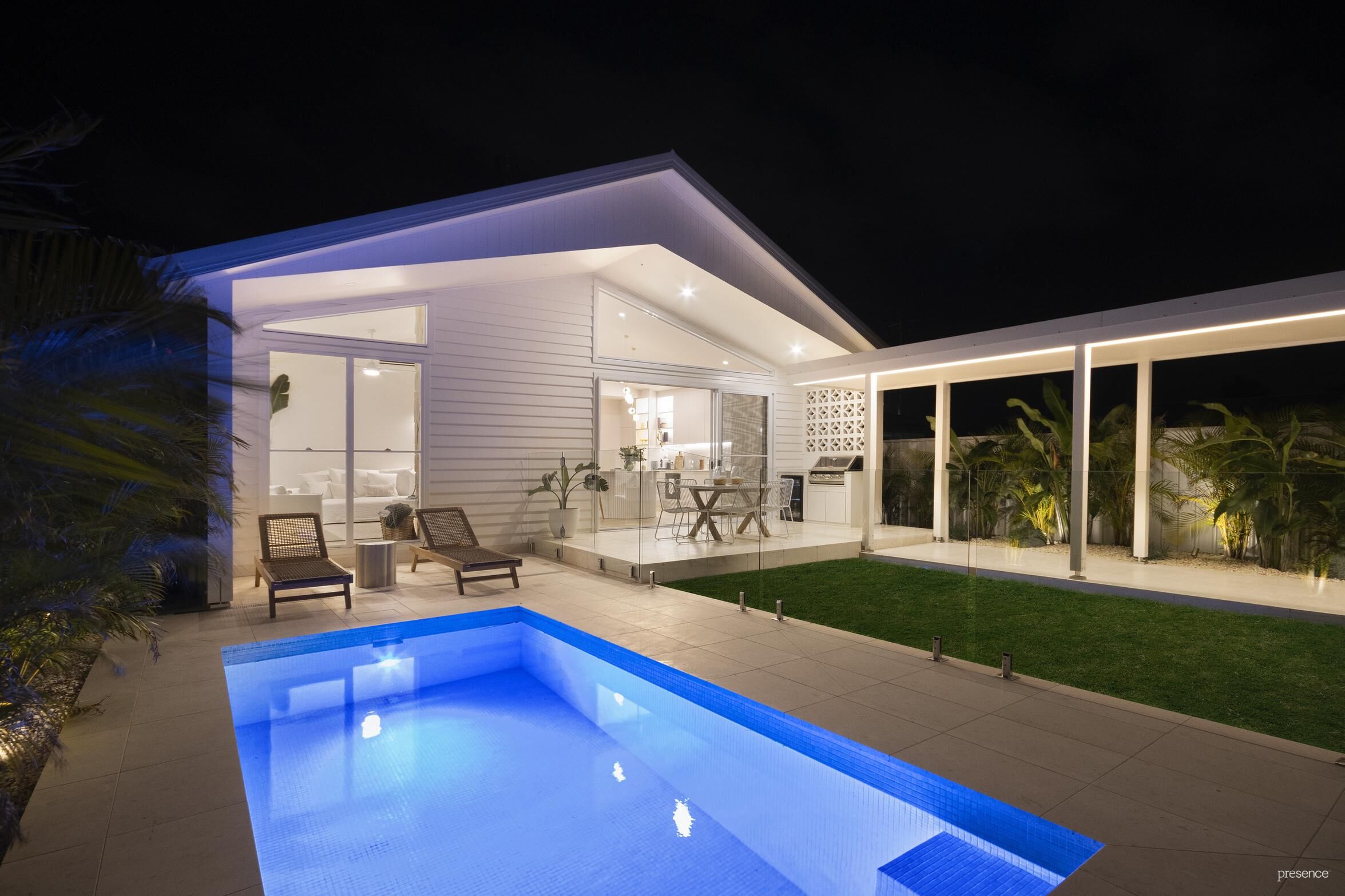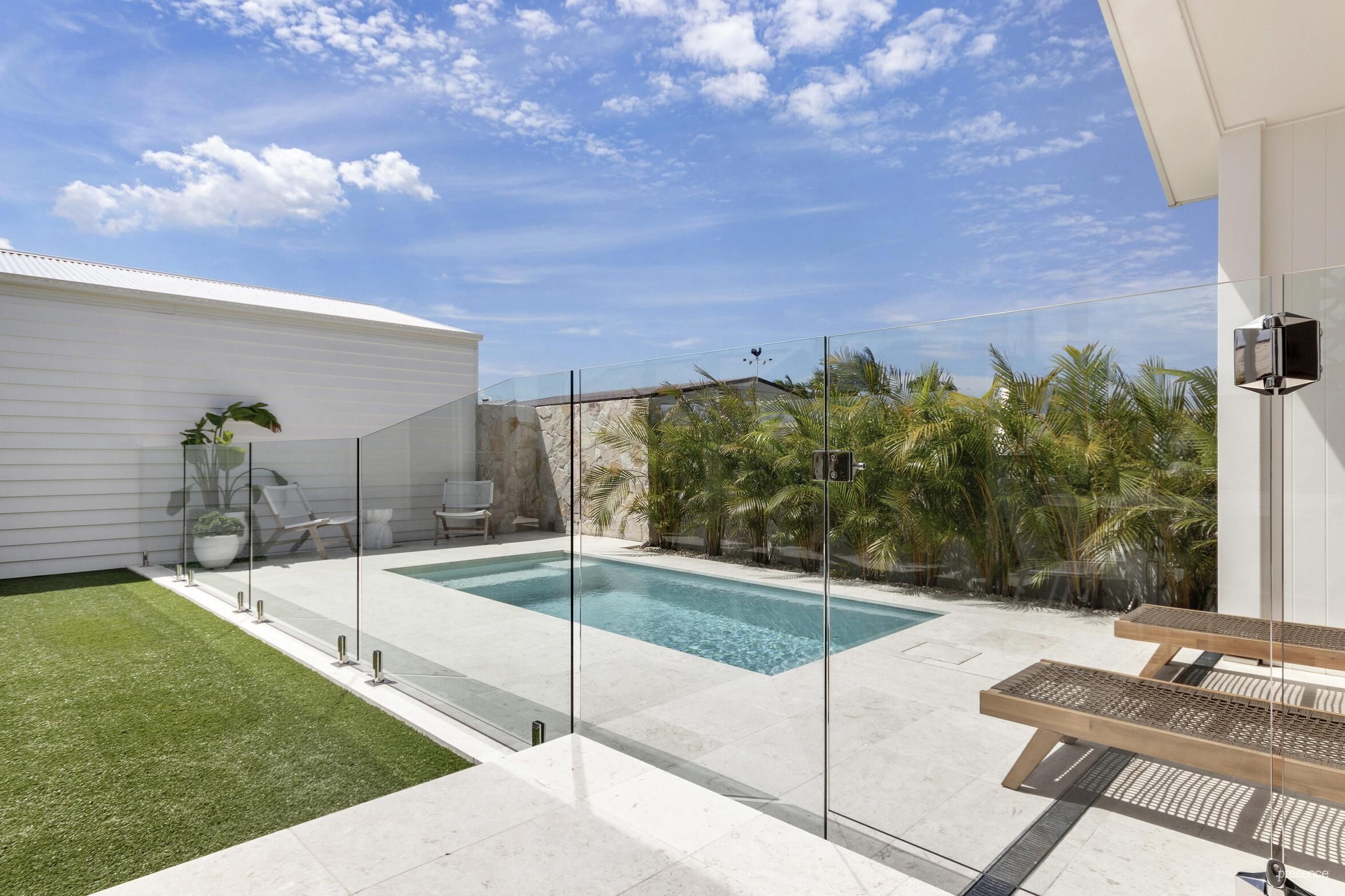 • Pristine pool with exquisite white paving, alongside a lawn area with tropical plantings, a covered alfresco and barbecue zone with wine fridge, promising endless summer fun.