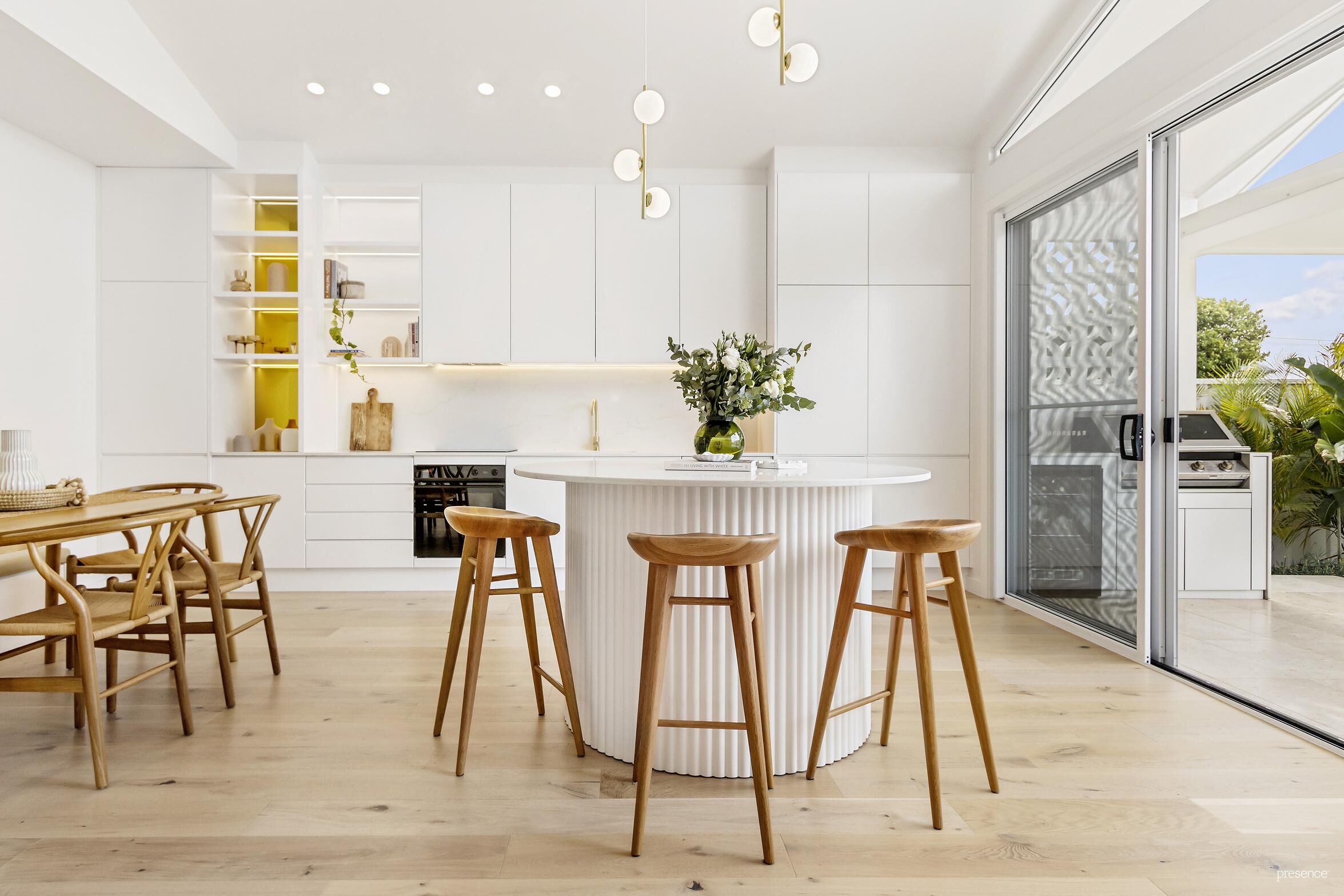 • Contemporary kitchen boasting quality appliances, ABI tap wear, an abundance of storage, a bespoke round kitchen island/bar, and custom-built booth seating in the dining area.
