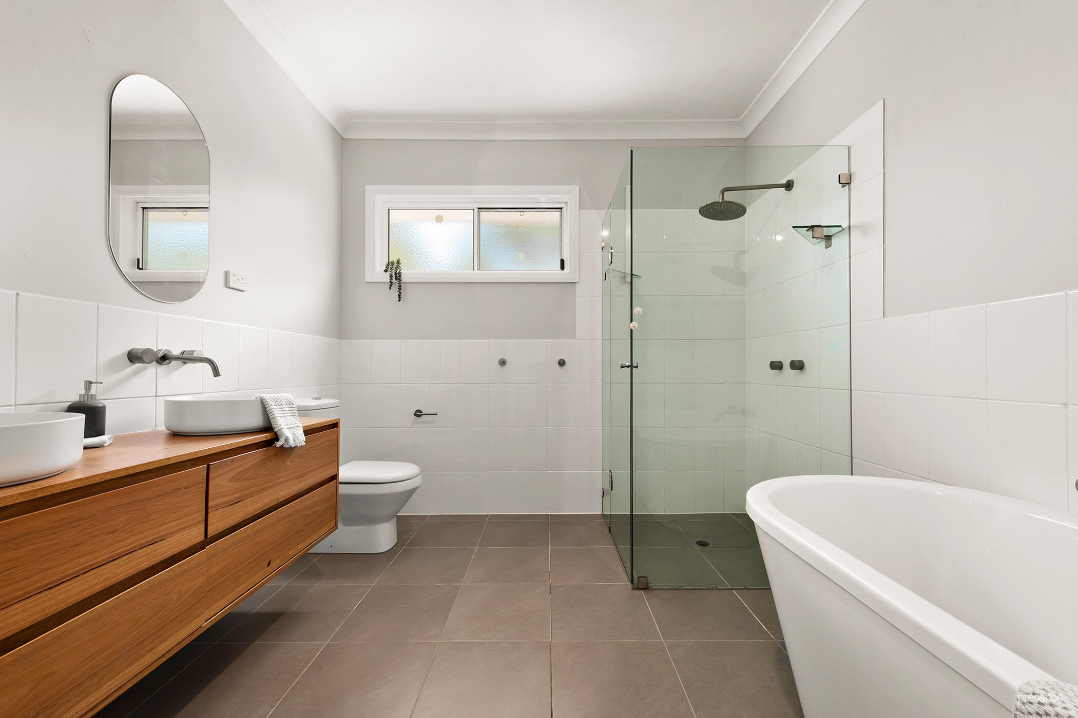 – Large renovated bathroom features modern free standing tub, floating timber double vanity and frameless shower