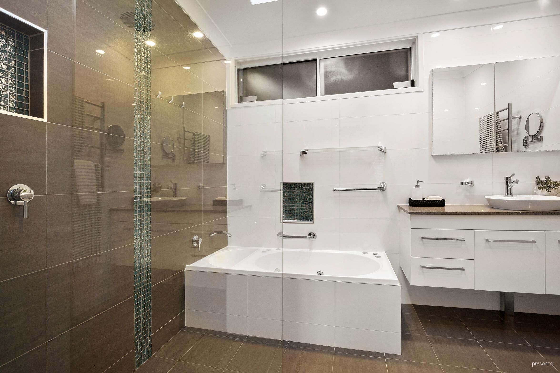 • Fully tiled bathroom with frameless glass shower, spa bath, Caesarstone vanity