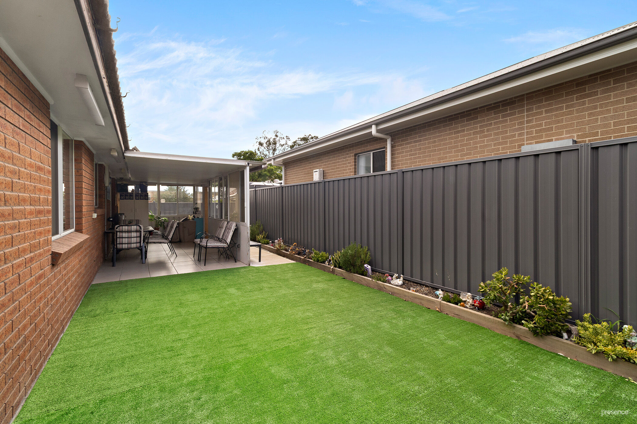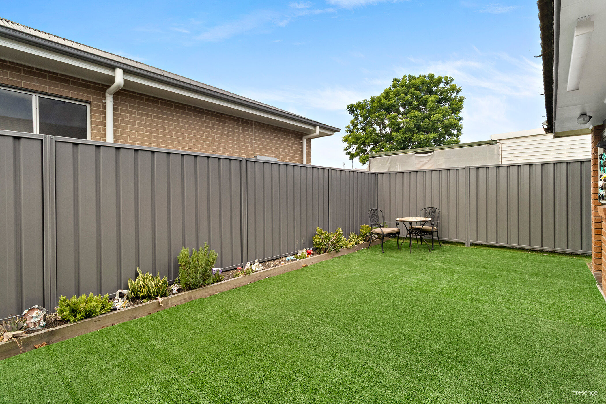 – Newly fenced low maintenance yard, laid with artificial lawn and bordered by easy-upkeep garden beds.