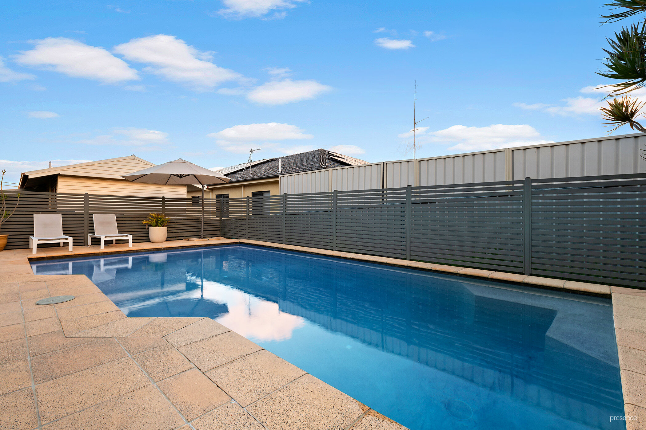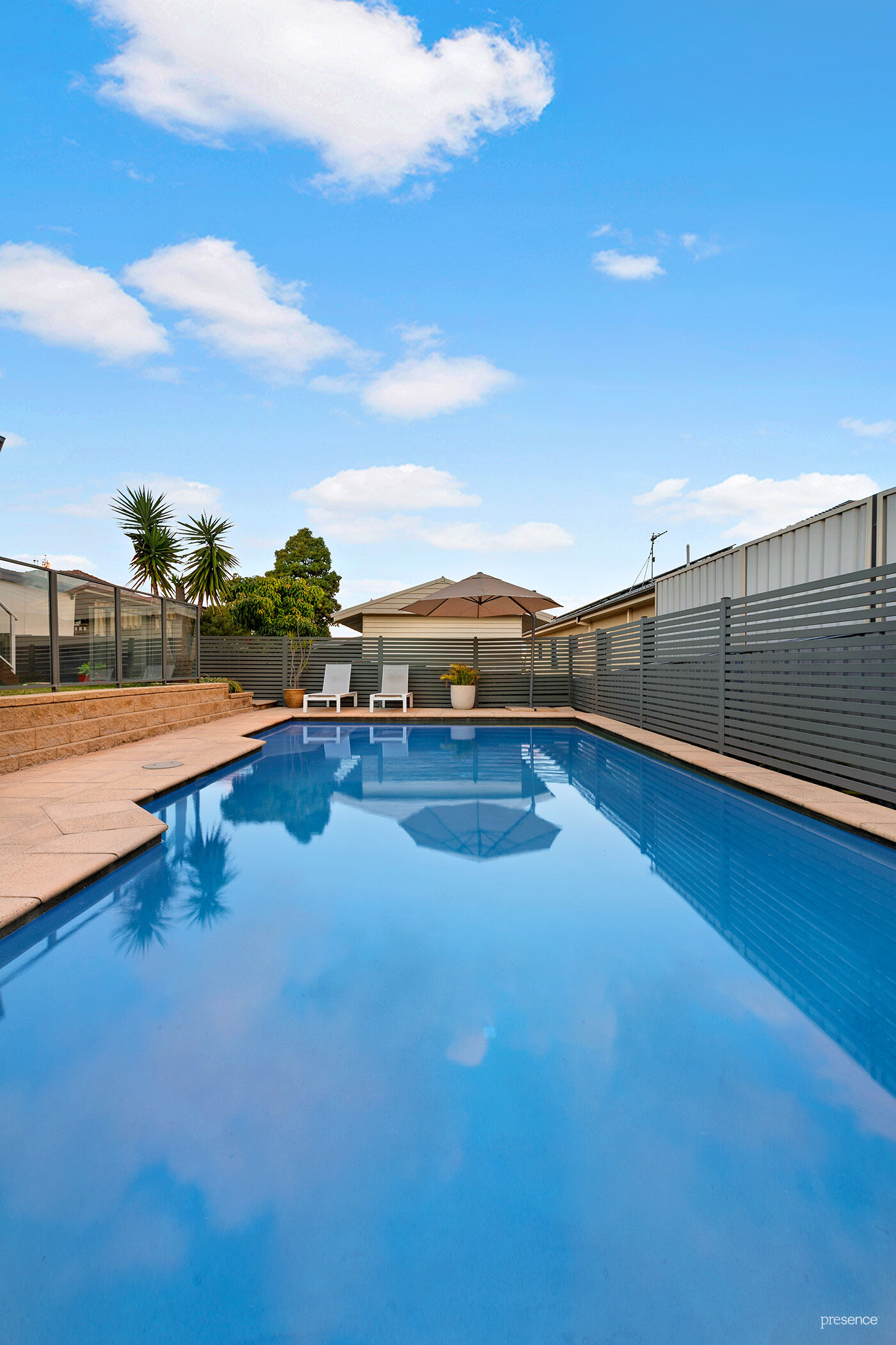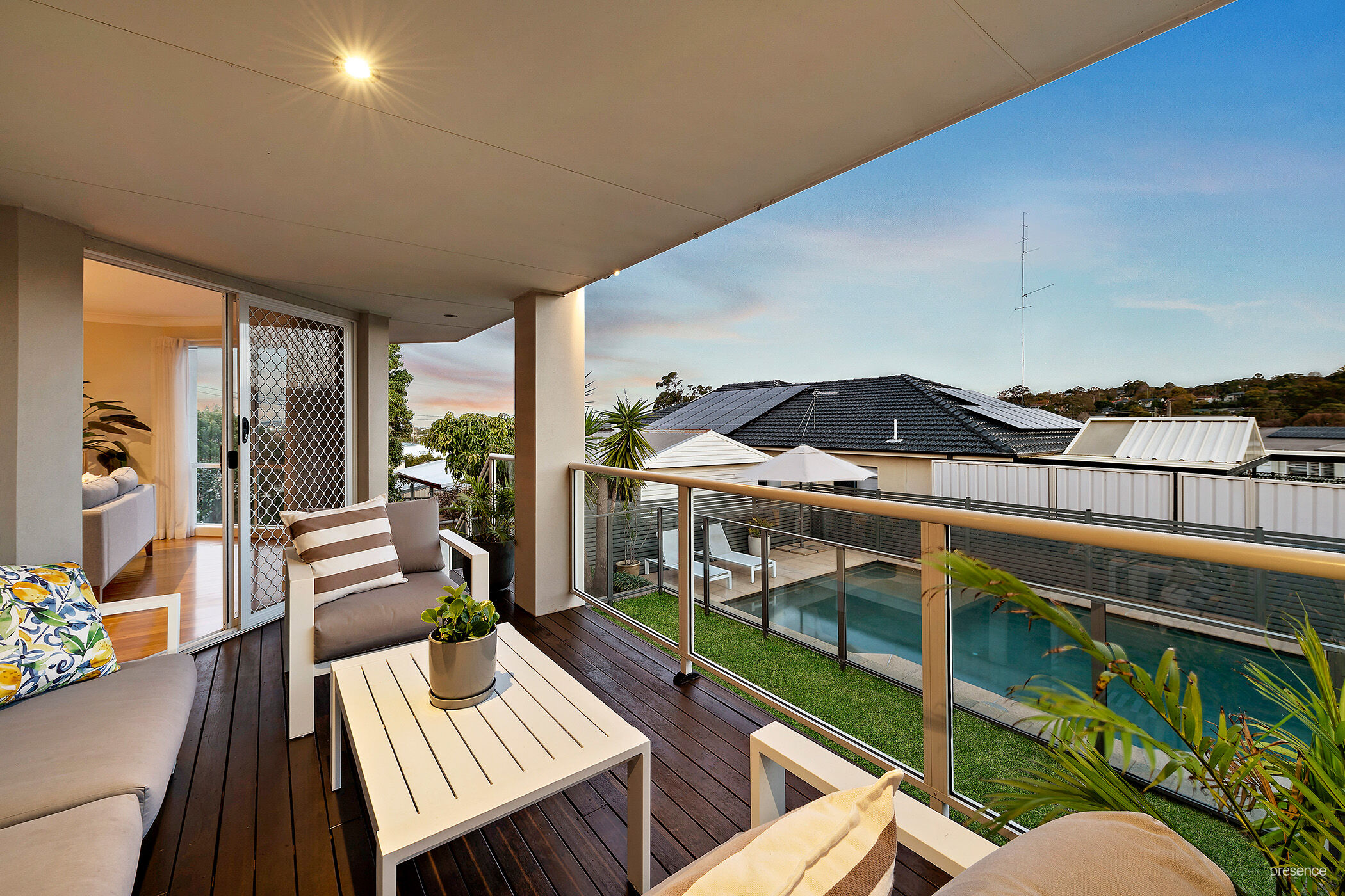 -Sparkling, solar heated, concrete saltwater pool with glass fencing adjacent to beautiful covered timber deck