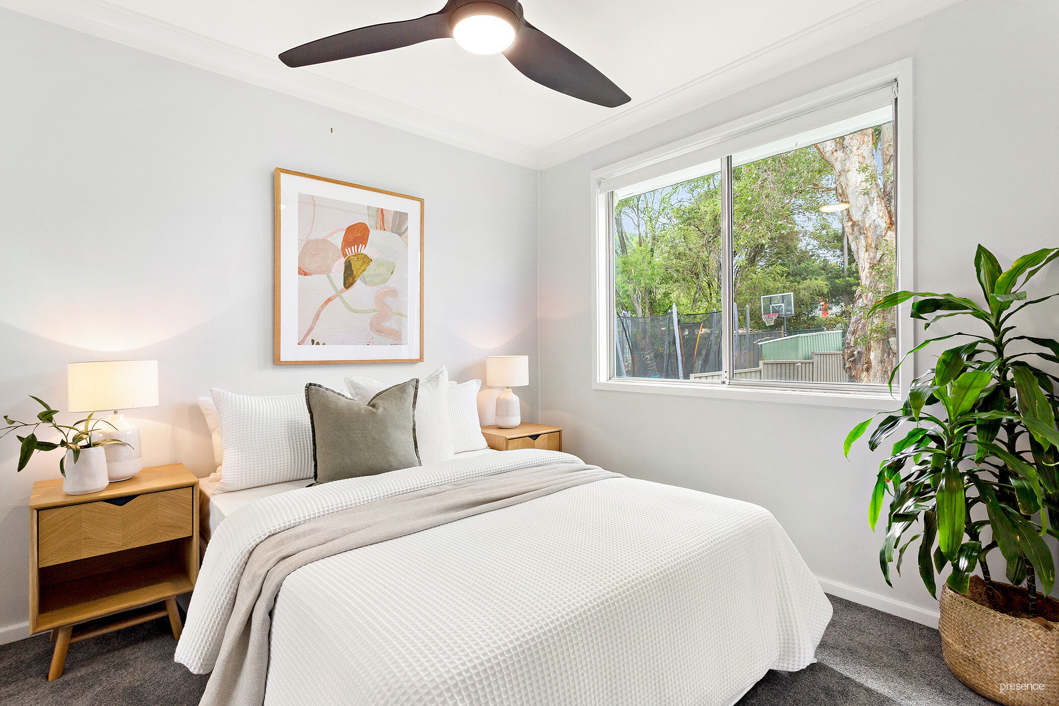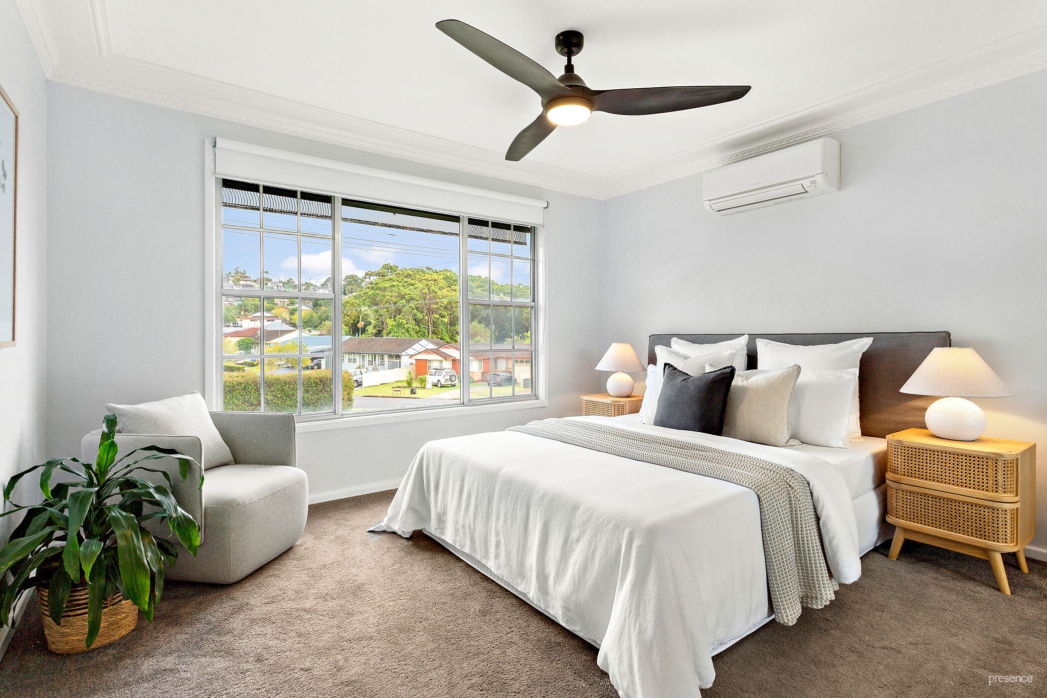 – Soft charcoal carpets underfoot in the bedrooms and chic black fan and light combos overhead