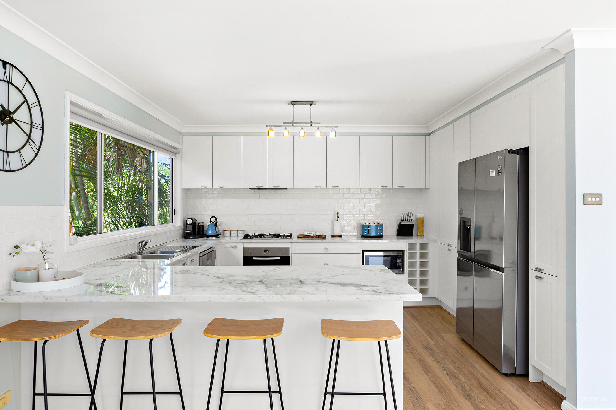 – Divine kitchen with sleek subway tiles, soft close drawers, tonnes of cupboard and pantry space, built-in wine racks and a view across the pretty back yard