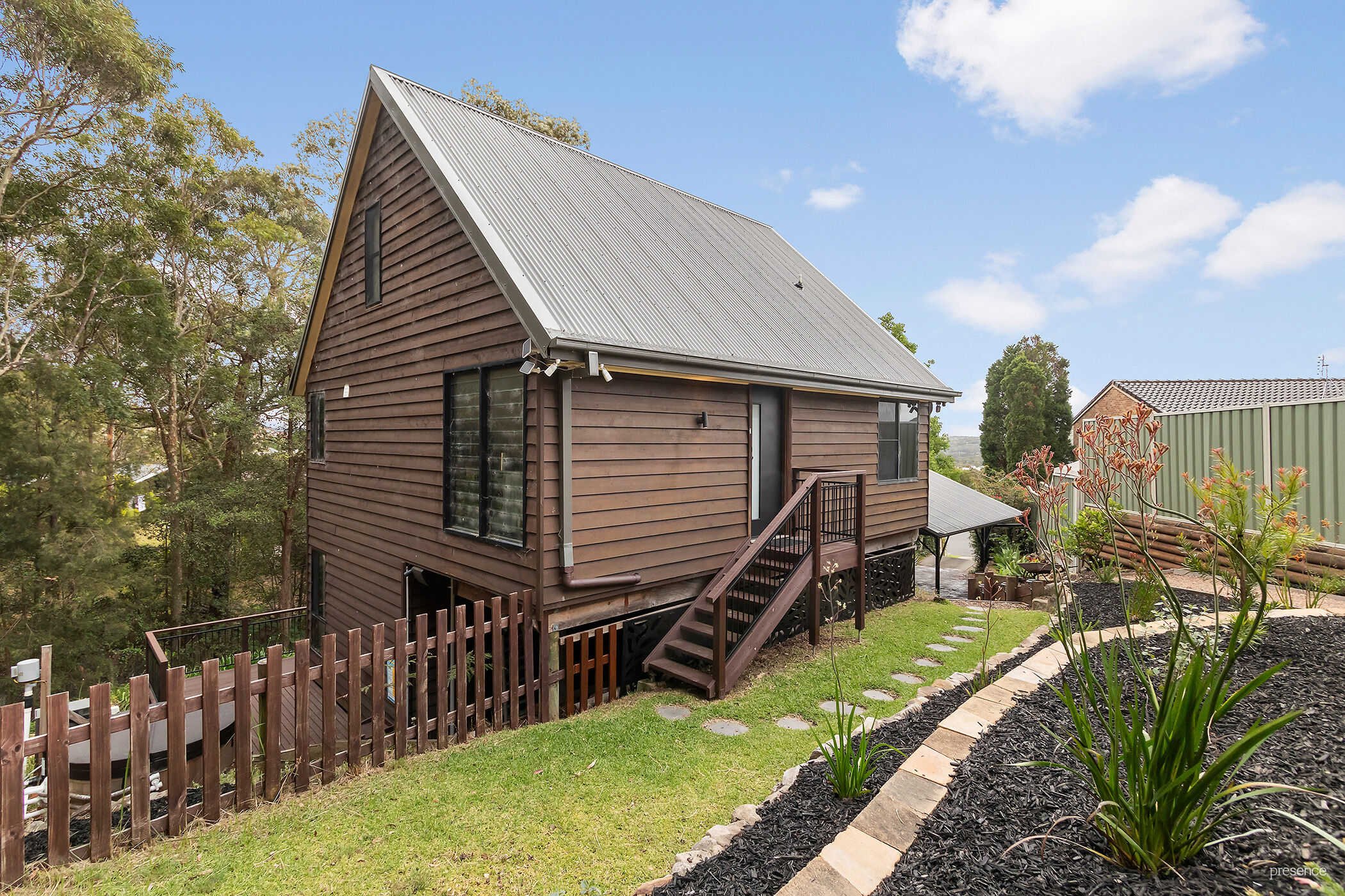 Picture this: You return home after a busy day at work, parking your car in the newly installed double carport. You effortlessly access your home through the remote security device and make your way to the sleek kitchen, complete with a hidden bar, to grab yourself a nice cold one. Stepping out onto the verandah, you breathe in deeply, serenaded by the harmonious sounds of bellbirds, kookaburras, and butcher birds calling to you from the neighbouring bushland. As the evening chill sets in, you grab a towel and your cossie and descend to your private and cozy 6-seater gas-heated hot tub. You dial up the bubbles, indulging in a soak while surrounded by your secluded bush paradise. Ahhh…