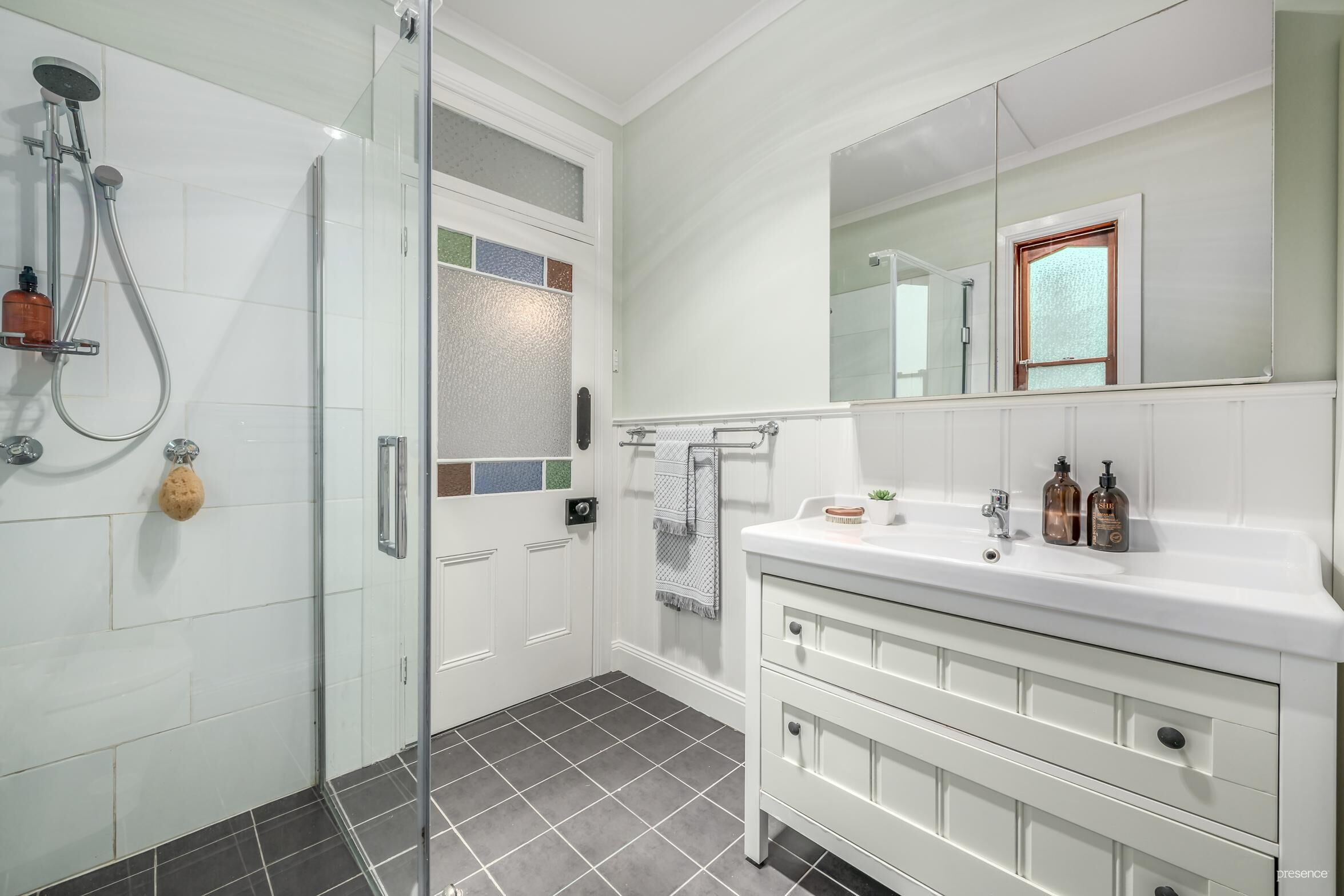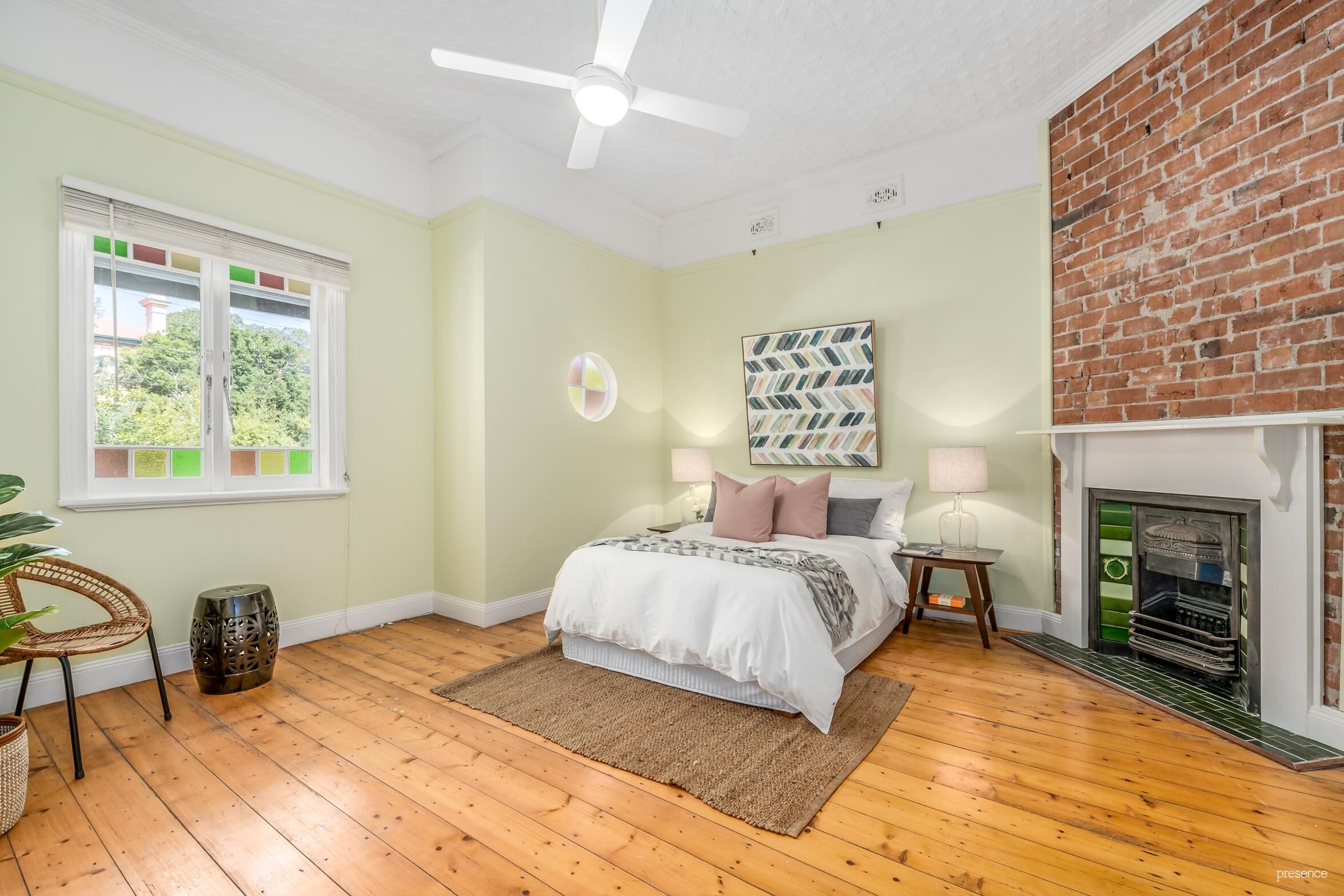 – Pressed metal ceilings, picture rails, coloured glass windows & fireplaces add charm