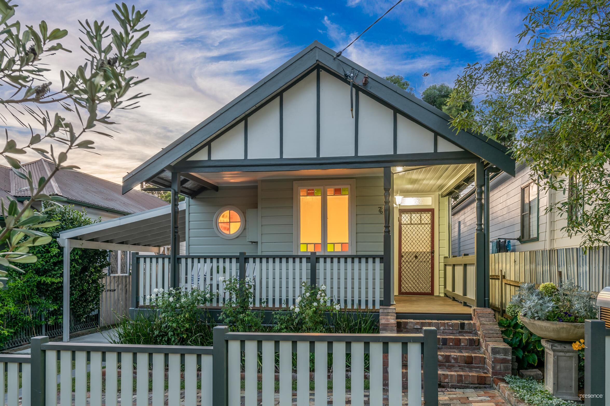 Landscaped gardens, with beautiful white roses in full bloom, and a sun-splashed front verandah welcomes you inside to a canvas of timber floors, high pressed metal ceilings and simple, neutral decor. A gun-barrel hallway features three generously sized bedrooms before the living and dining room gives way to the spacious kitchen and family living area. Here, timber benchtops, a butler’s sink and gas stove come together in a display of stylish design before French doors open to the rear deck where you can relax or entertain alfresco.