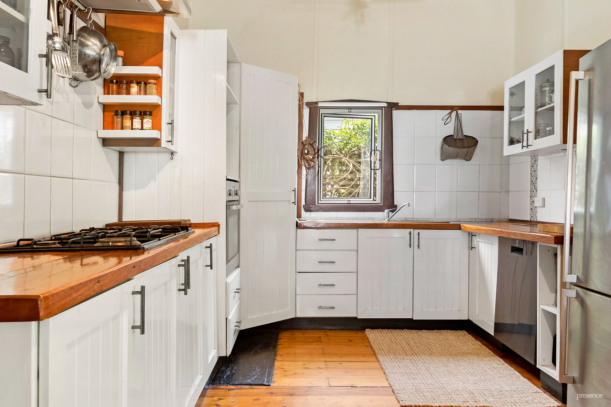 – Timeless white and timber kitchen with tiled splashback, stainless steel appliances, a large corner pantry and plenty of bench and cupboard space.