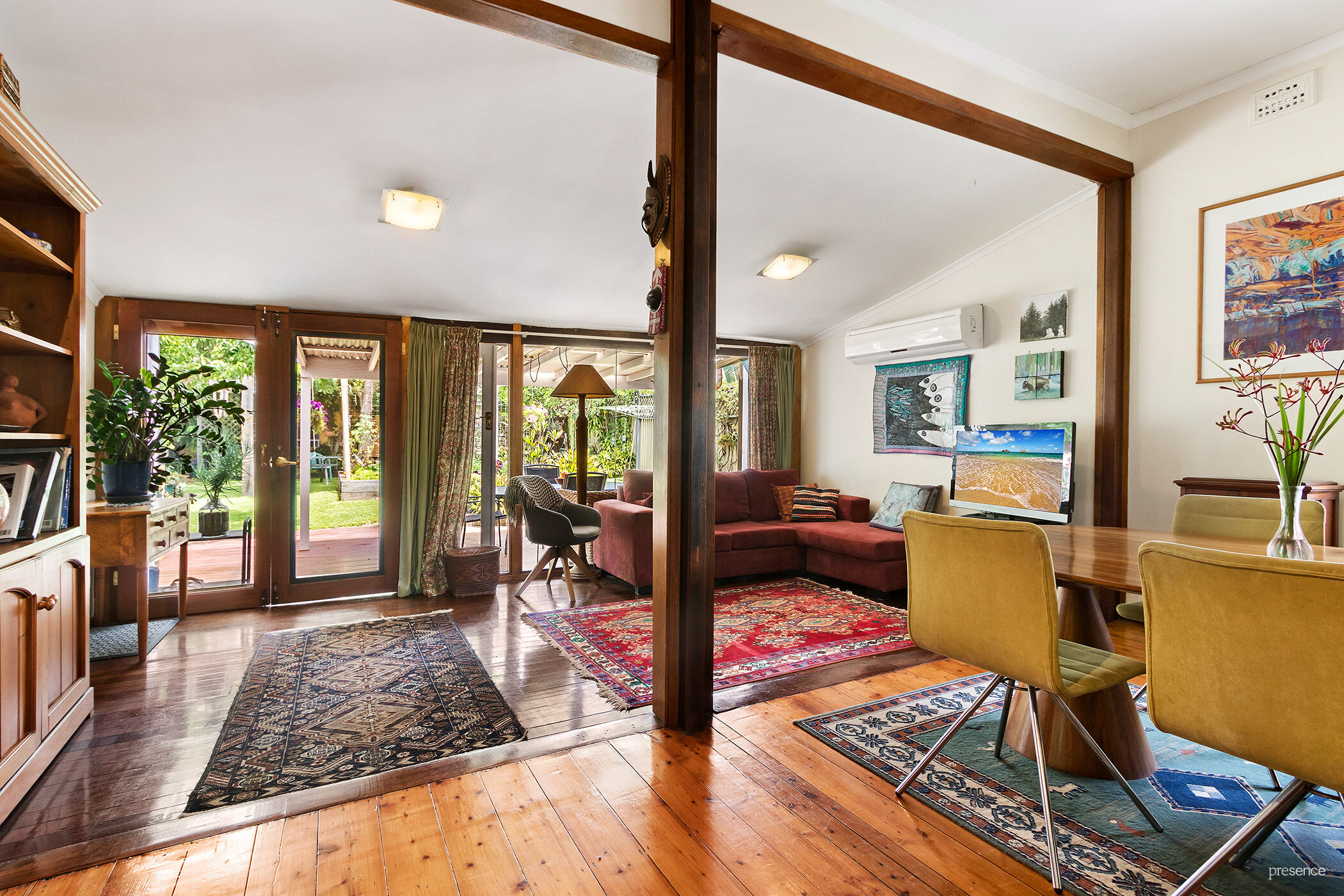 – A choice of outdoor seating spaces includes the north-facing front verandah, rear covered patio and deck, as well as a north-facing deck off the studio.