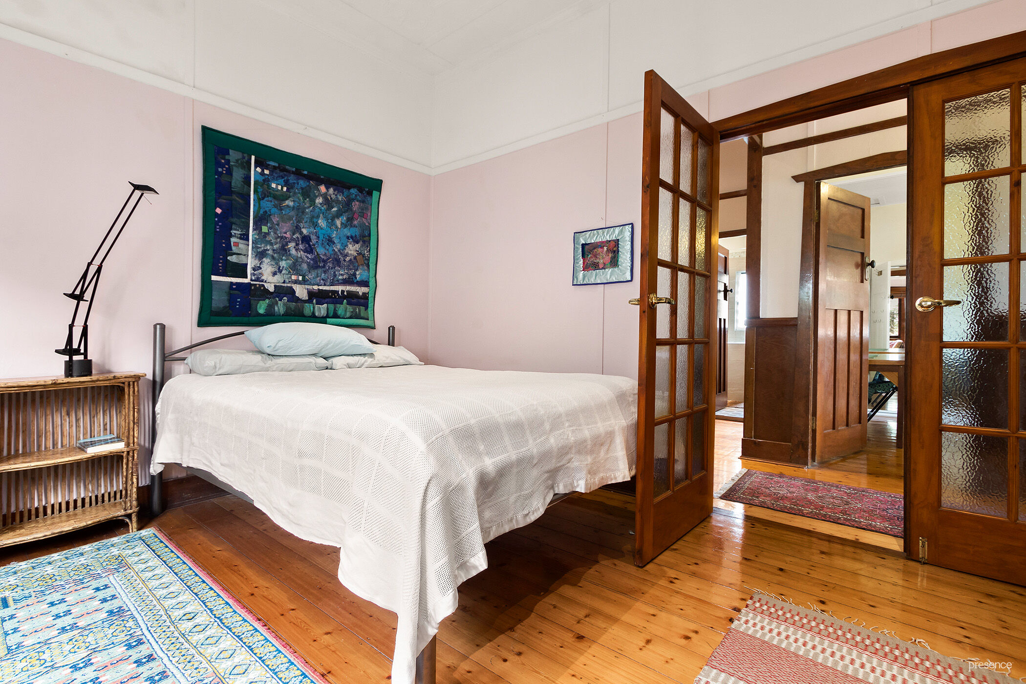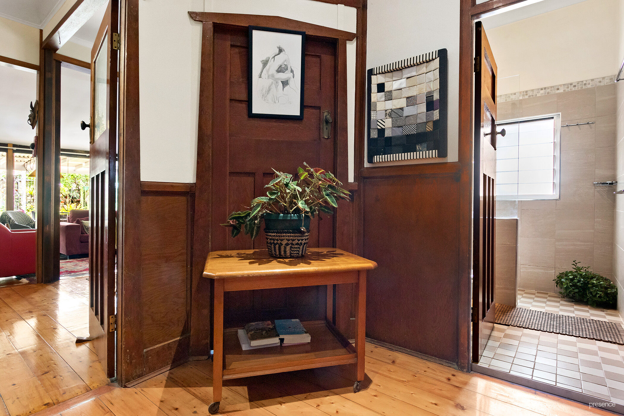 As you enter the hallway, past the elegant front door with transom window, you look up to admire the ornately decorated plastered ceiling and fretwork as well as appreciate the many other elegant features of its era, including honey polished boards, soaring ceilings, picture rails and wood paneling, as well as ornate door surrounds and casement windows adorned with decorative architraves.
