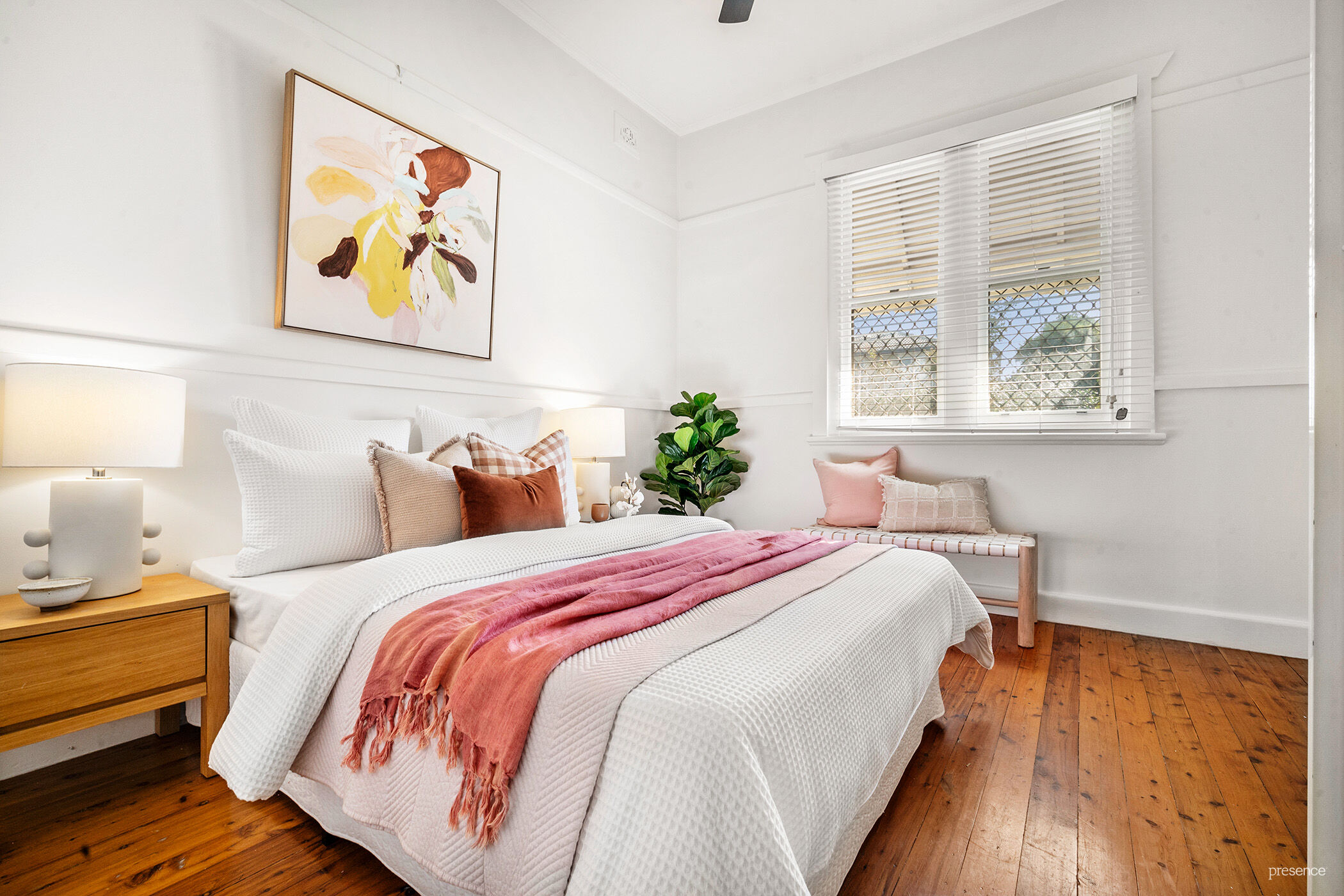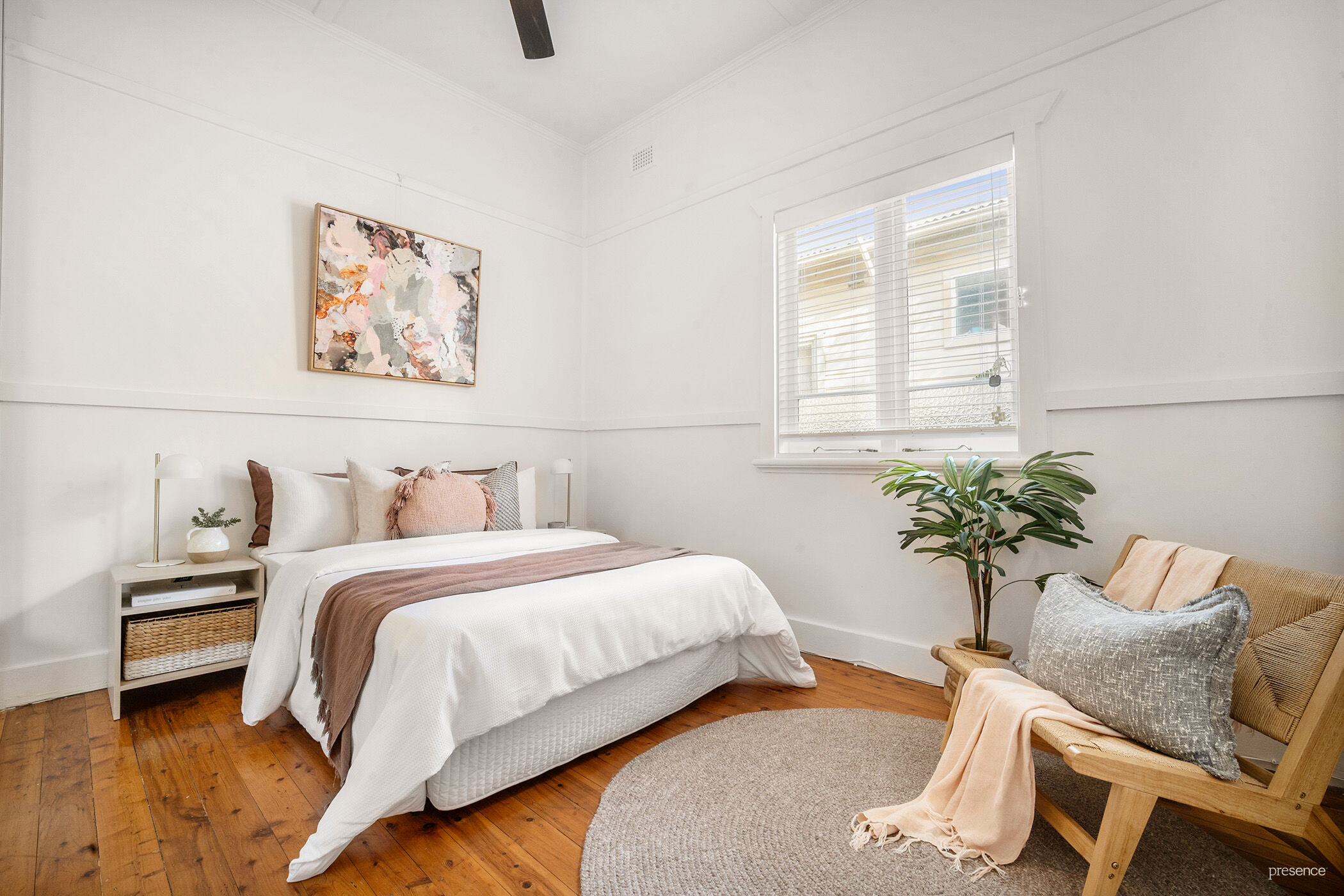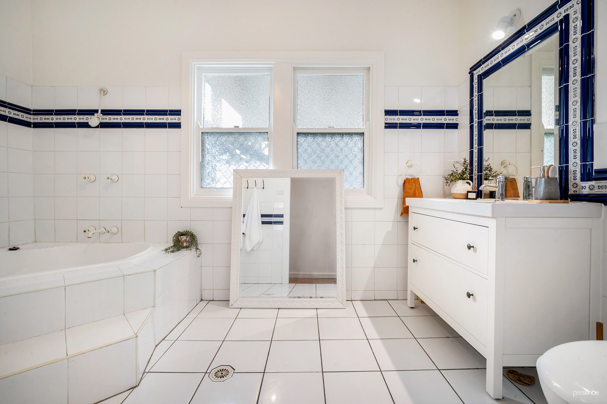 Inside, you’ll find three spacious bedrooms beautifully showcasing the high ceilings and expansive proportions typical of its era. Each is equipped with fans for comfort, while two feature convenient built-in robes. The central bathroom is in keeping with the home’s lovely heritage details and boasts a deep corner bath with a shower, the perfect spot for at home spa days or just soaking up the vibes.
