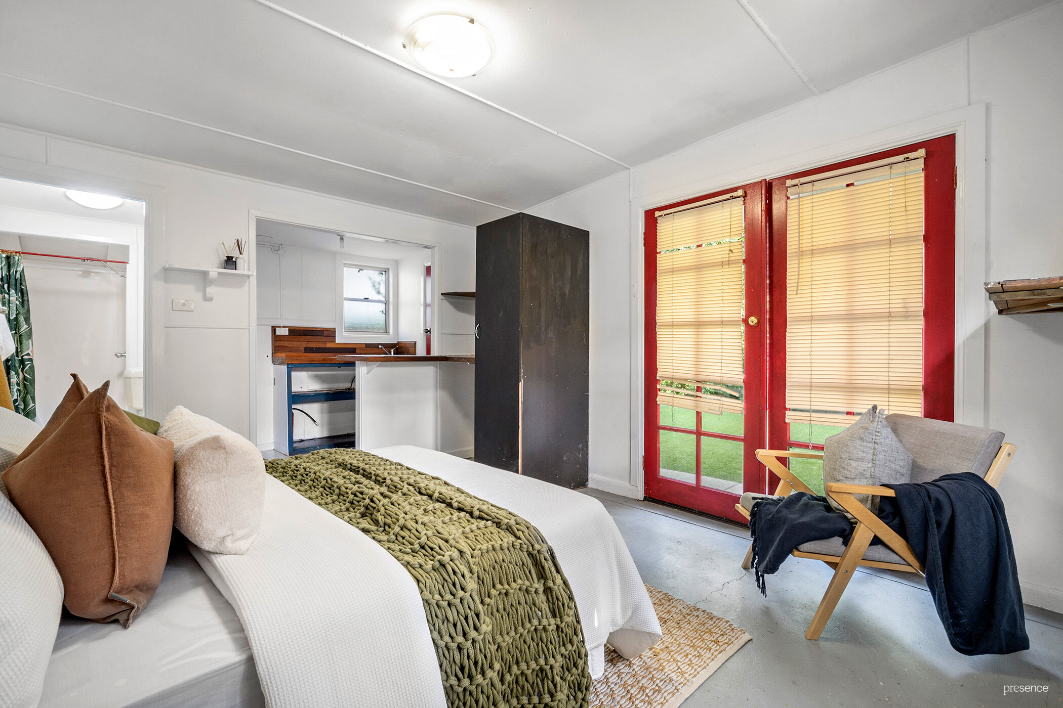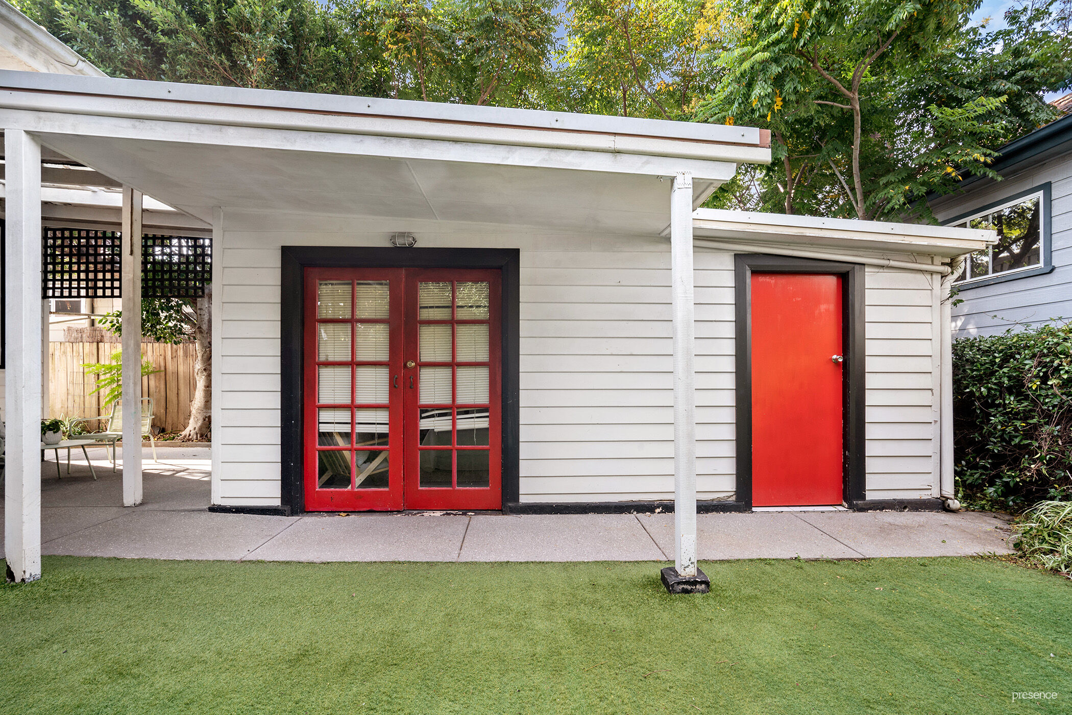 On balmy afternoons, the enchanting French doors open from the family room onto a covered alfresco area, ideal for outdoor dining and lazy lounging. Synthetic turf and high privacy hedging here ensure easy maintenance and seclusion. Here, a sweet studio with bathroom facilities offers a versatile space for a home office, studio, or hobby room. Large double gates reveal a carport designed in harmony with the home’s heritage style. This spacious carport provides ample undercover off-street parking and features a welcoming portico for ferrying your shopping into the home, no matter the weather.