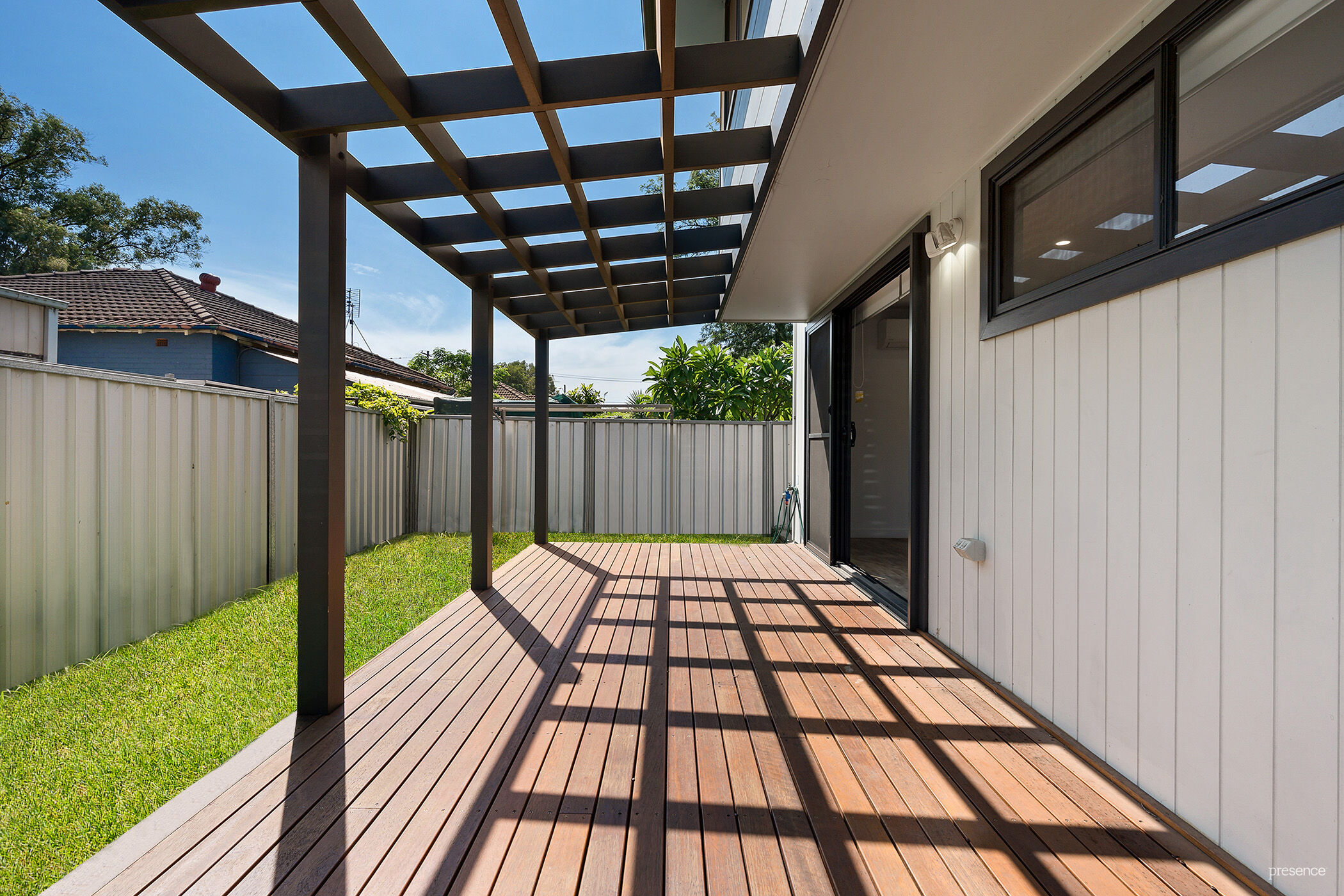 – Light-filled open plan living/dining area with sliding doors to deck and yard