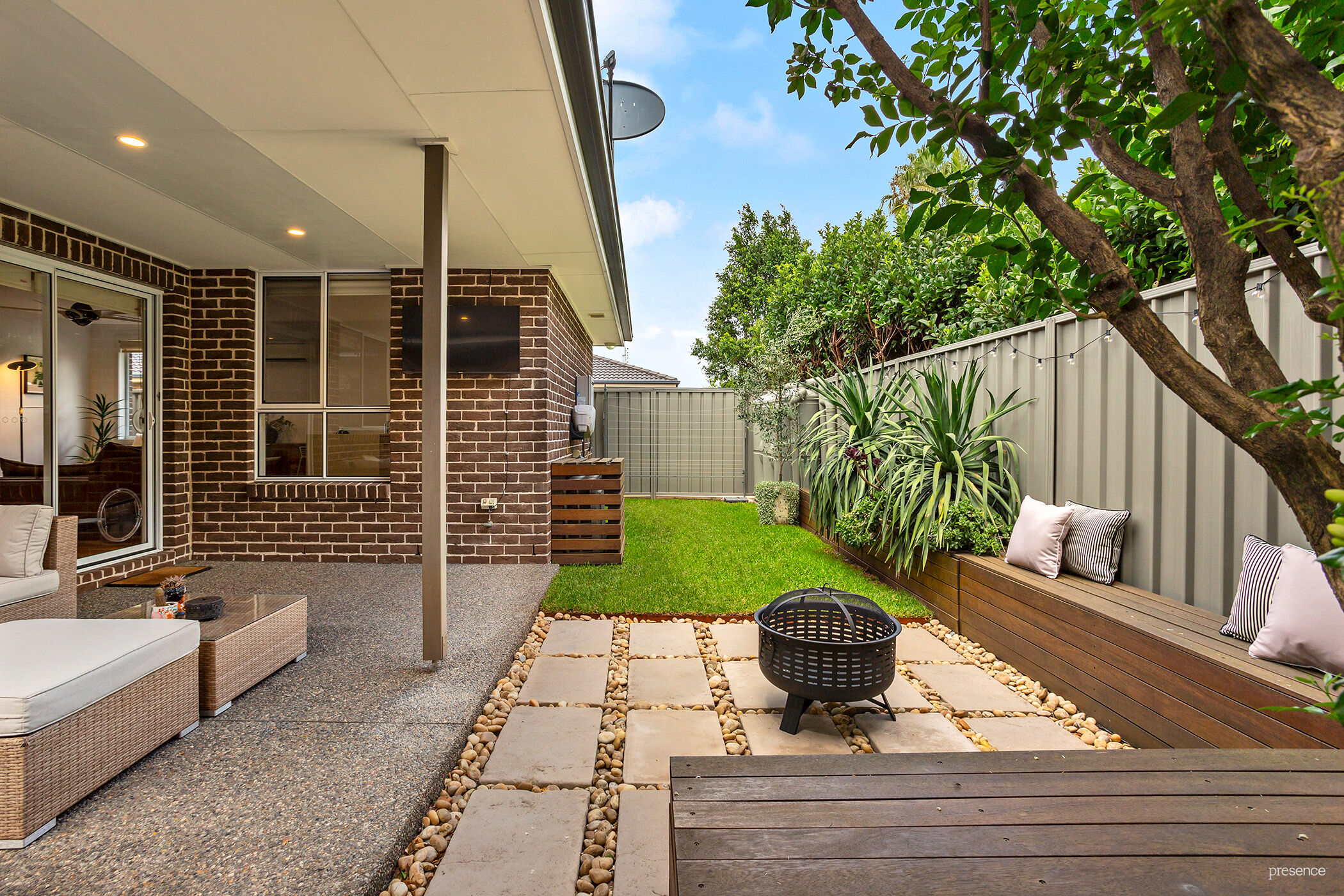 – Private covered outdoor entertaining area, featuring a sunny paved patio with built-in seating, a lush lawn, and a convenient clothesline.