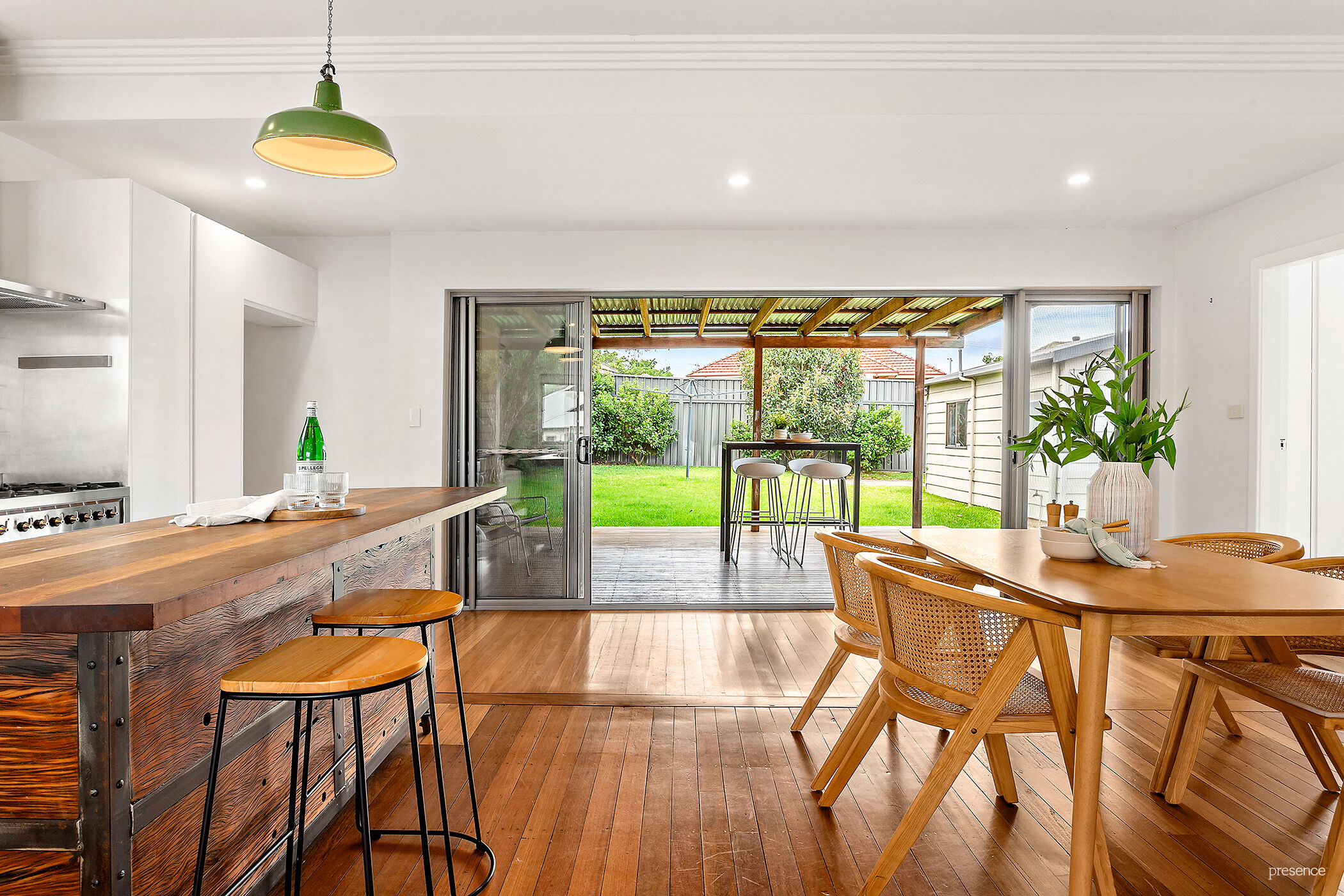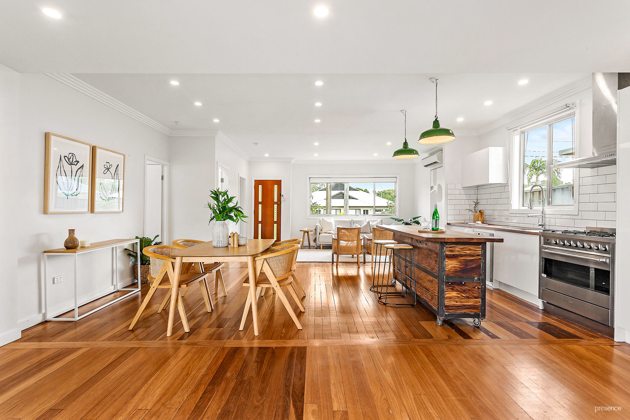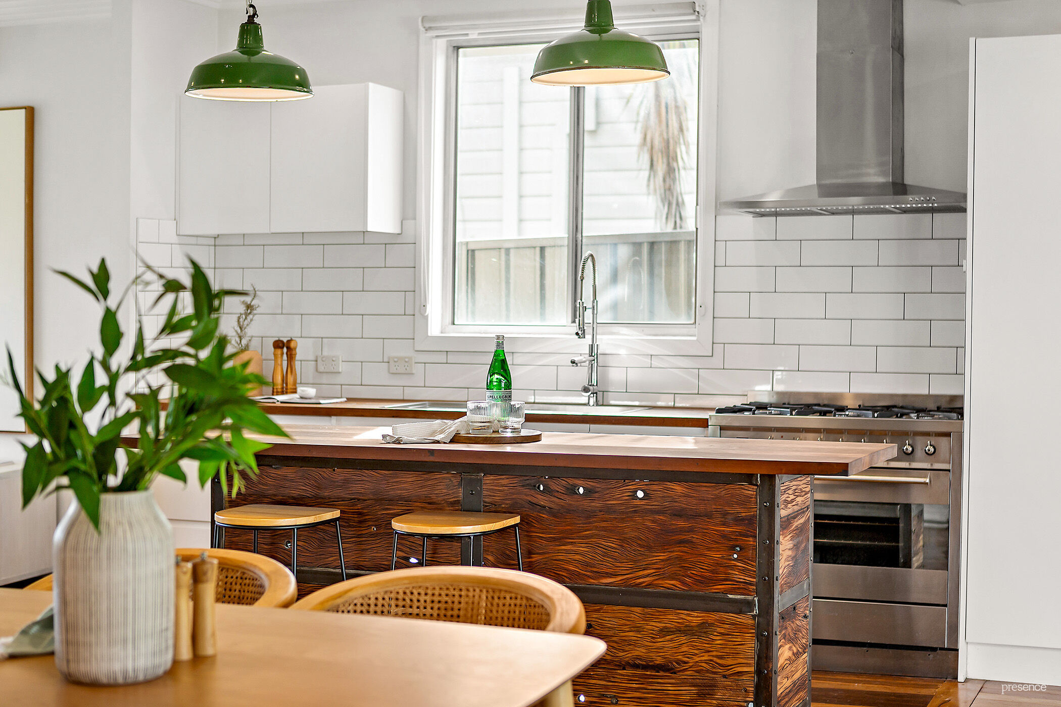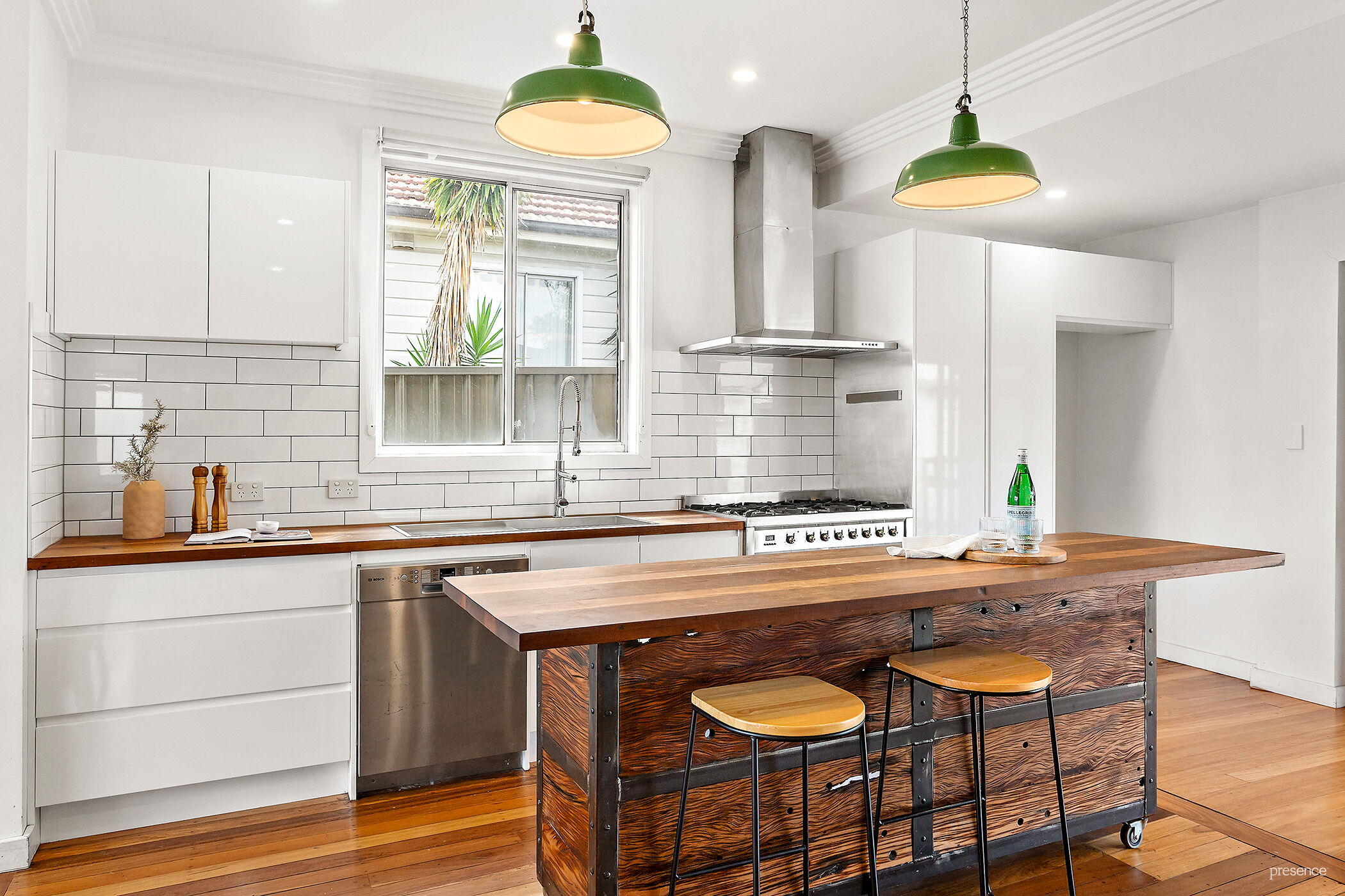 – A sleek custom kitchen including premium Smeg 600mm freestanding oven with 6 burners, a Bosch dishwasher, double pantry, unique industrial pendant lights and for the pièce de résistance, a custom mobile island bench with open shelving.