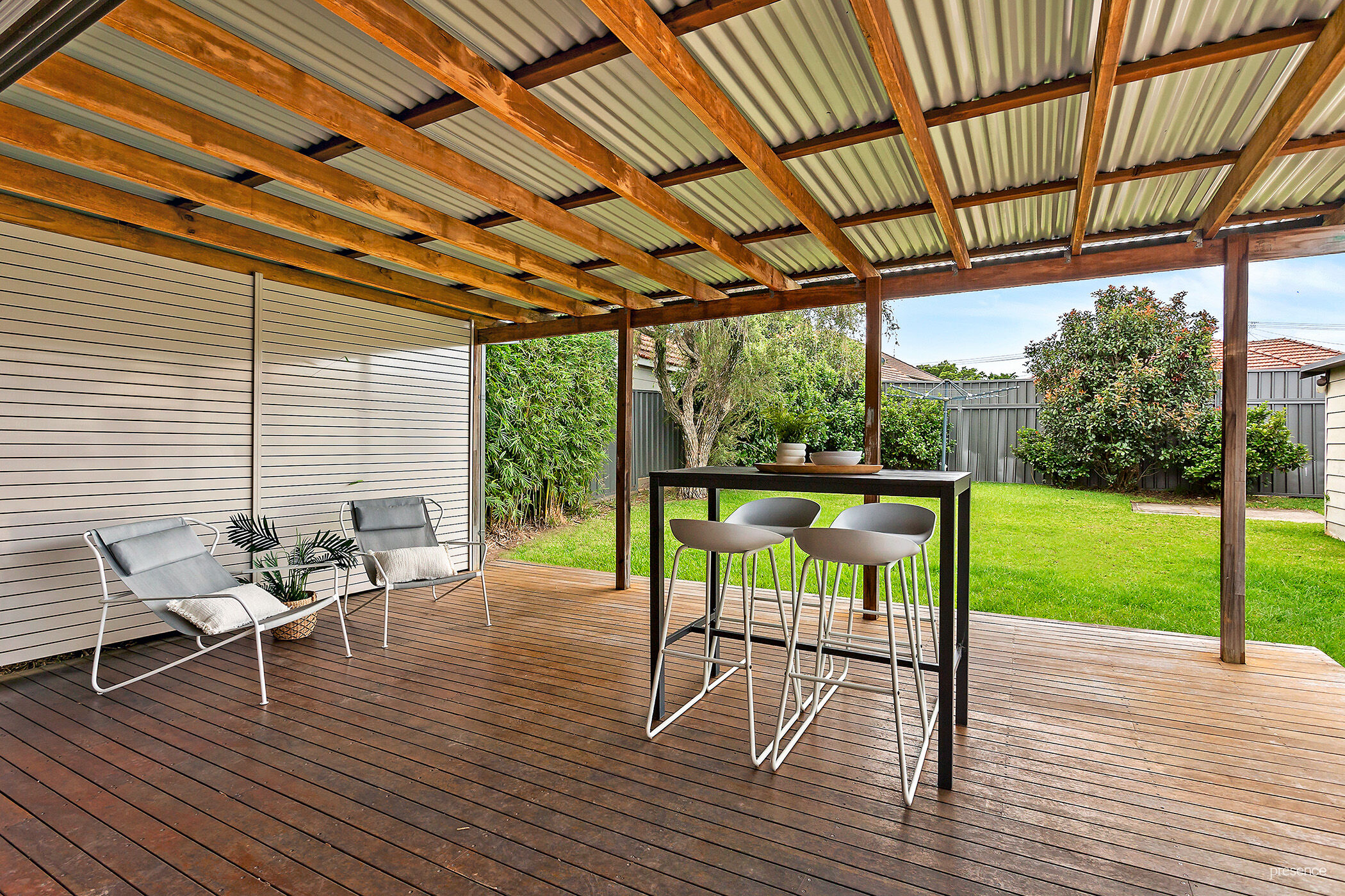 – An expansive covered alfresco deck, a private fully-fenced rear yard, as well as a charming front porch, lush lawns, and flourishing gardens.