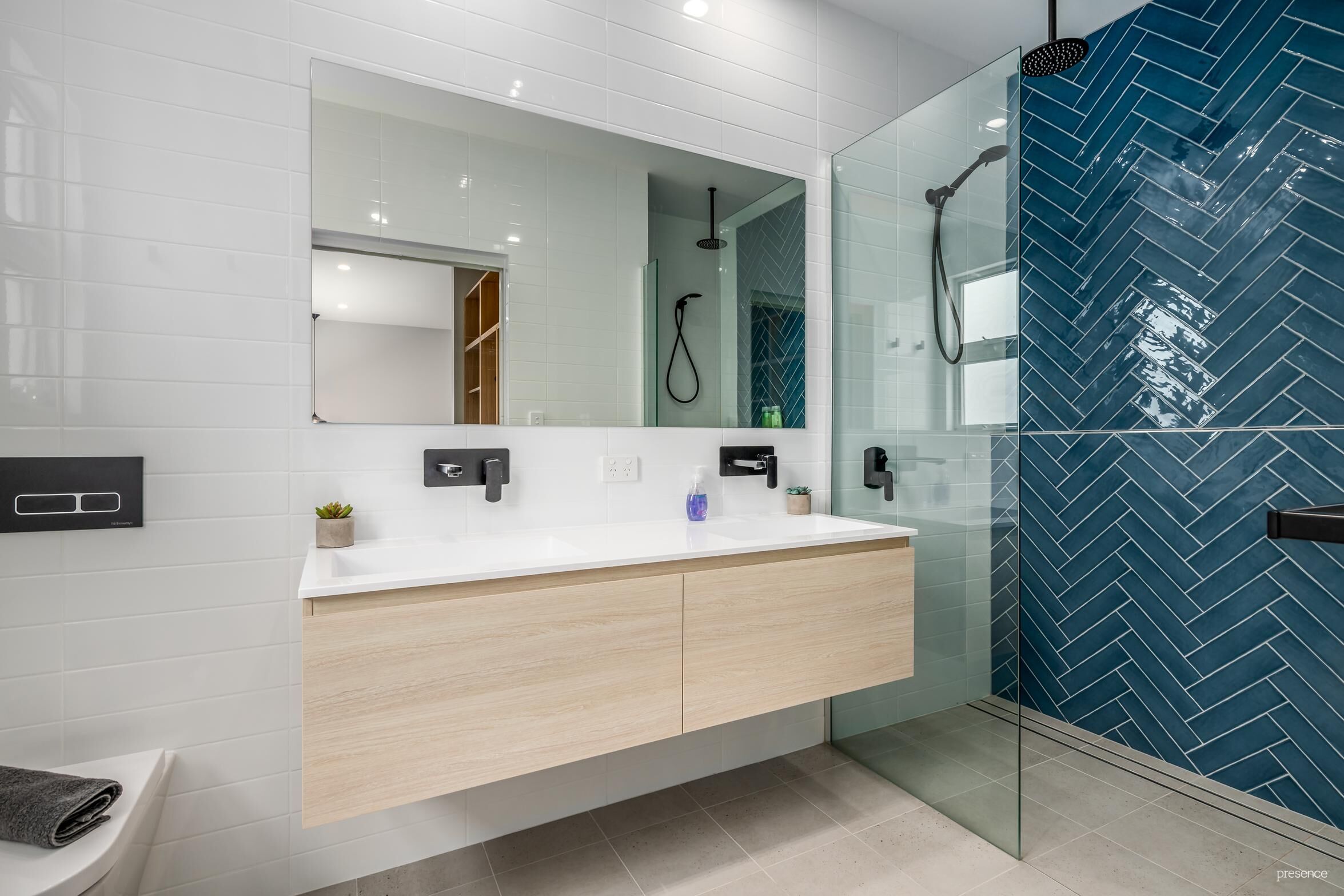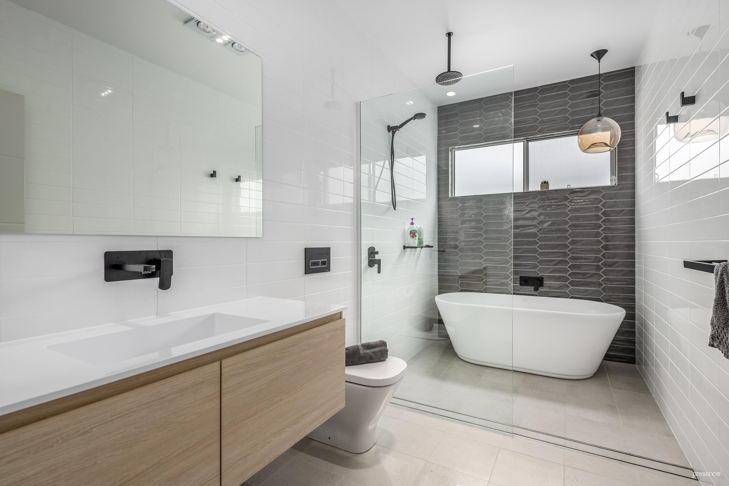 – Master ensuite with frameless double shower and dual vanity; main bathroom with freestanding bath and large shower plus ground floor bathroom all with floor to ceiling tiling and matte black tapware