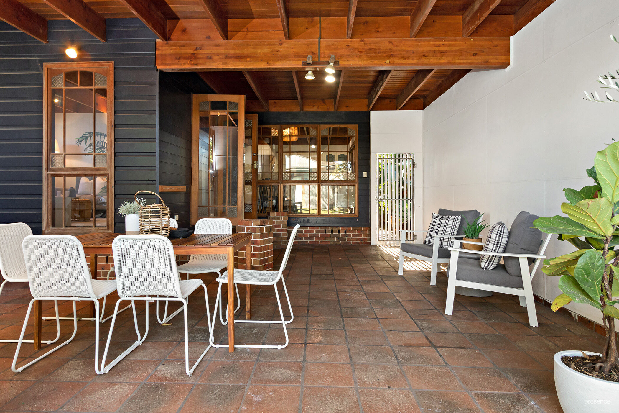 – French doors open to large covered alfresco entertaining space overlooking lawn
