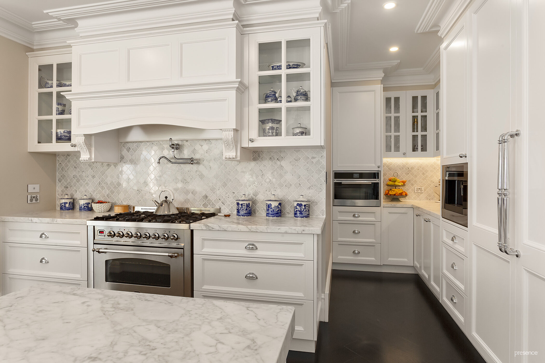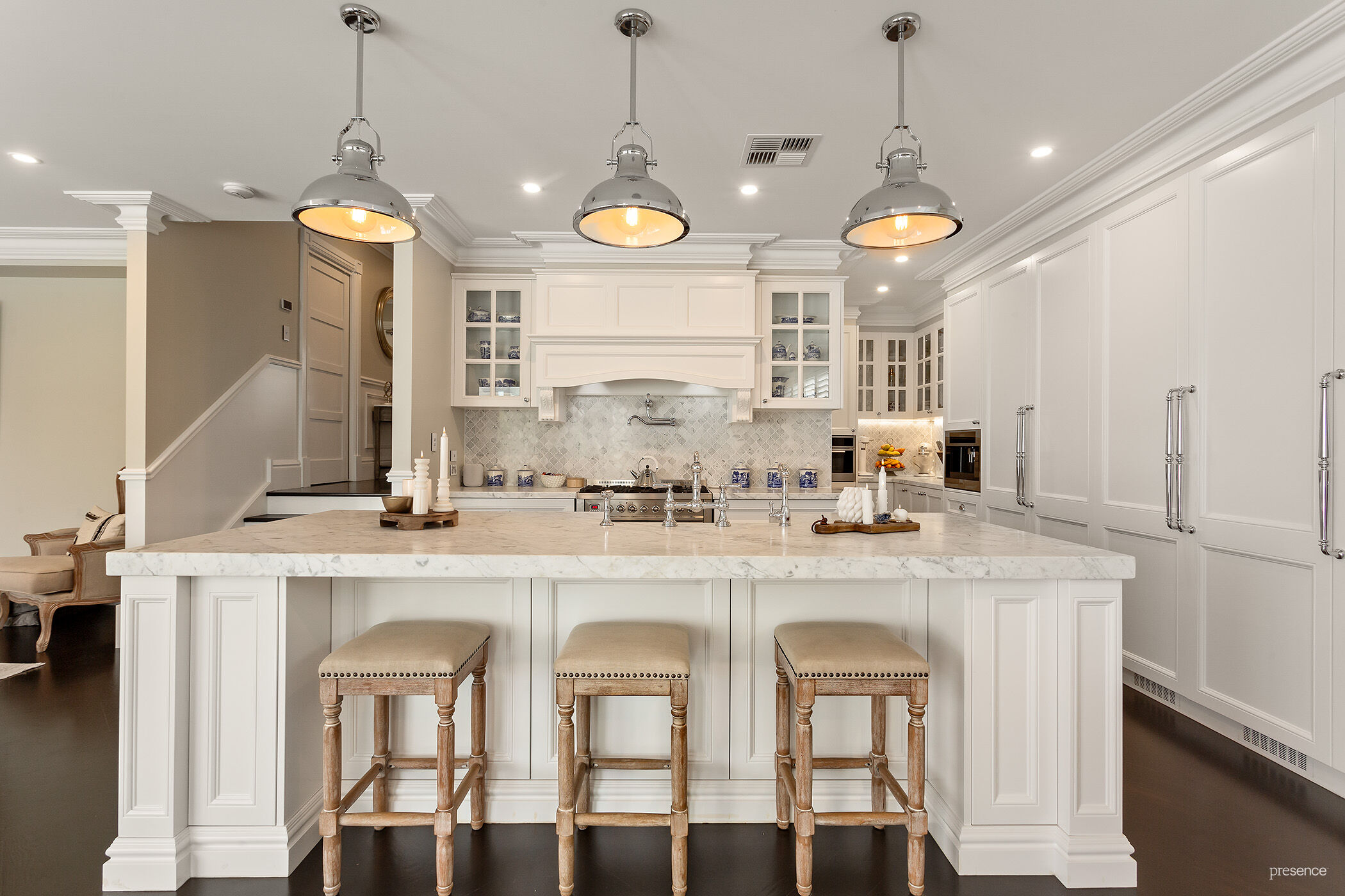 – Custom island kitchen and butler’s pantry features Ilve 6 burner gas stove, steam oven, coffee machine, integrated Liebherr integrated bar fridge and wine fridge