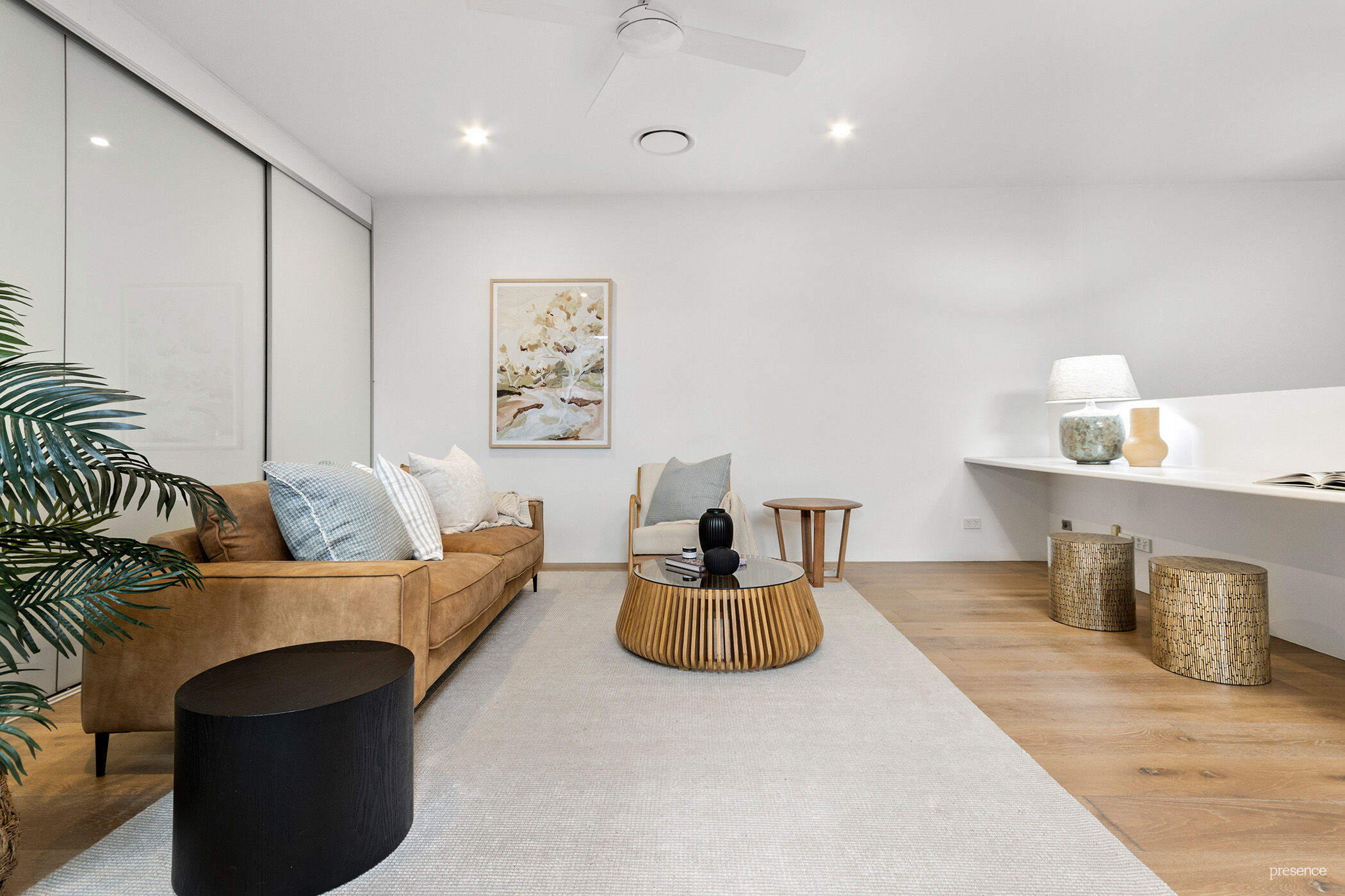 Privately tucked away, discover five-bedroom accommodation on the upper level, complemented by a master ensuite, family bathroom, and a rumpus room featuring a study nook, discreet TV area, and seamless access to a private courtyard garden. Additional features such as an executive home office, guest powder room, 5kw solar electricity panels, and solar hot water enhance the overall level of comfort and elegance.