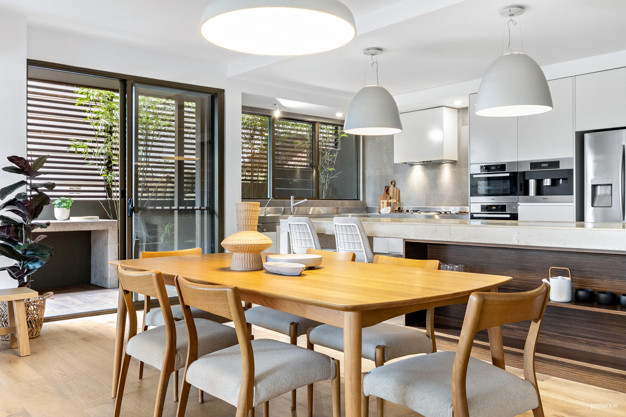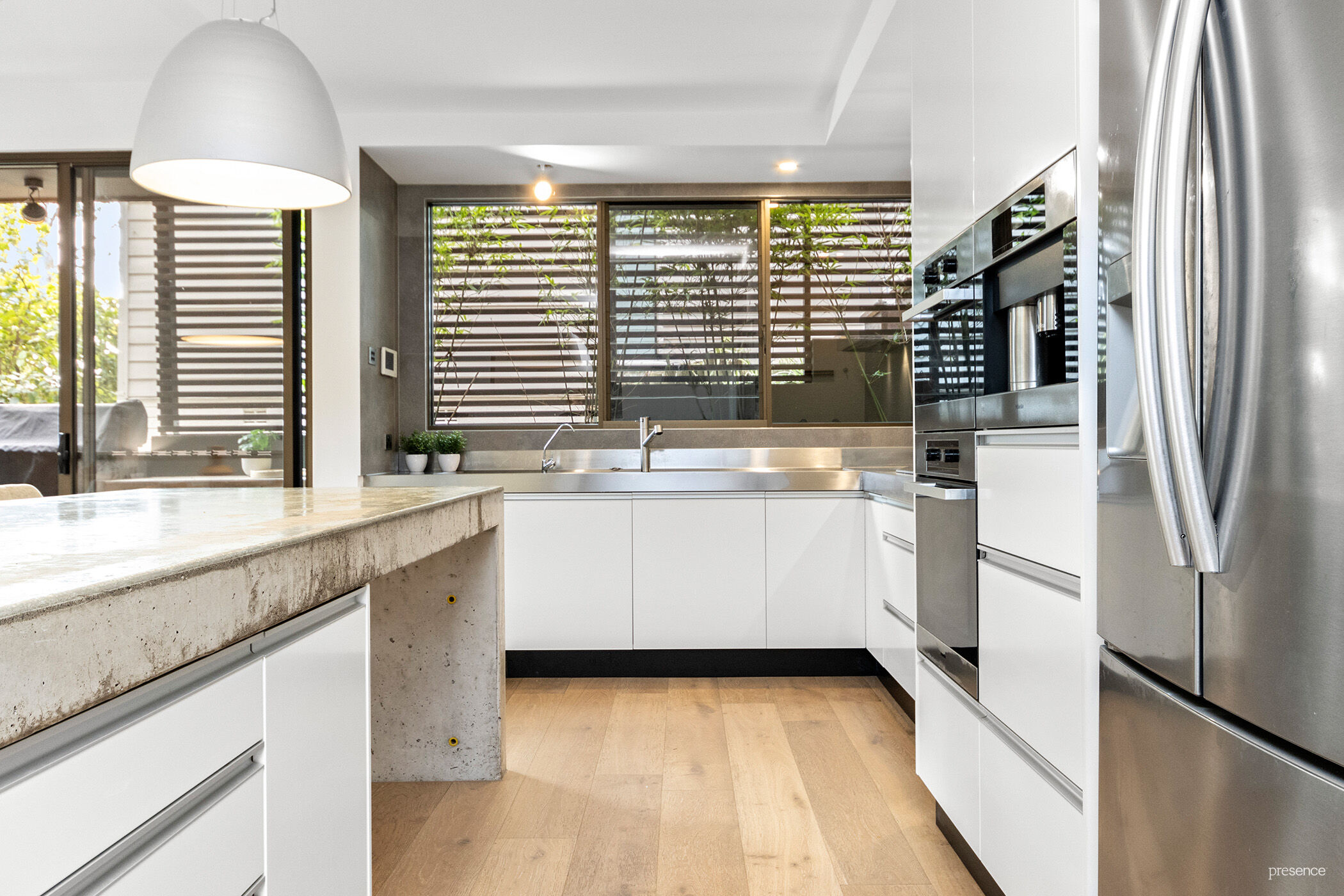 Ascend the stairs to uncover the heart of this residence: an expansive open-plan living area. Infused with warmth and elegance, this space features European oak floors and a gas fireplace. The focal point of this inviting space is the bespoke kitchen, boasting a striking 4m concrete island. More than just a kitchen, it’s a statement piece, perfect for family gatherings and culinary adventures. Equipped with a full set of Miele appliances, cooking and entertaining become effortless and enjoyable.