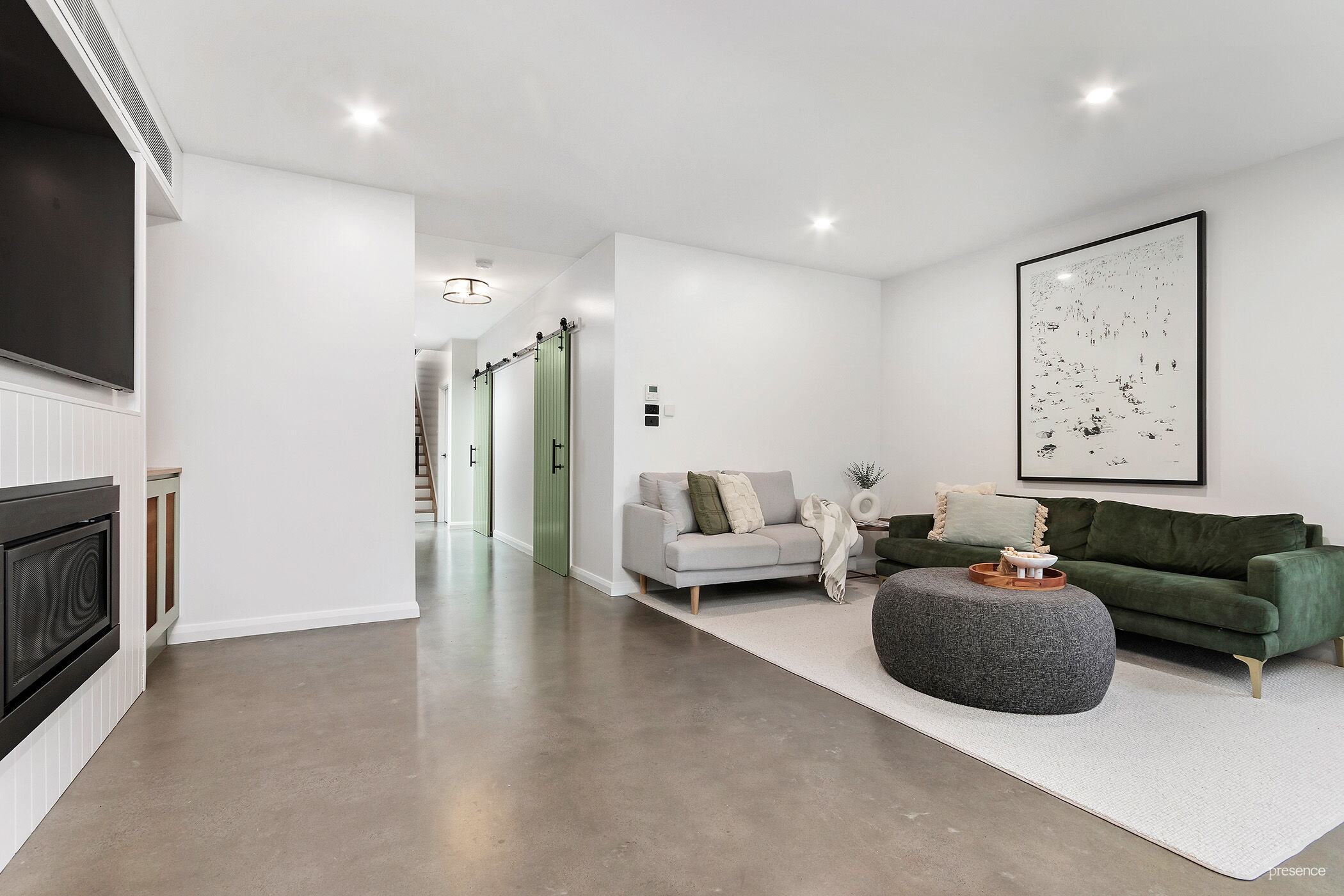 The ground floor showcases polished concrete floors with underfloor heating, statement barn doors and an open-plan kitchen, living and dining zone with bespoke cabinetry and a gas log fireplace. This level also includes a fourth bedroom, bathroom and dedicated home office. Upstairs, a hardwood staircase leads to a second living area, family bathroom, an impressive 4.5-metre bespoke office space and two additional bedrooms with built-in robes.