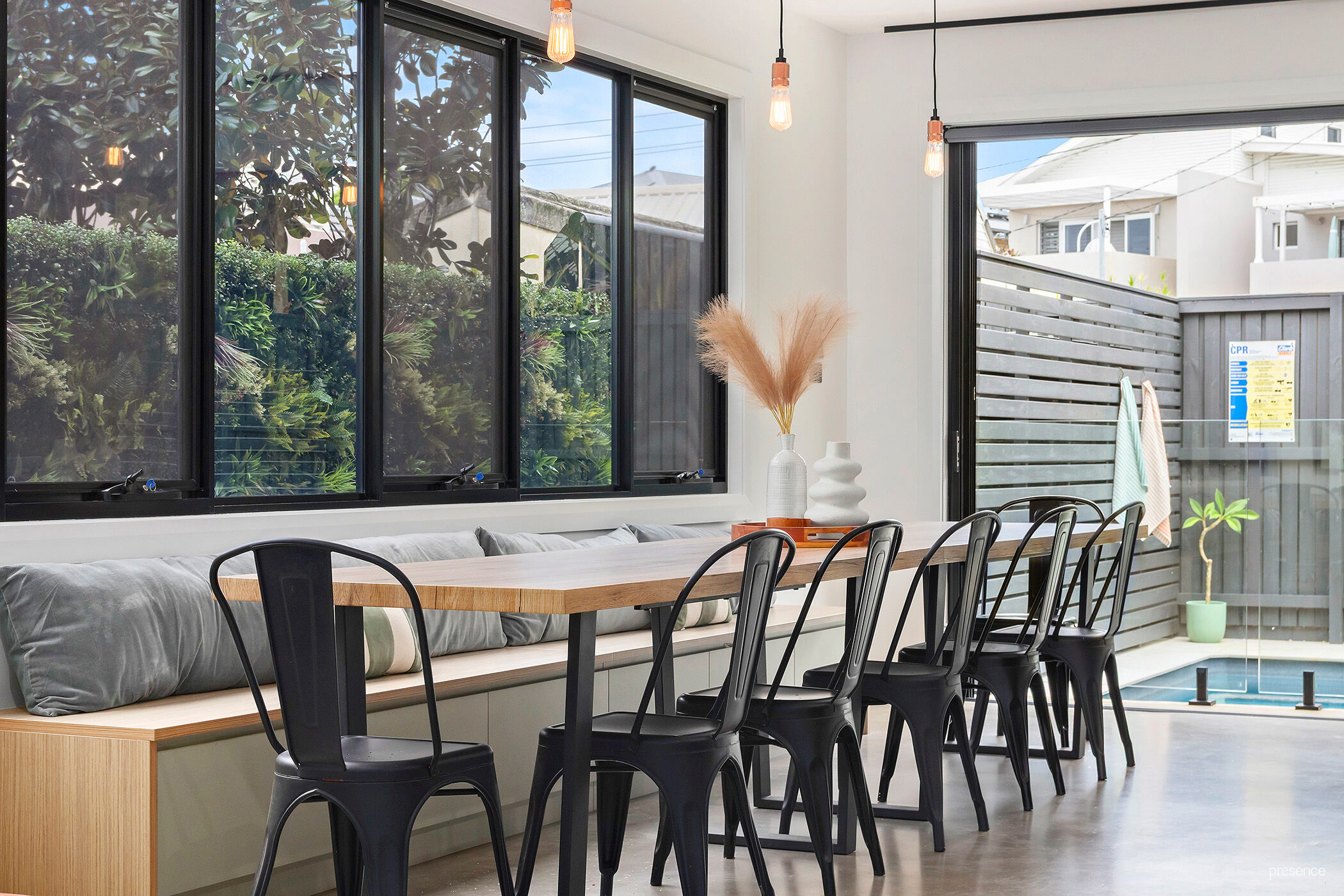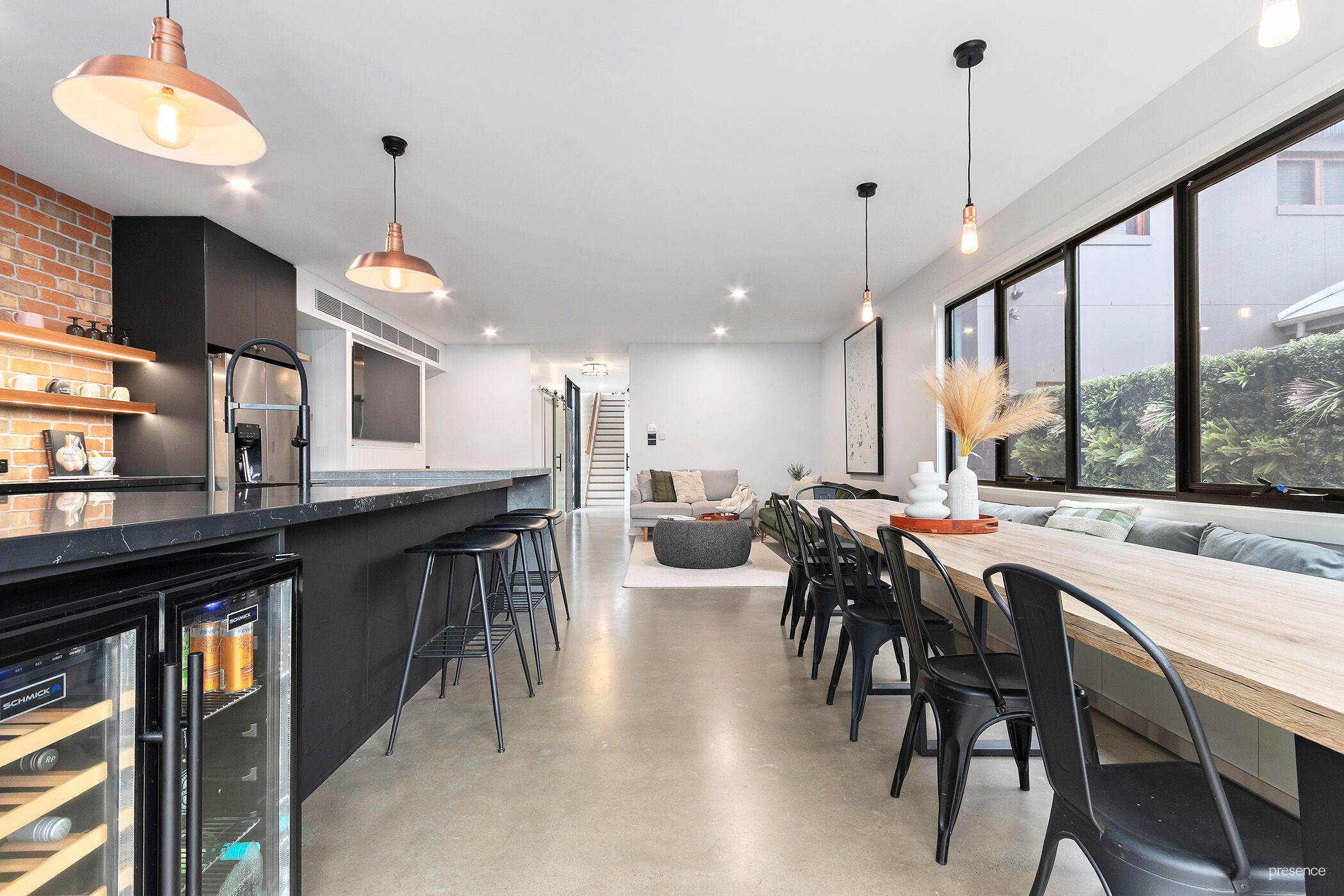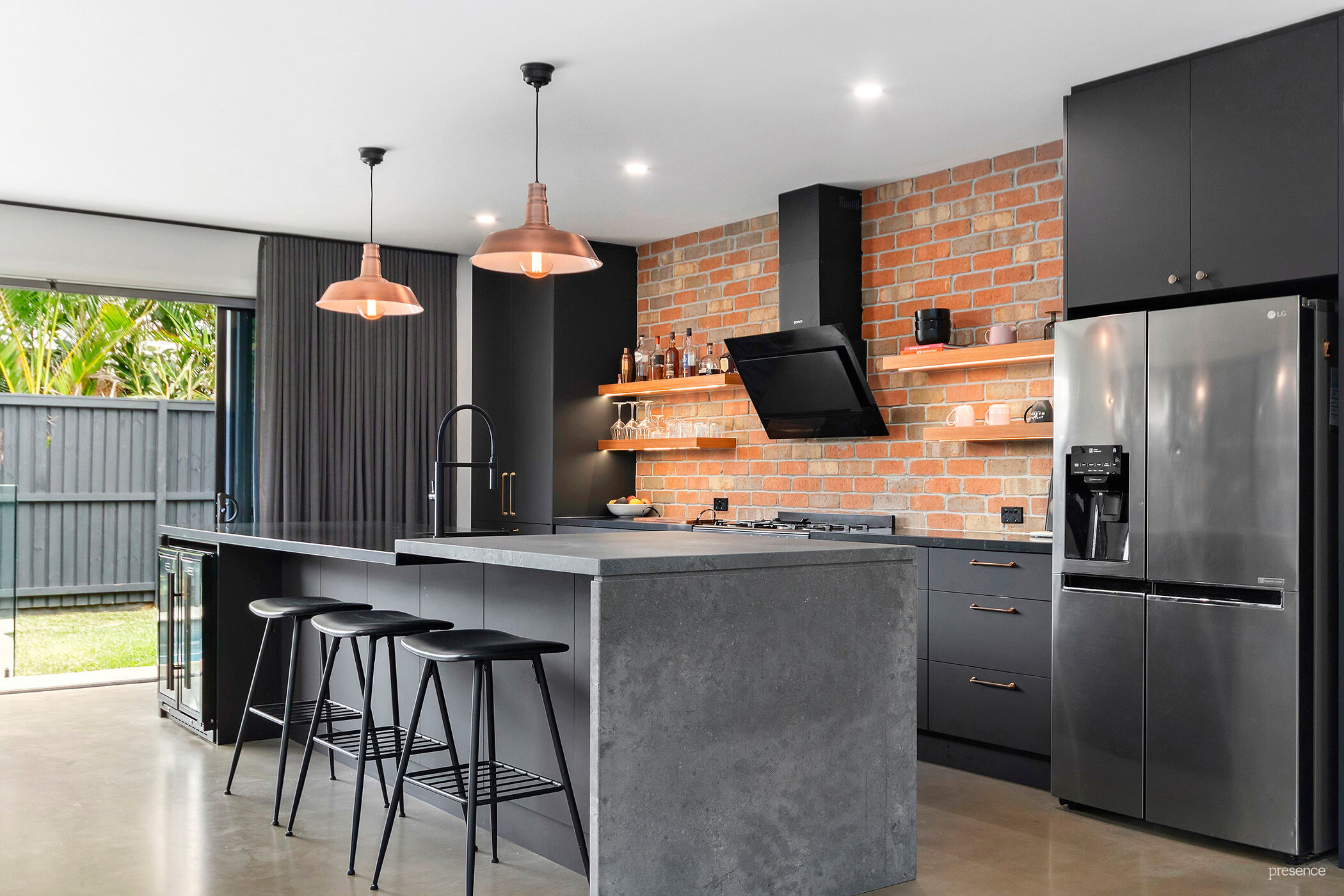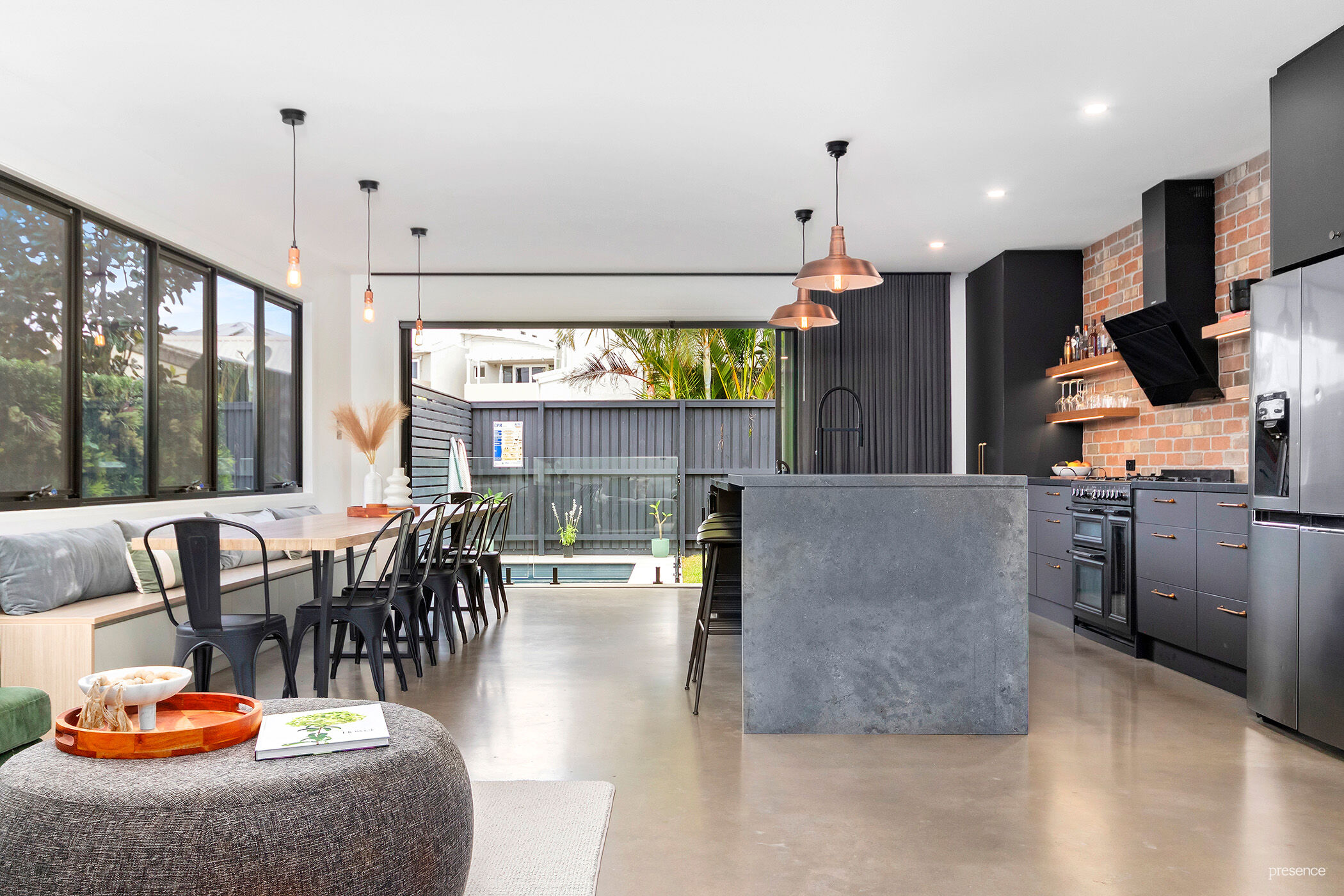 The gourmet kitchen is both striking and functional, featuring an exposed brick wall, copper sinks, matte black cabinetry, a 4-metre Caesarstone island bench and premium appliances. Stacking sliding doors open seamlessly to the swimming pool and grassed backyard, perfect for entertaining or relaxed family living.
