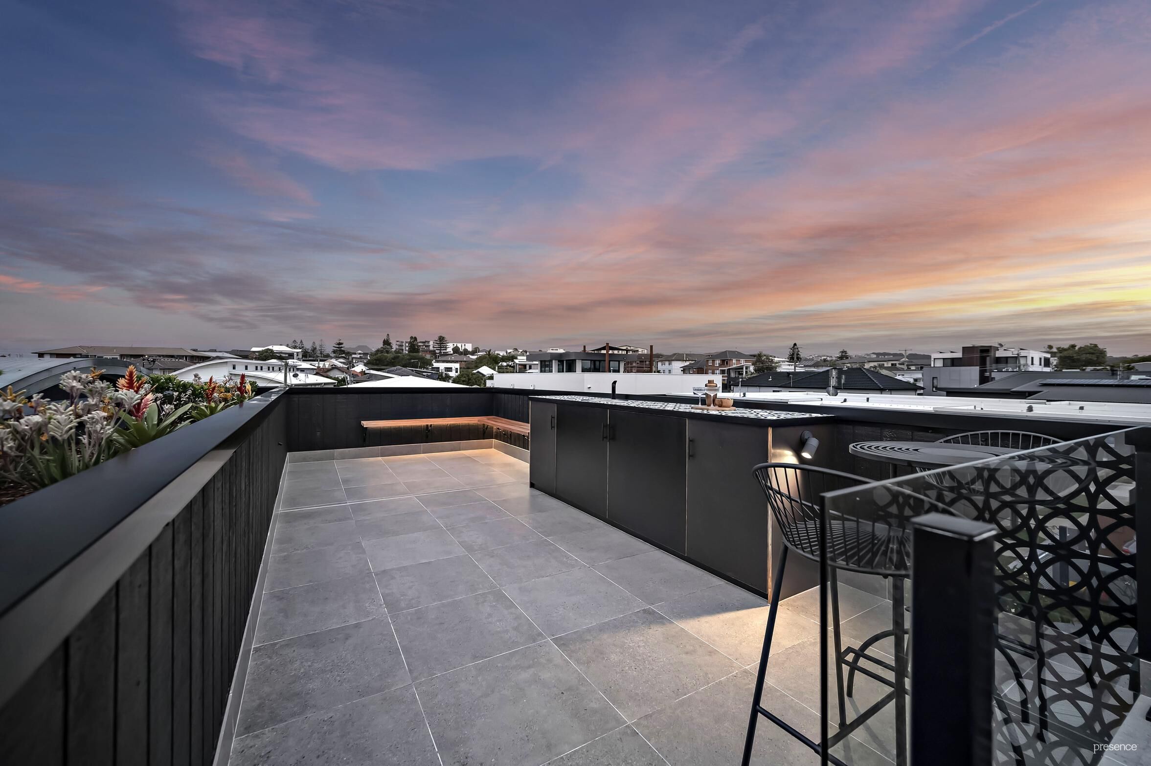 – Rooftop terrace with built-in bench seating, garden and cabinetry designed to house a bar fridge